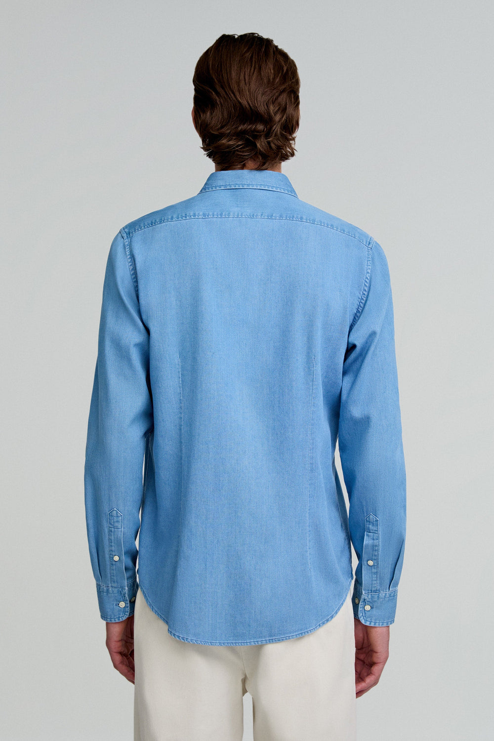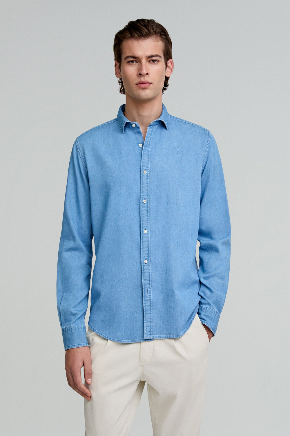 Camisa denim confeccionada en tejido 100% algodón. Corte Slim Fit, cuello italiano con ballenas y cierre con botones. Manga larga terminada en puño y detalle de calavera bordada a tono en el pecho.