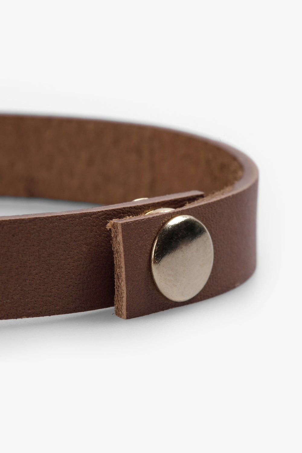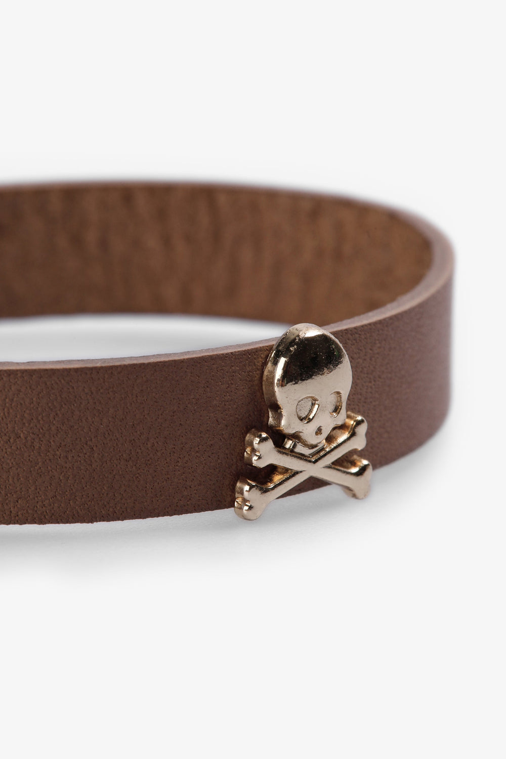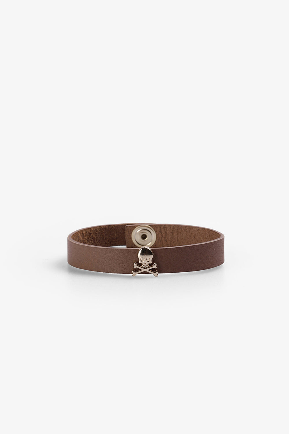 Pulsera confeccionada en piel con detalle de calaveras. Cierre con snap.