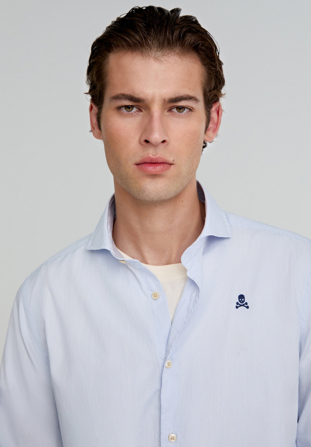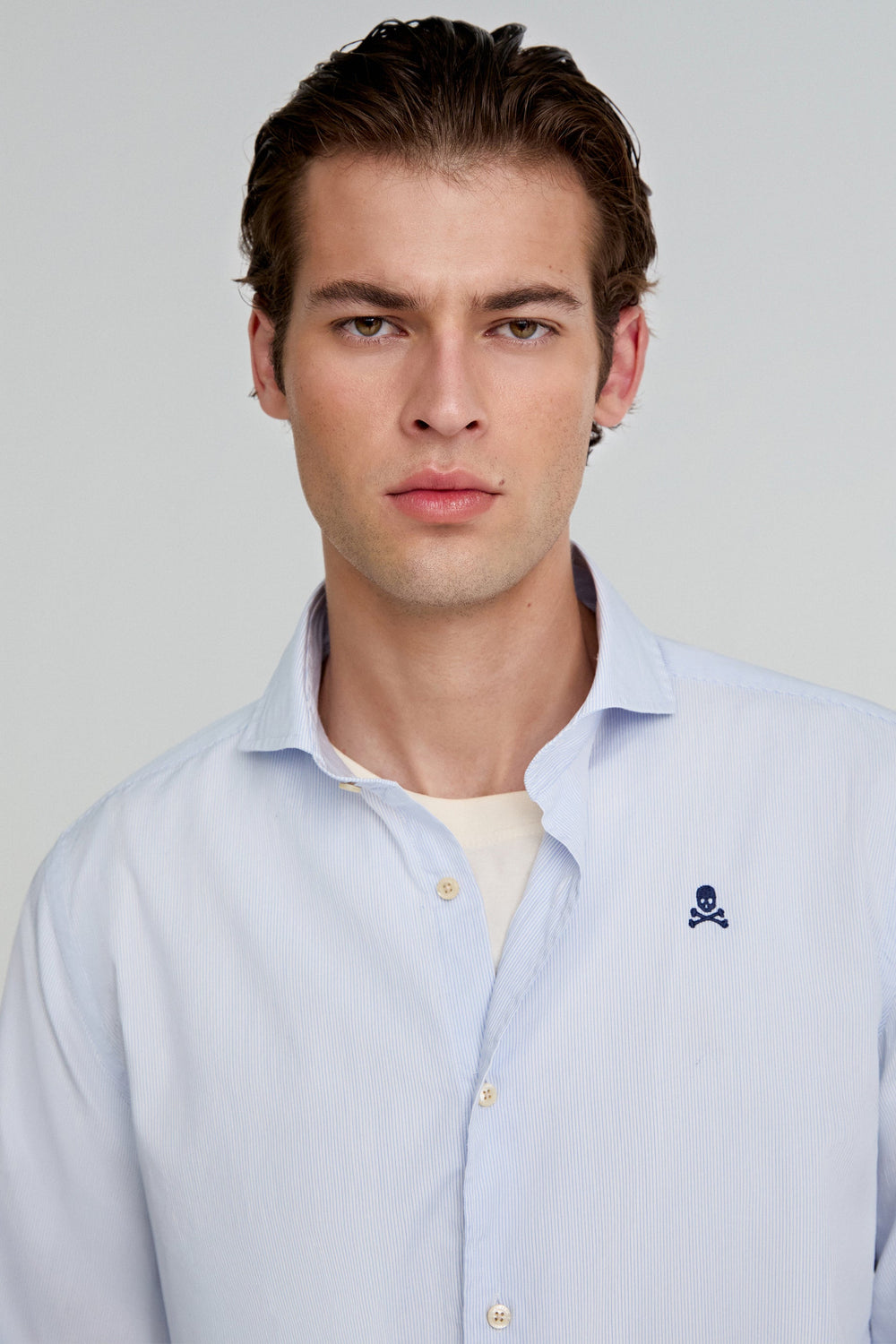 Camisa de vestir lisa. Confeccionada en tejido 100% algodón. Corte Regular Fit. Cuello cutaway. Cierre con botones. Manga larga terminada en puño simple. Detalle de calavera bordada en el pecho.