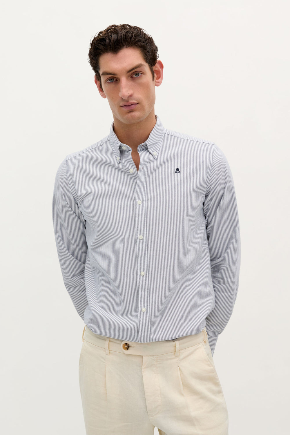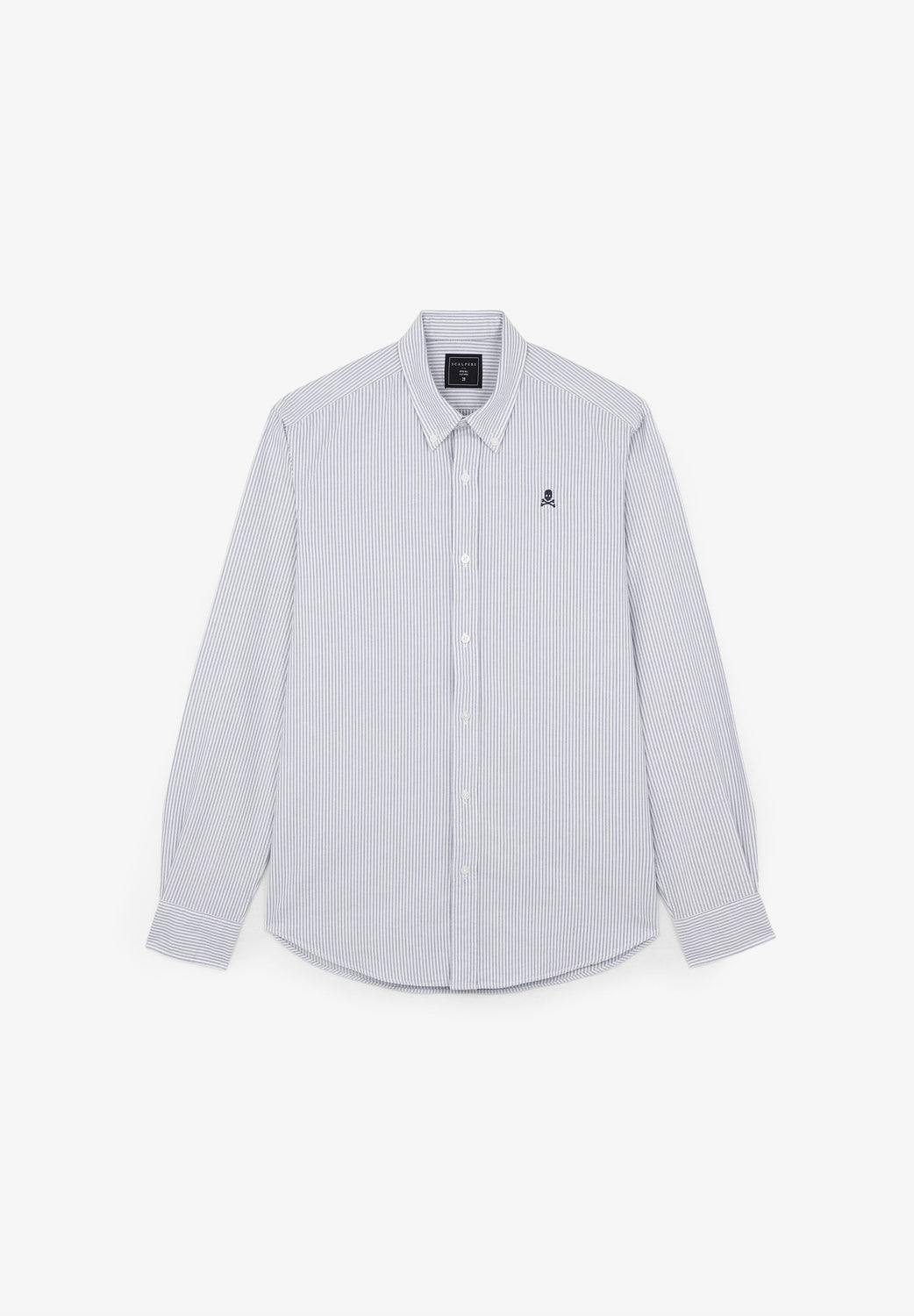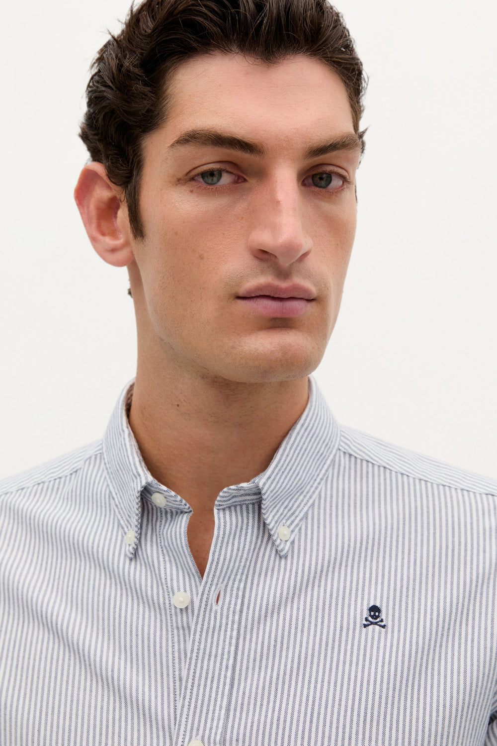 Camisa oxford de rayas con calavera a contraste. Confeccionada en 100% algodón. Corte Regular Fit. Cuello con botones. Cierre con botones. Manga larga terminada en puño simple