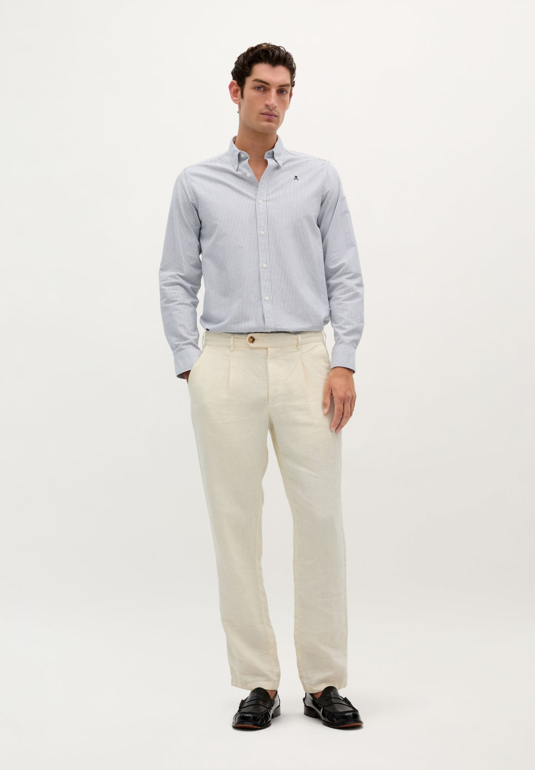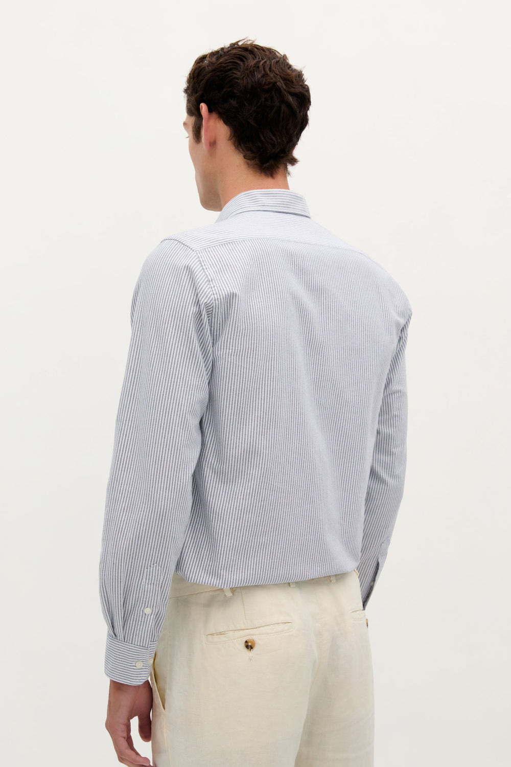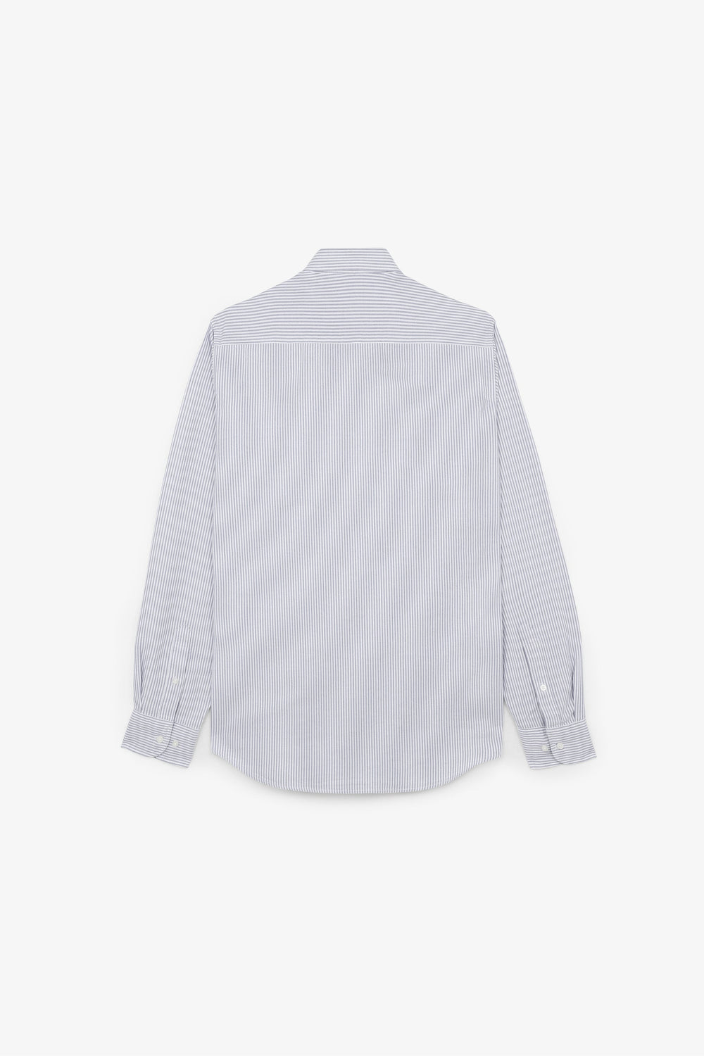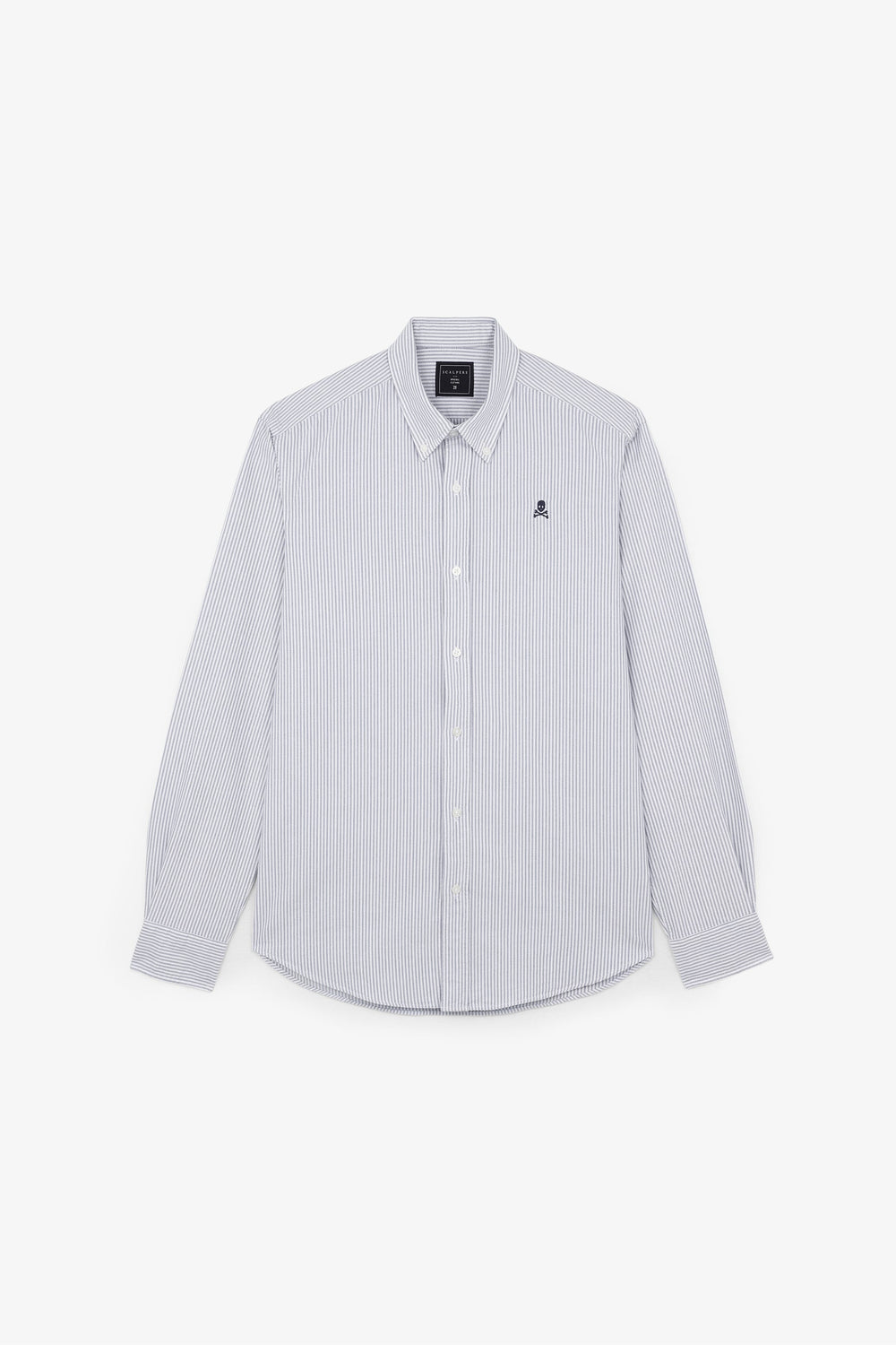 Camisa oxford de rayas con calavera a contraste. Confeccionada en 100% algodón. Corte Regular Fit. Cuello con botones. Cierre con botones. Manga larga terminada en puño simple