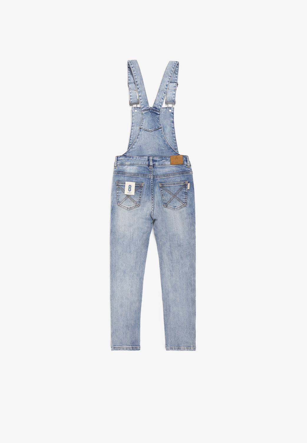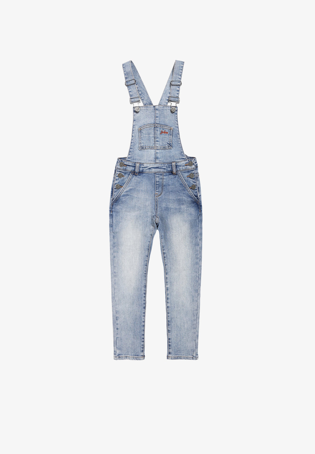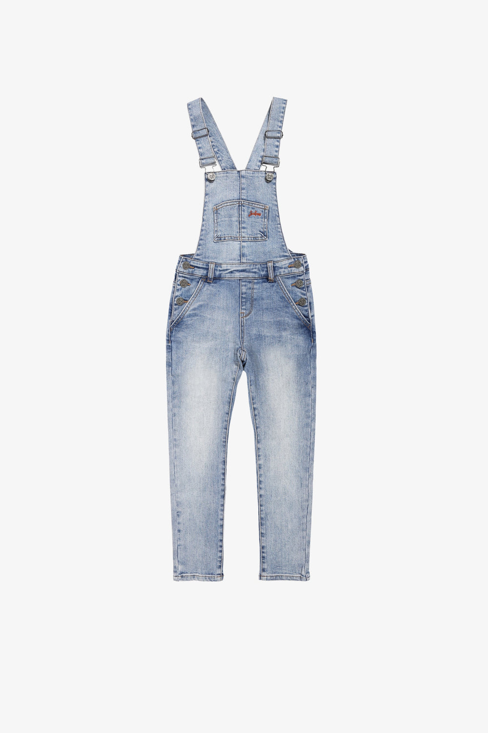 Denim dungarees. Slim fit and skinny legs. Fastens with personalised buttons at sides and adjustable straps. Two side pockets and one at the front with embroidered logo detail.