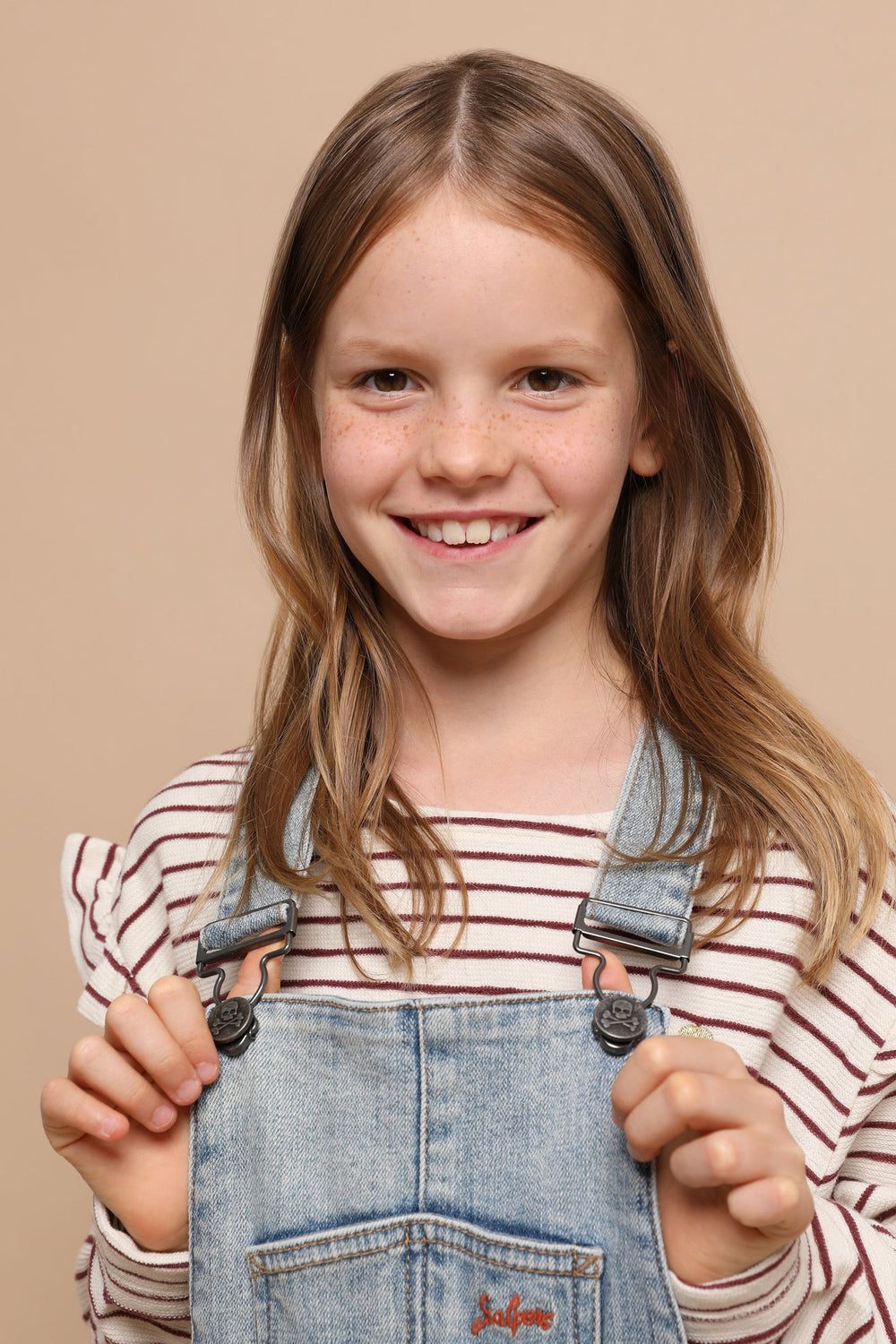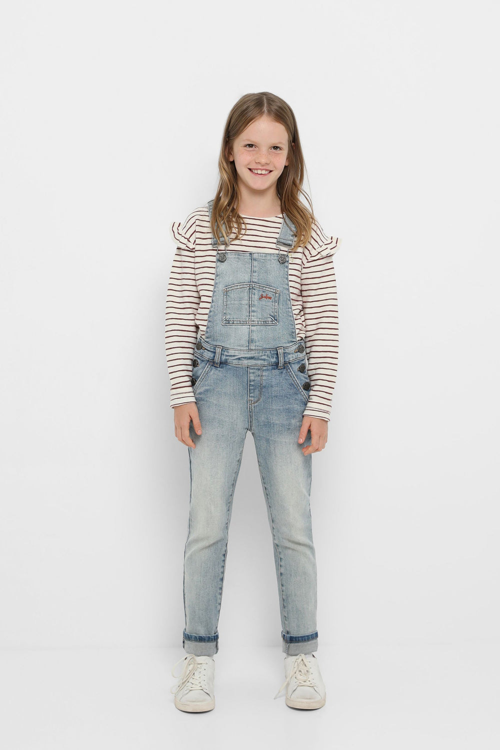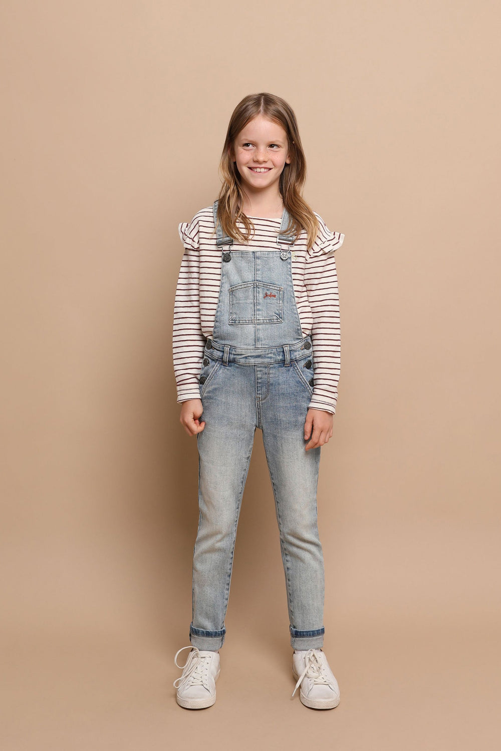 Denim dungarees. Slim fit and skinny legs. Fastens with personalised buttons at sides and adjustable straps. Two side pockets and one at the front with embroidered logo detail.