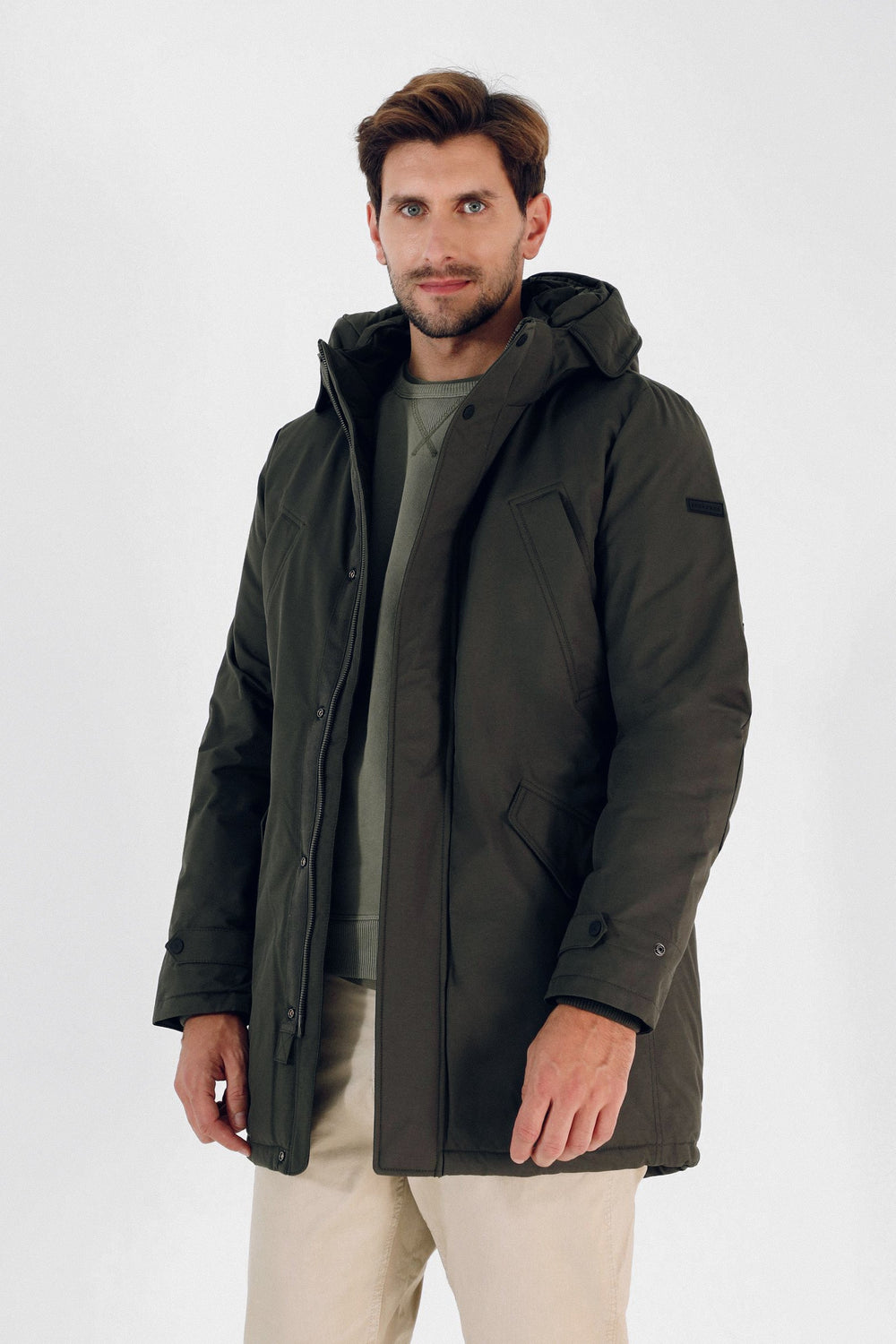 Parka made of blended cotton. Regular fit, collar with detachable zipped hood and double slider zip and snap button fastening. Long sleeves with ribbed cuffs and snap buttons. Pockets with zips and flaps and an inner pocket.