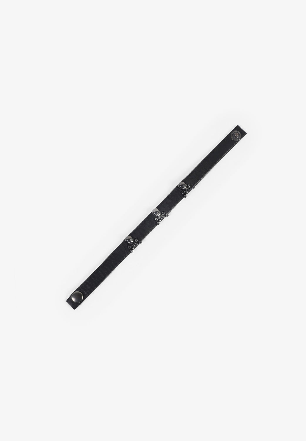 Pulsera confeccionada en piel con detalle de calaveras. Cierre con snap.