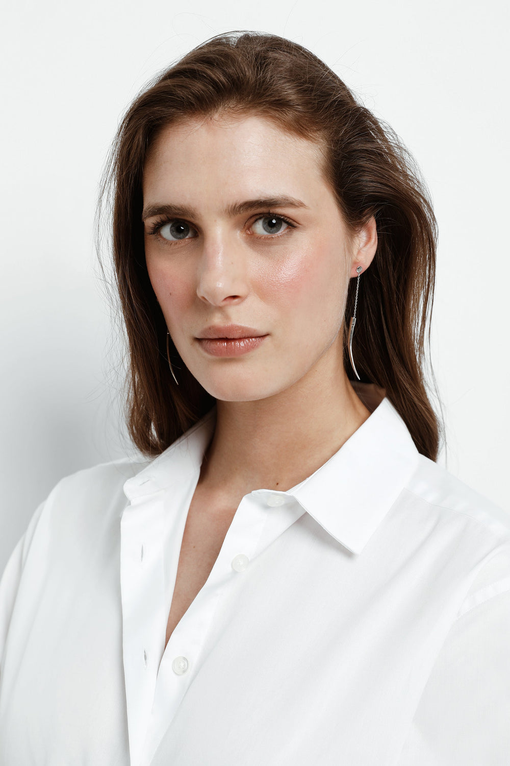 Long earrings with chain finishing in a horn shape in silver plated brass. Push-back fastening. The size is 7cm.