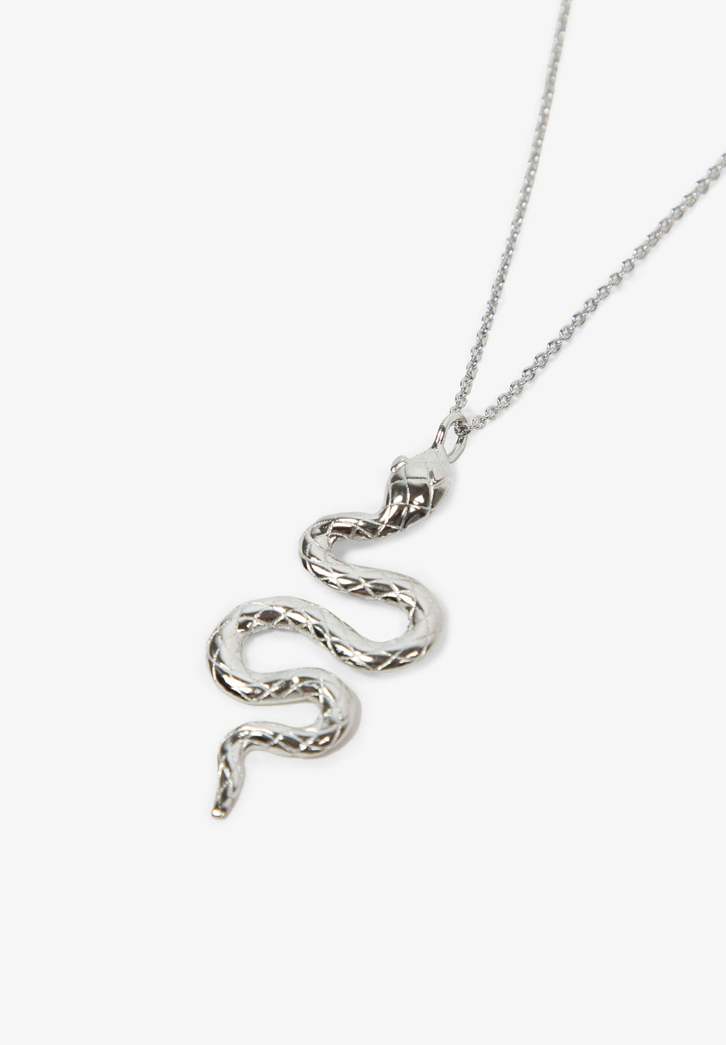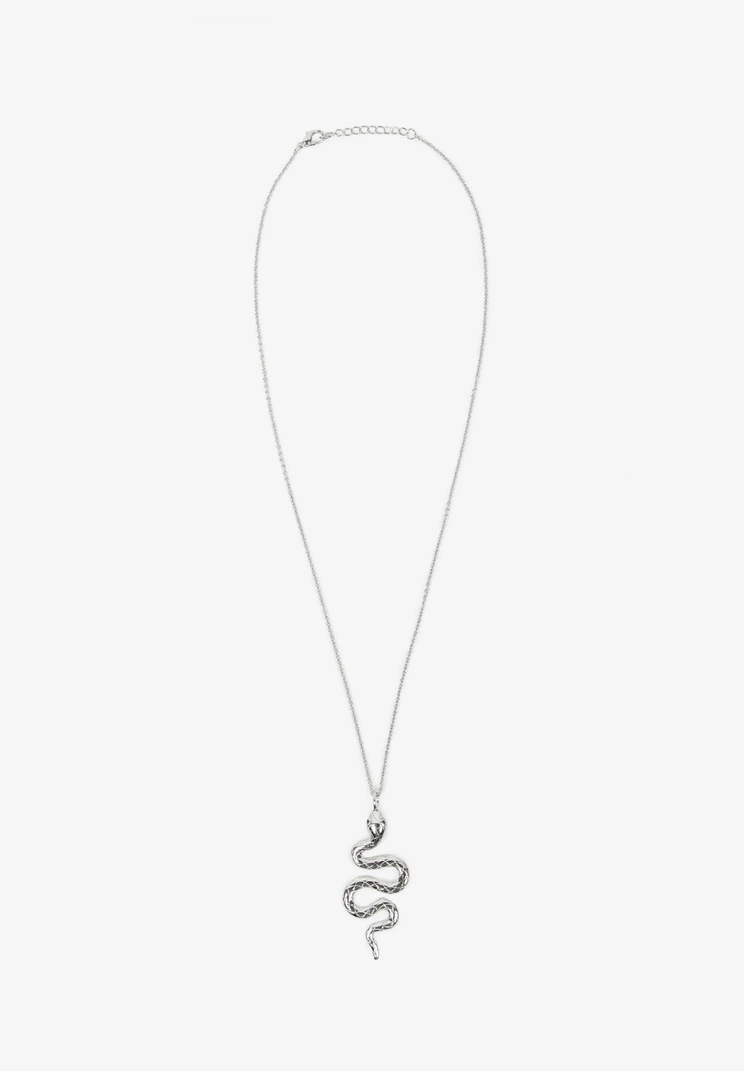 Chain necklace with snake pendant in silver plated brass. Chain and pendant with lobster clasp fastening. Chain measures 45 cm + adjustable 3 cm and pendant measure 4.3 cm.