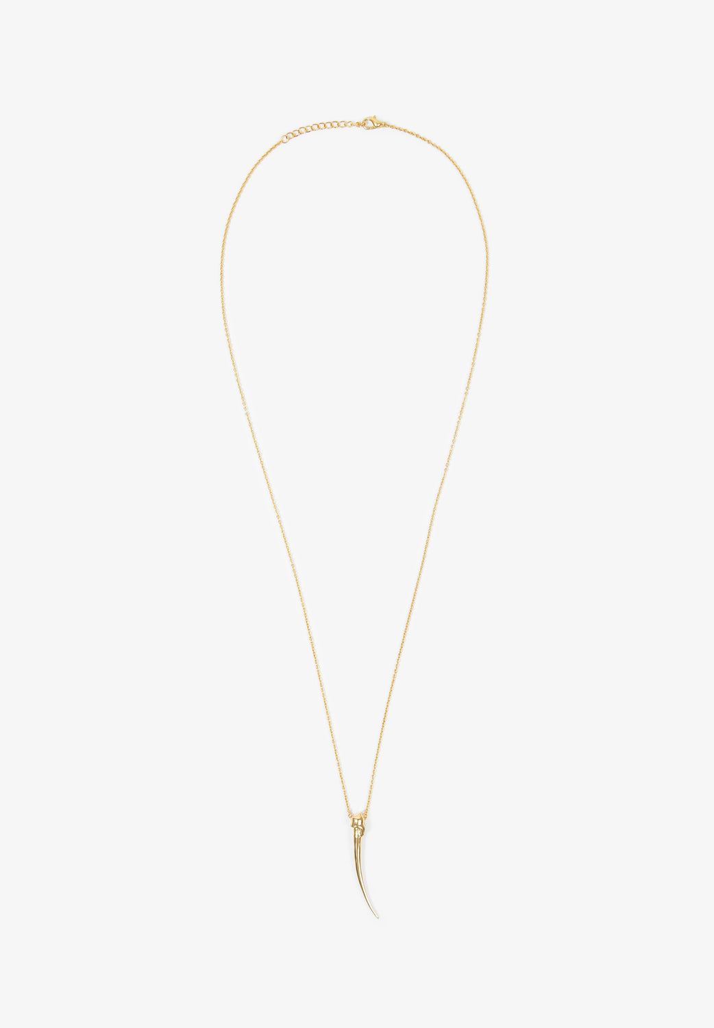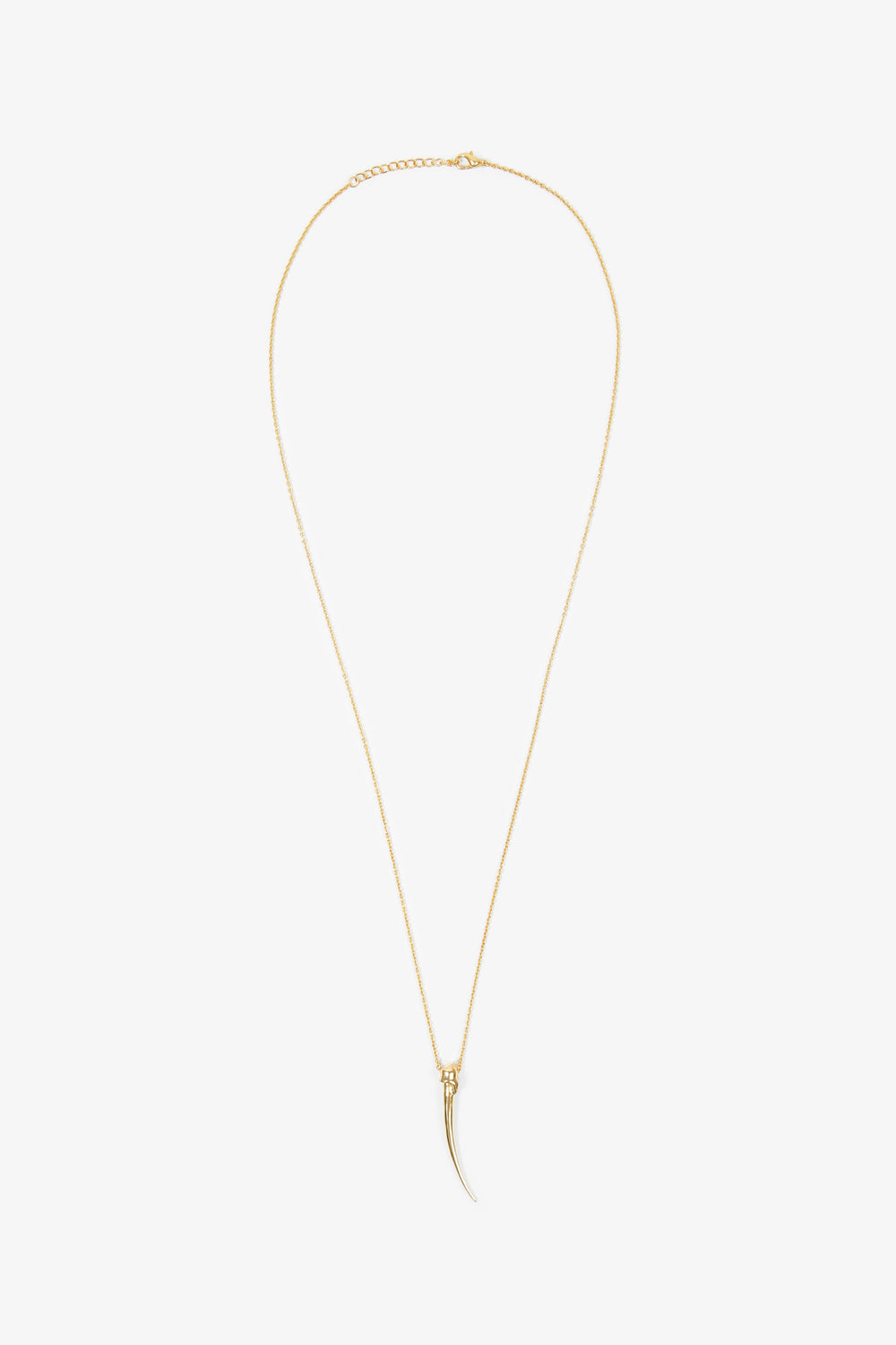 Long necklace with horn shape pendant in 18k gold plated brass. Chain and pendant with lobster clasp fastening. Chain measures 60 cm + adjustable 5 cm.