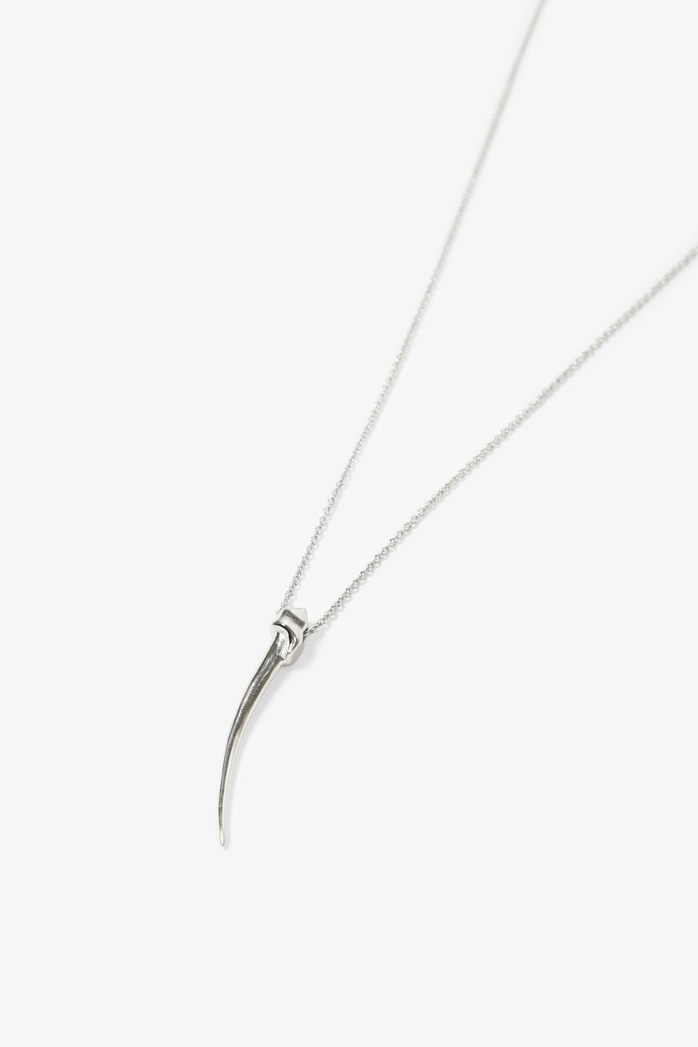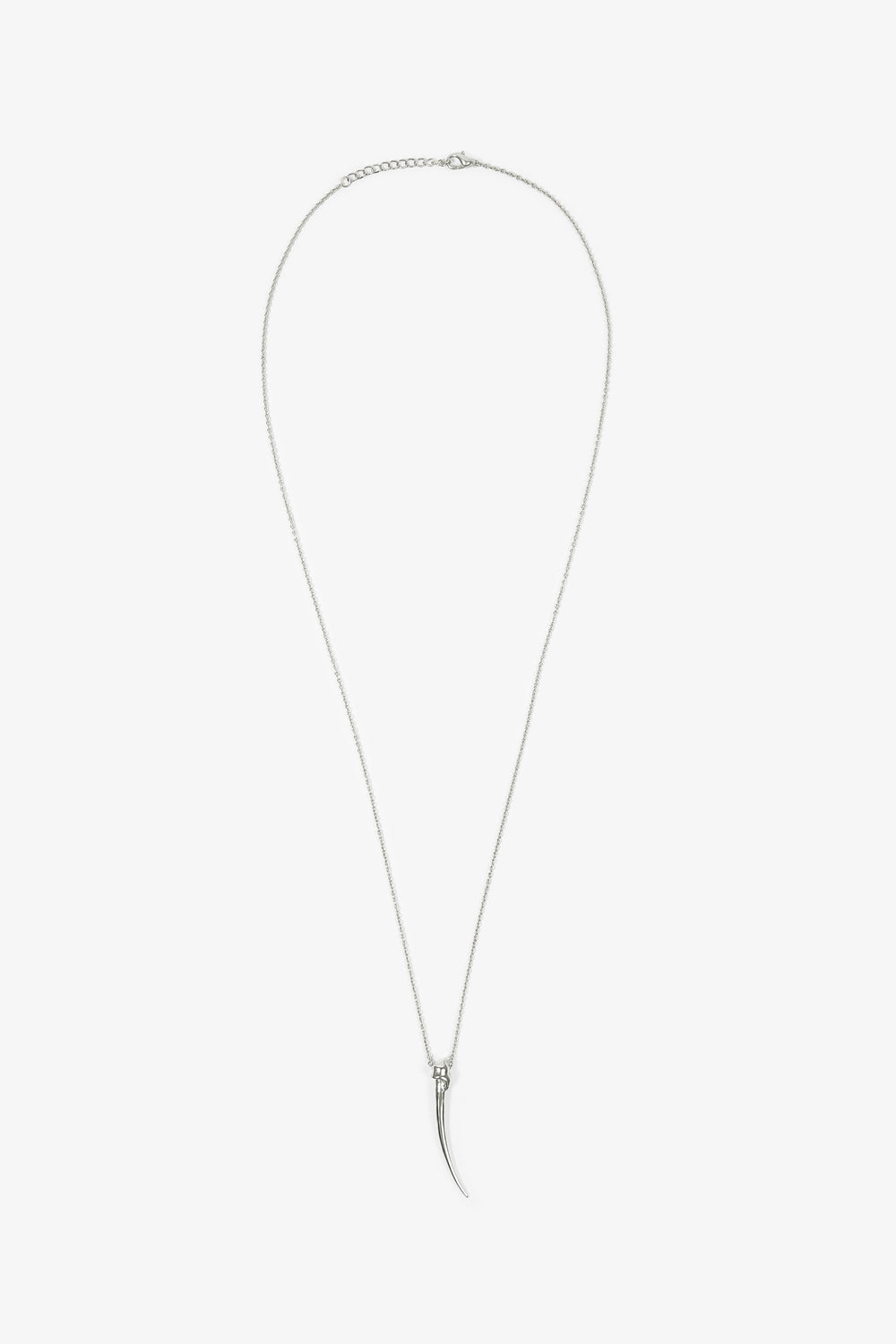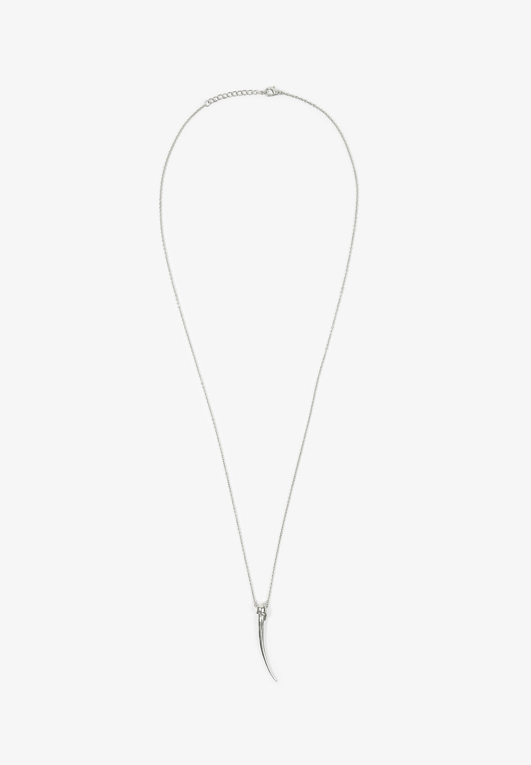 Long necklace with horn pendant in silver plated brass. Chain and pendant with lobster clasp fastening. Chain measures 60 cm + adjustable 5 cm.