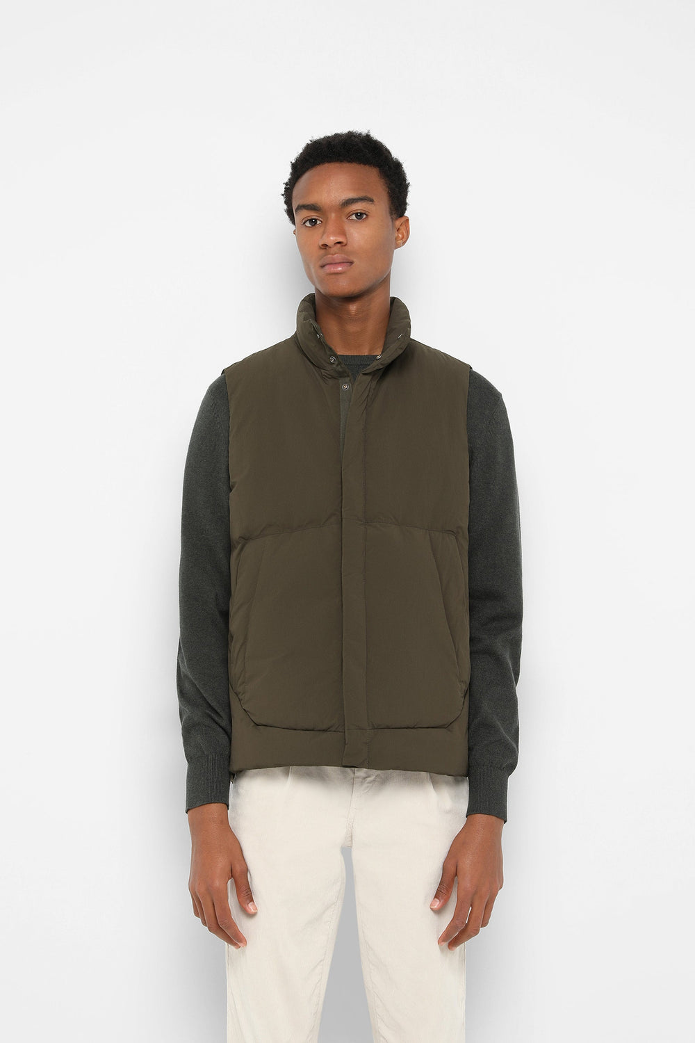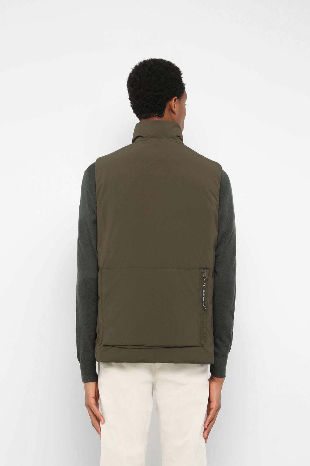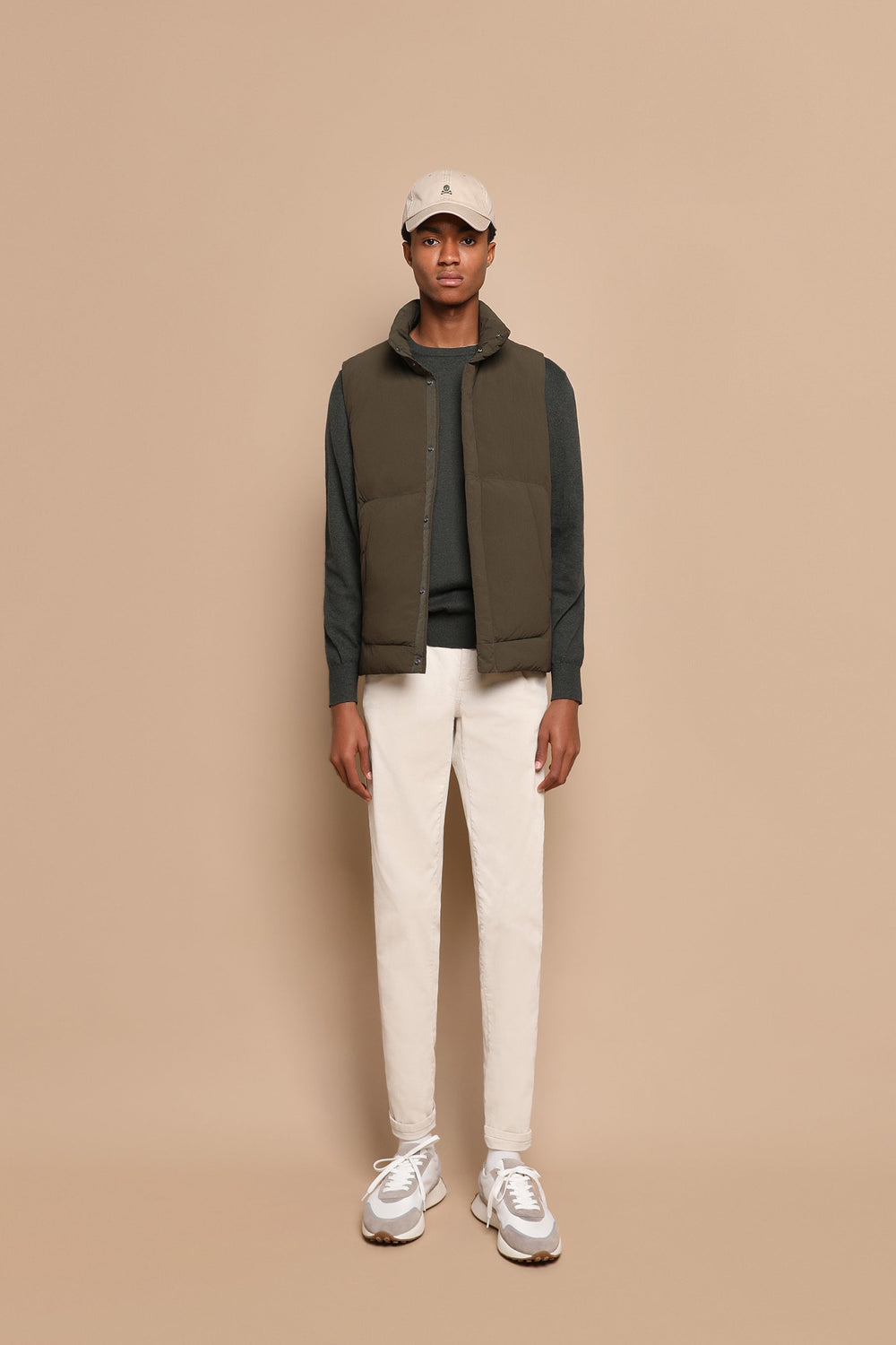 Nylon water-repellent puffer vest with recycled polyester filling. Regular fit, high collar and snap button fastening. Side and back pockets with zip pocket.