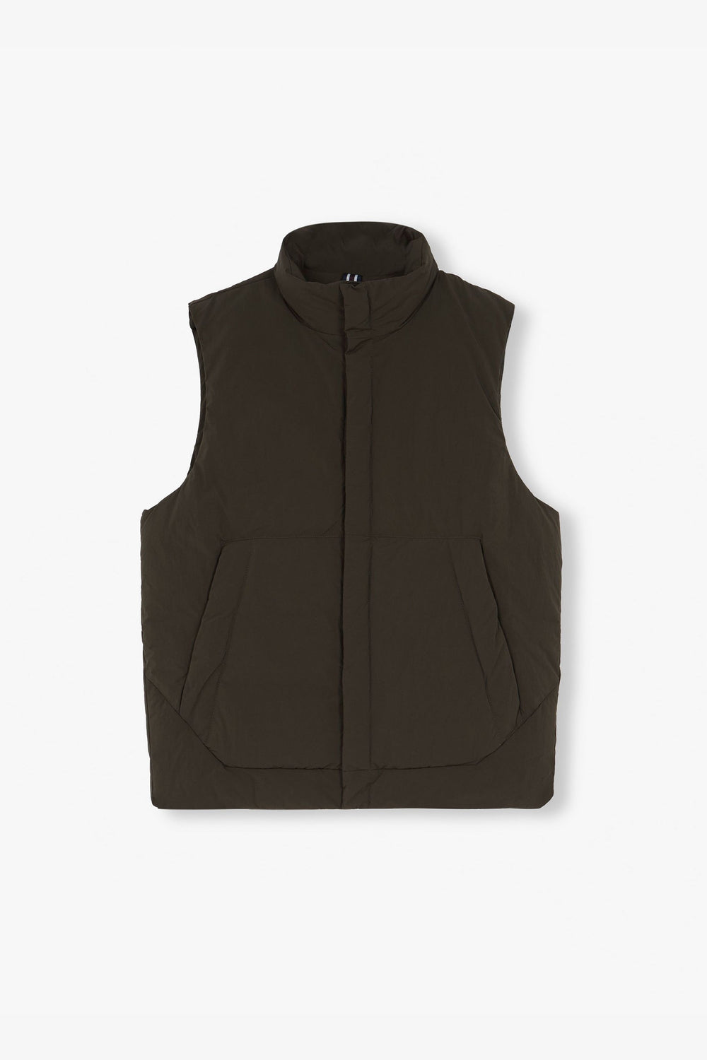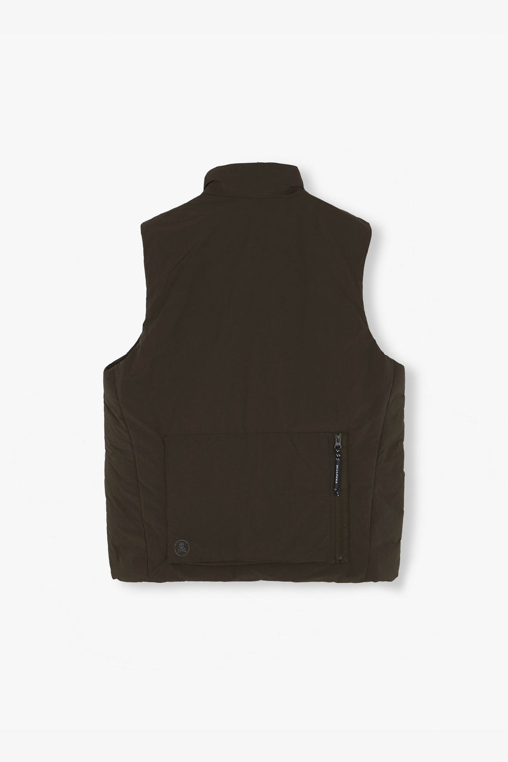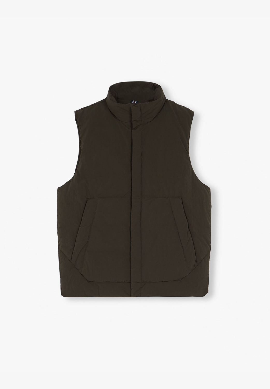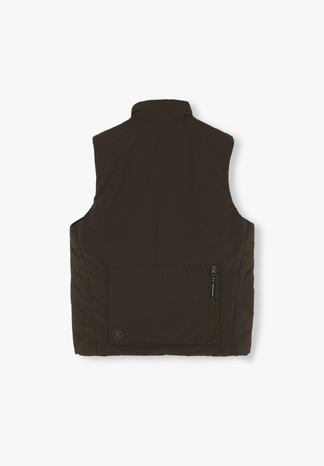 Nylon water-repellent puffer vest with recycled polyester filling. Regular fit, high collar and snap button fastening. Side and back pockets with zip pocket.