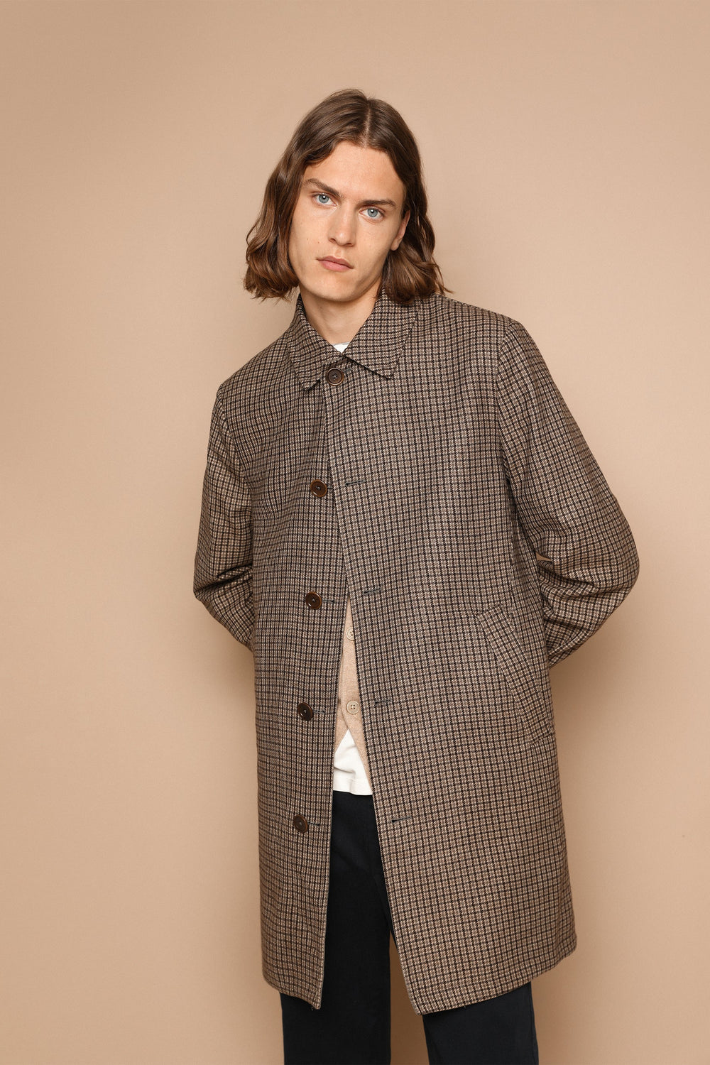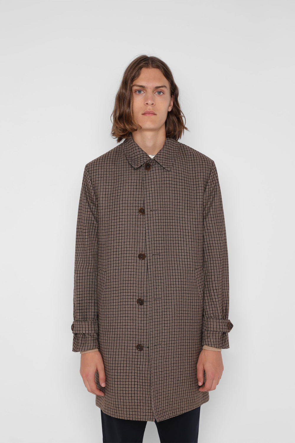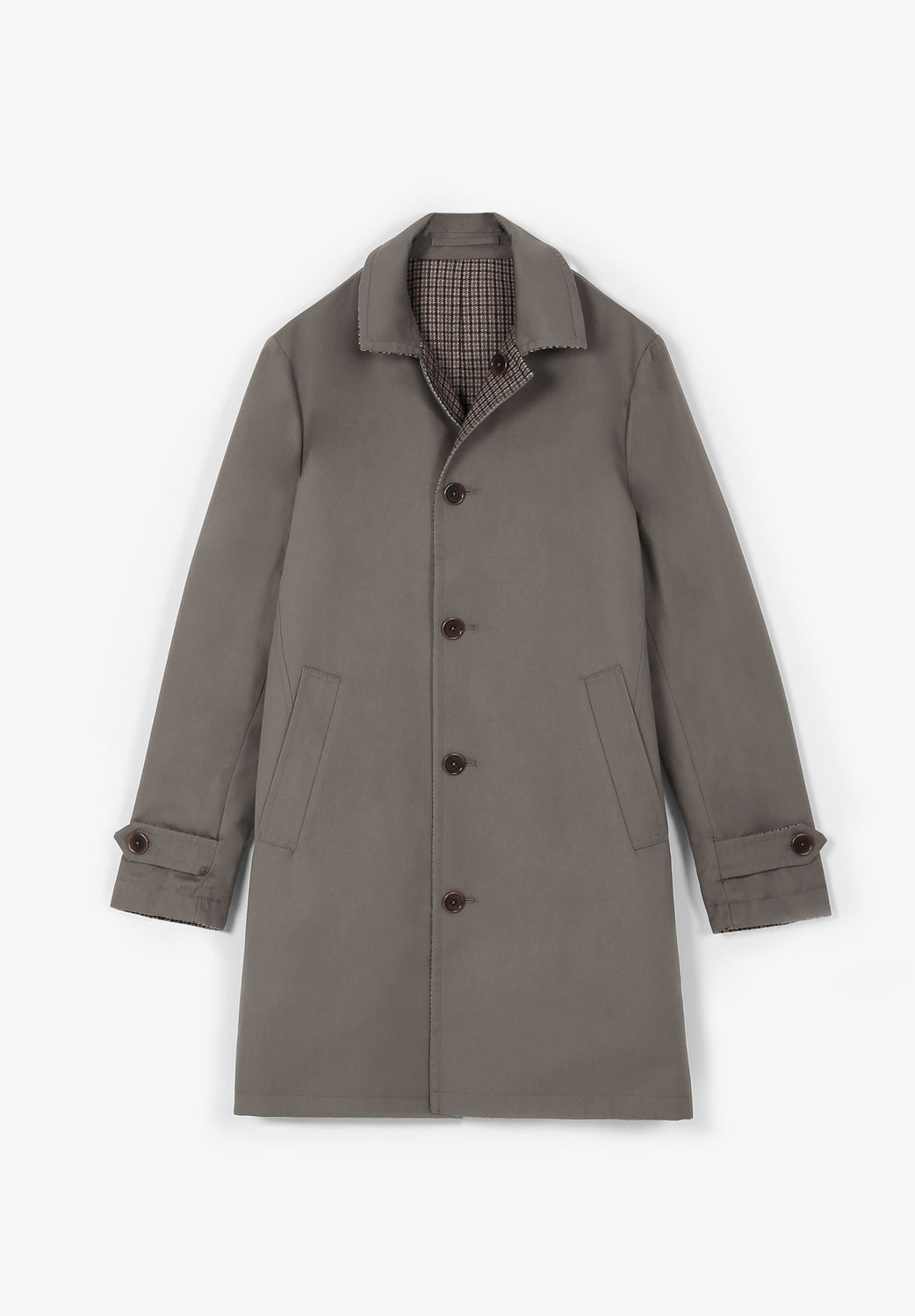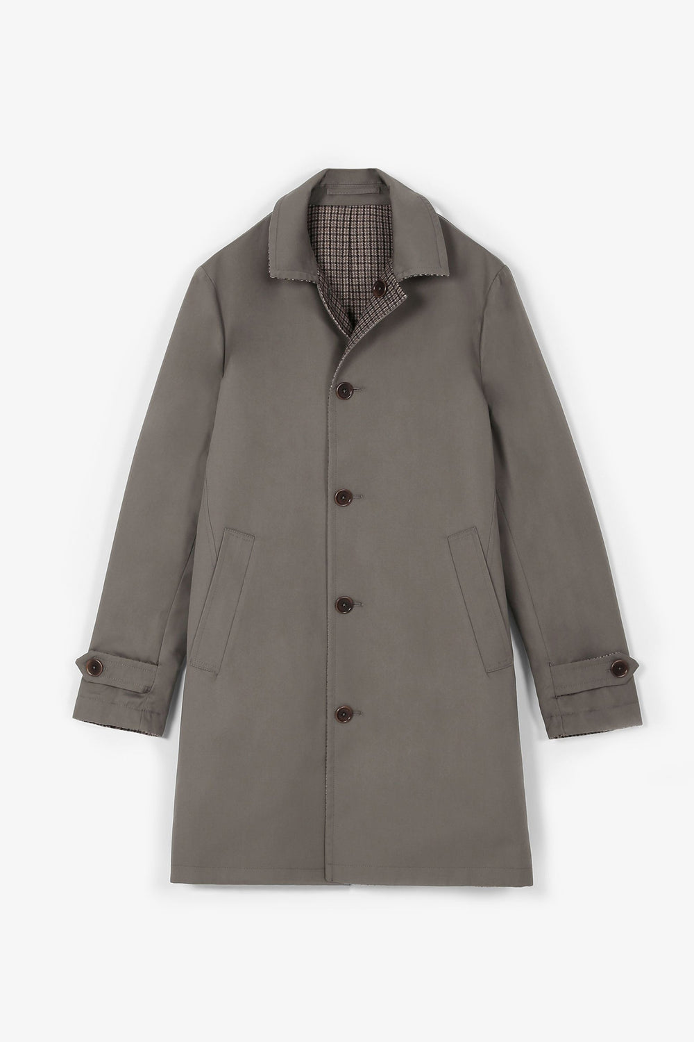 Reversible checked trench coat made of cloth on one side and water repellent fabric on the other. Regular fit, classic collar and button fastening.