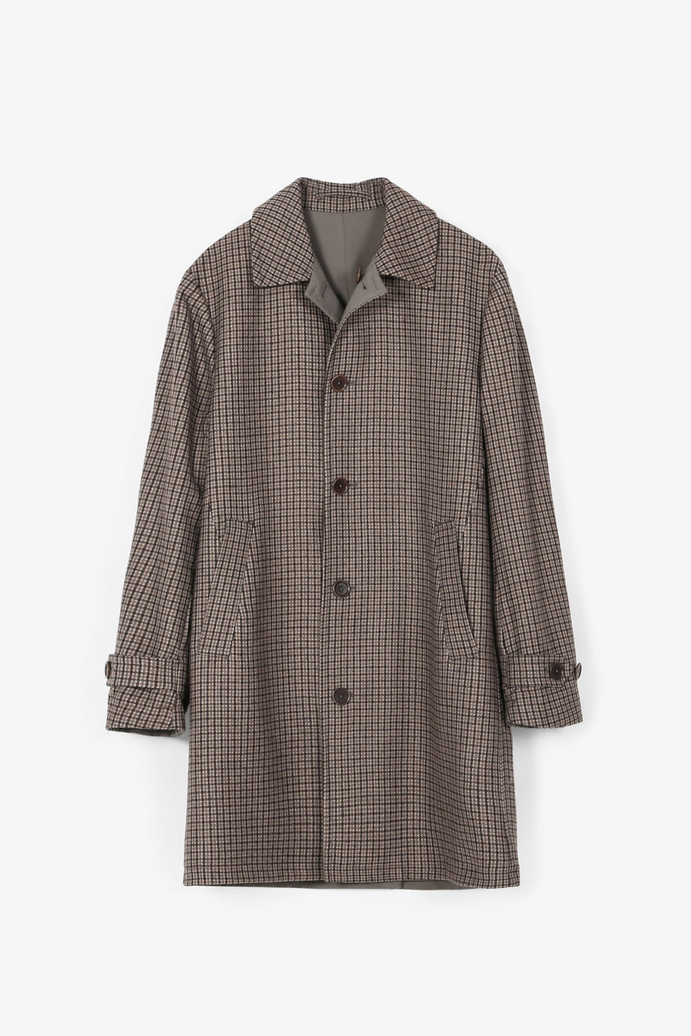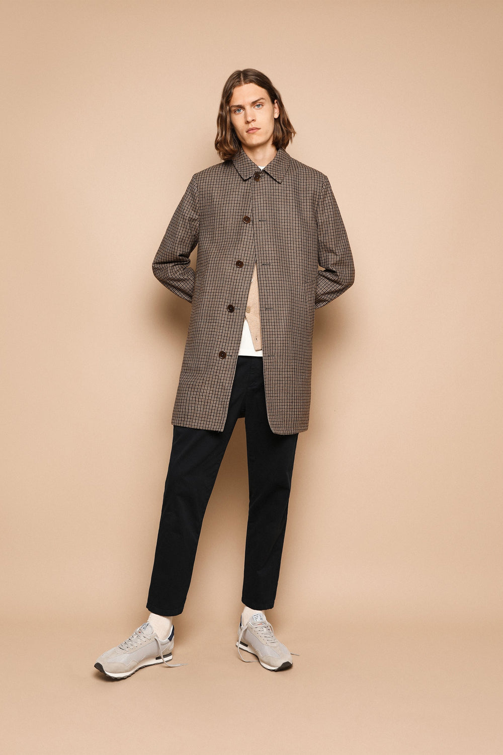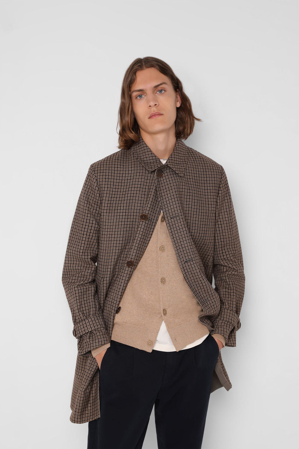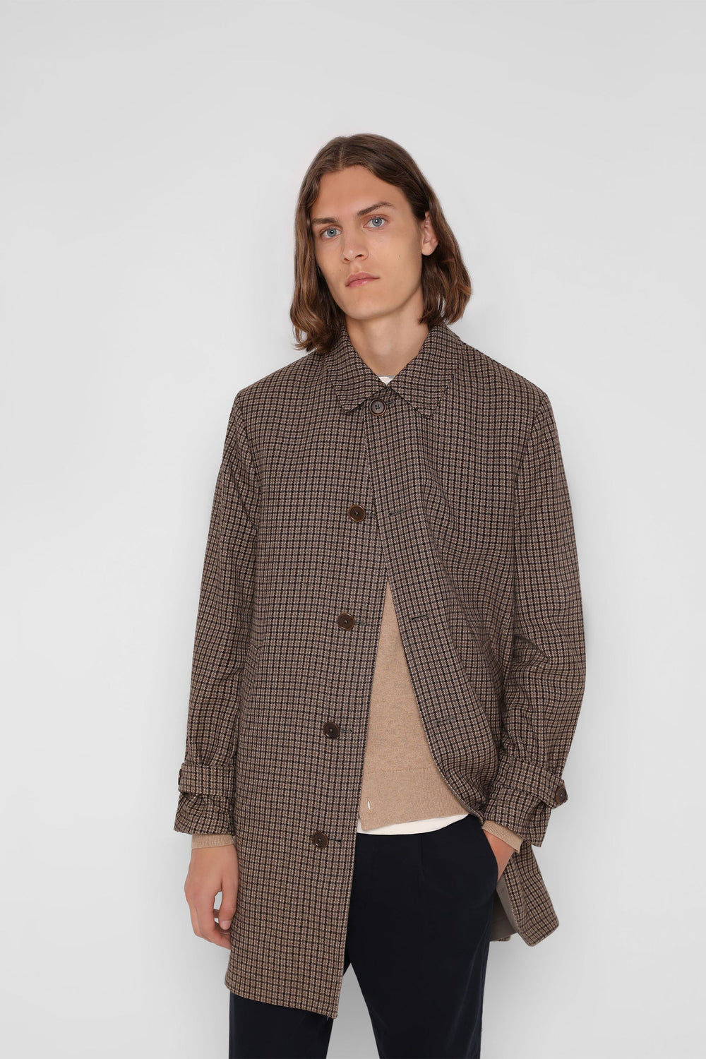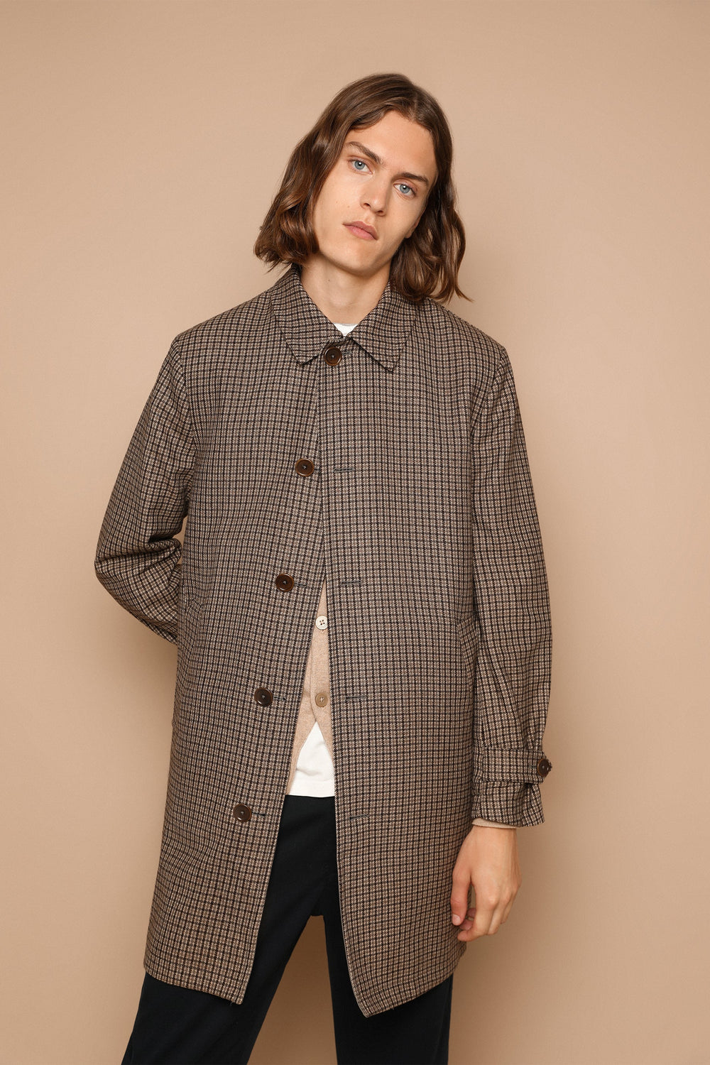 Reversible checked trench coat made of cloth on one side and water repellent fabric on the other. Regular fit, classic collar and button fastening.
