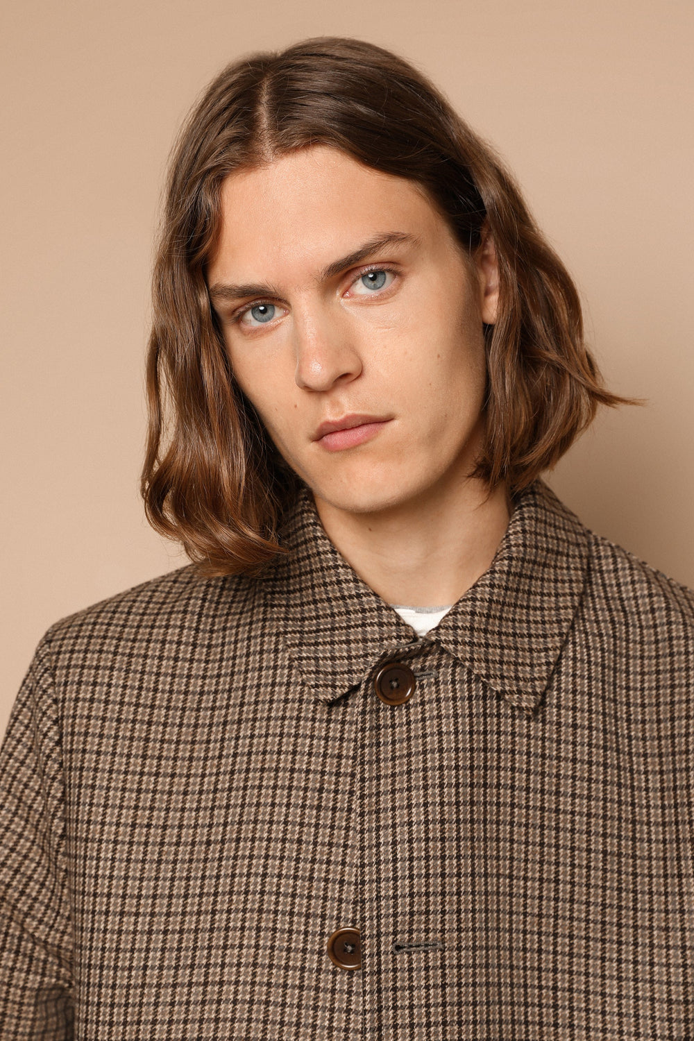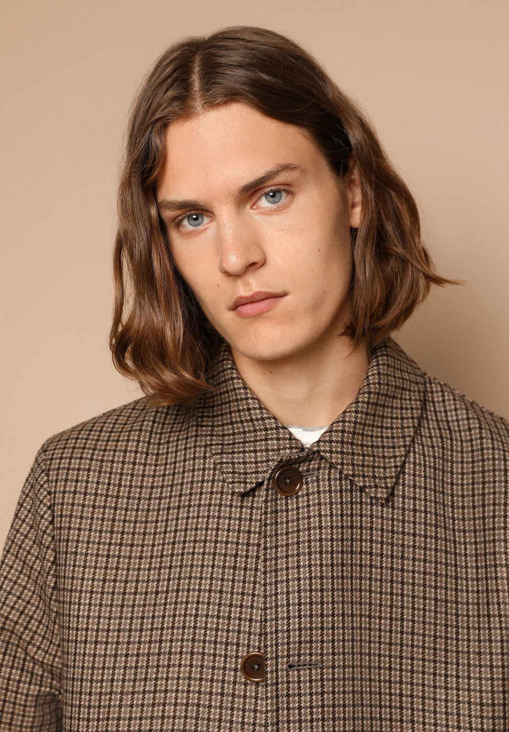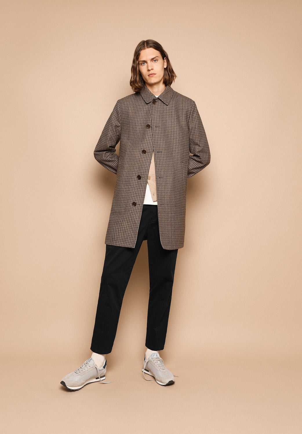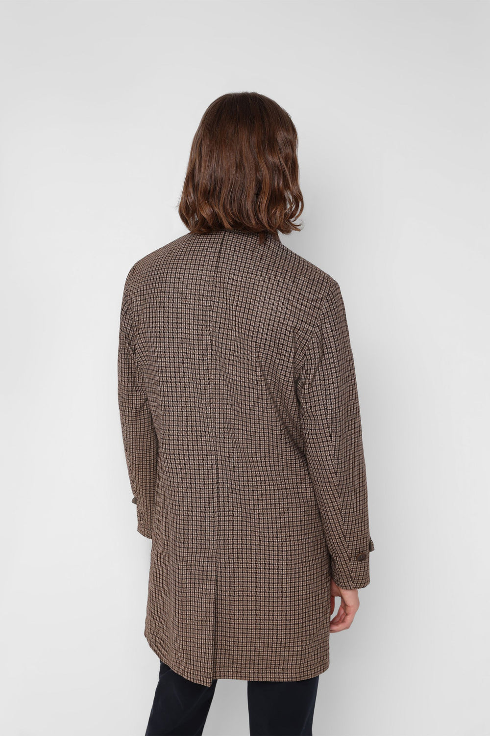 Reversible checked trench coat made of cloth on one side and water repellent fabric on the other. Regular fit, classic collar and button fastening.