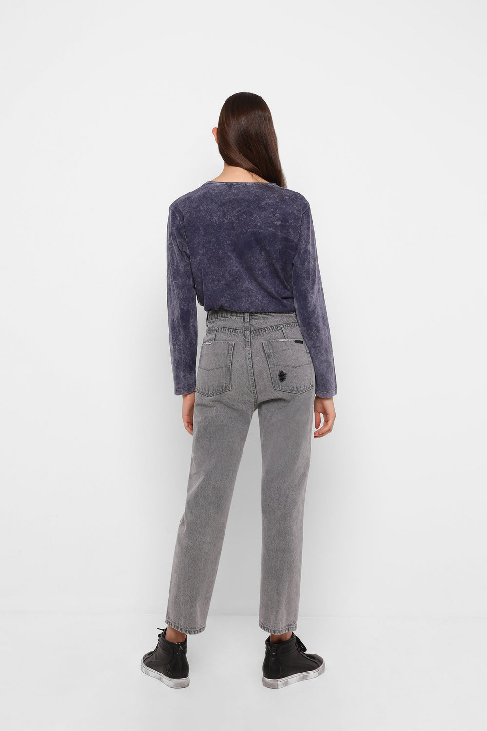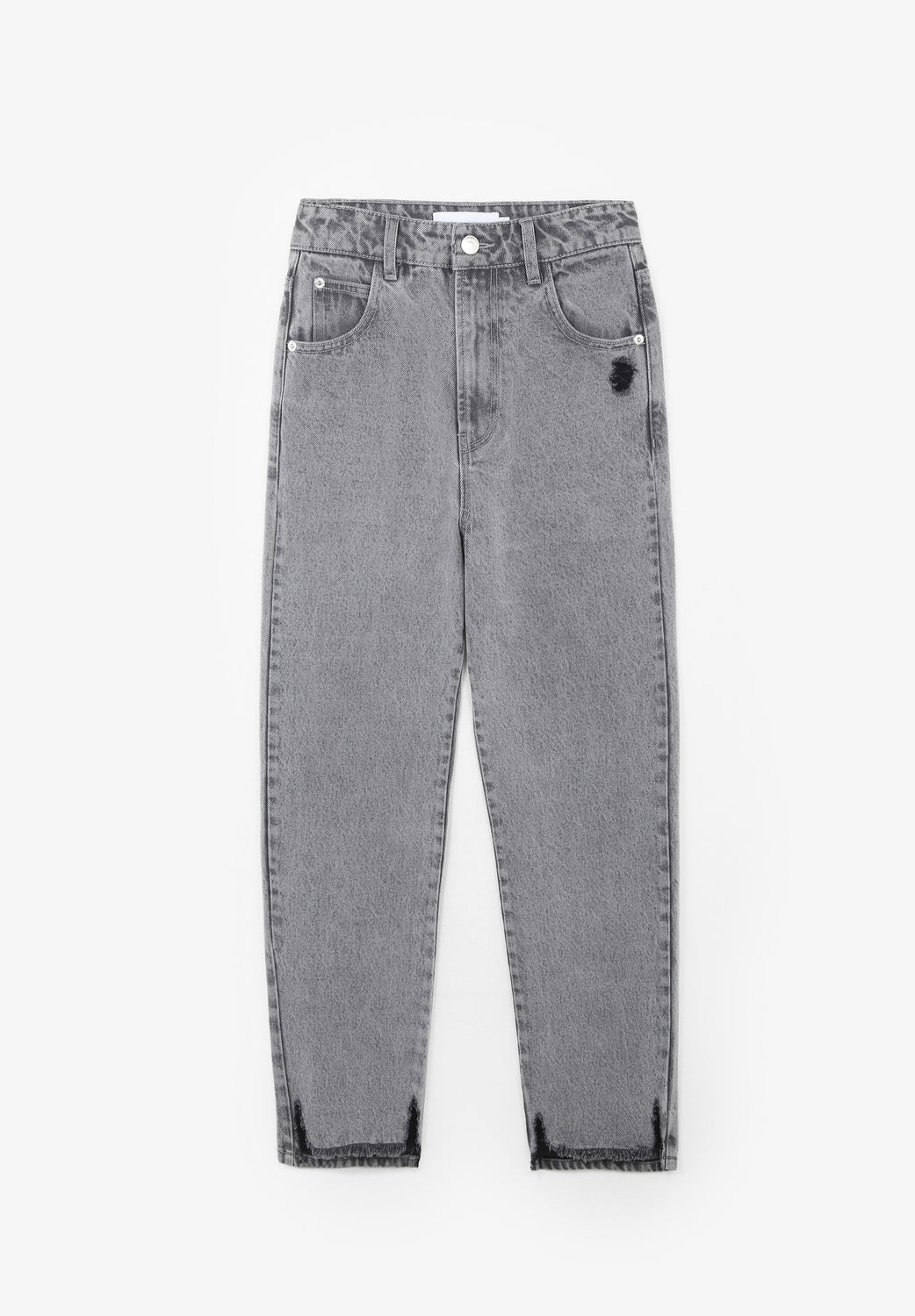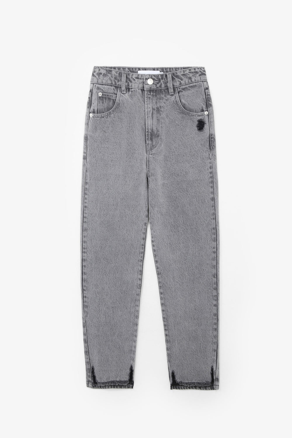 Straight fit jeans in slightly stretchy cotton blend. Regular fit with high waist. Button and zip fastening. Front and back pockets. Belt loops at waist. Frayed hems.