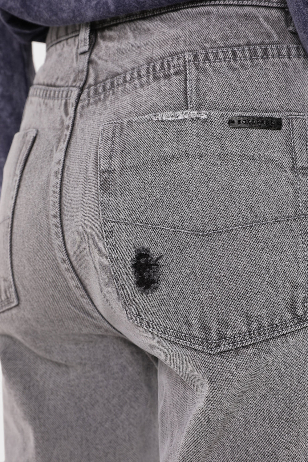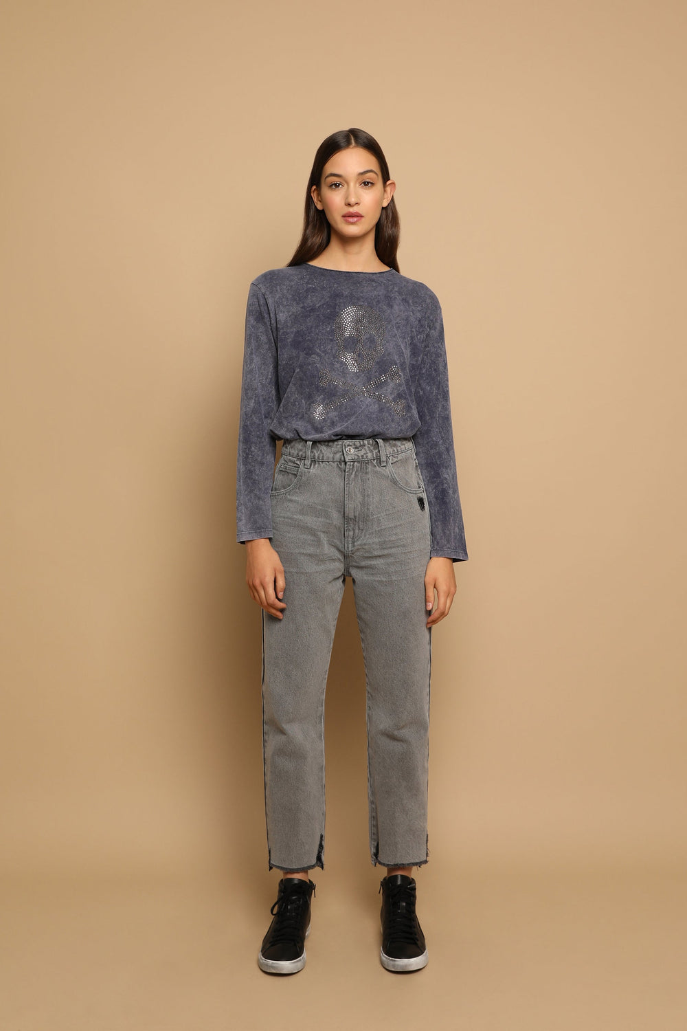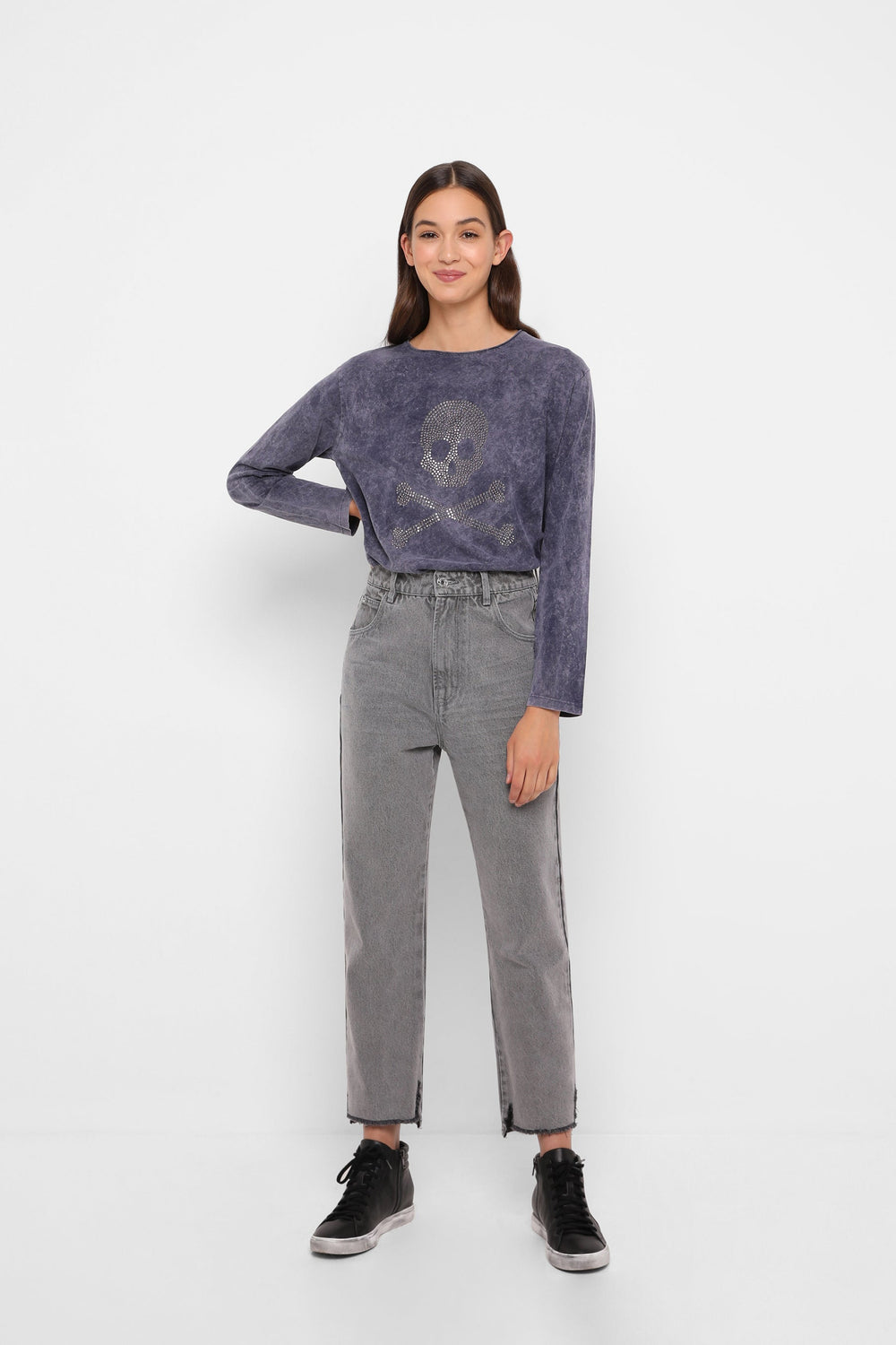 Straight fit jeans in slightly stretchy cotton blend. Regular fit with high waist. Button and zip fastening. Front and back pockets. Belt loops at waist. Frayed hems.
