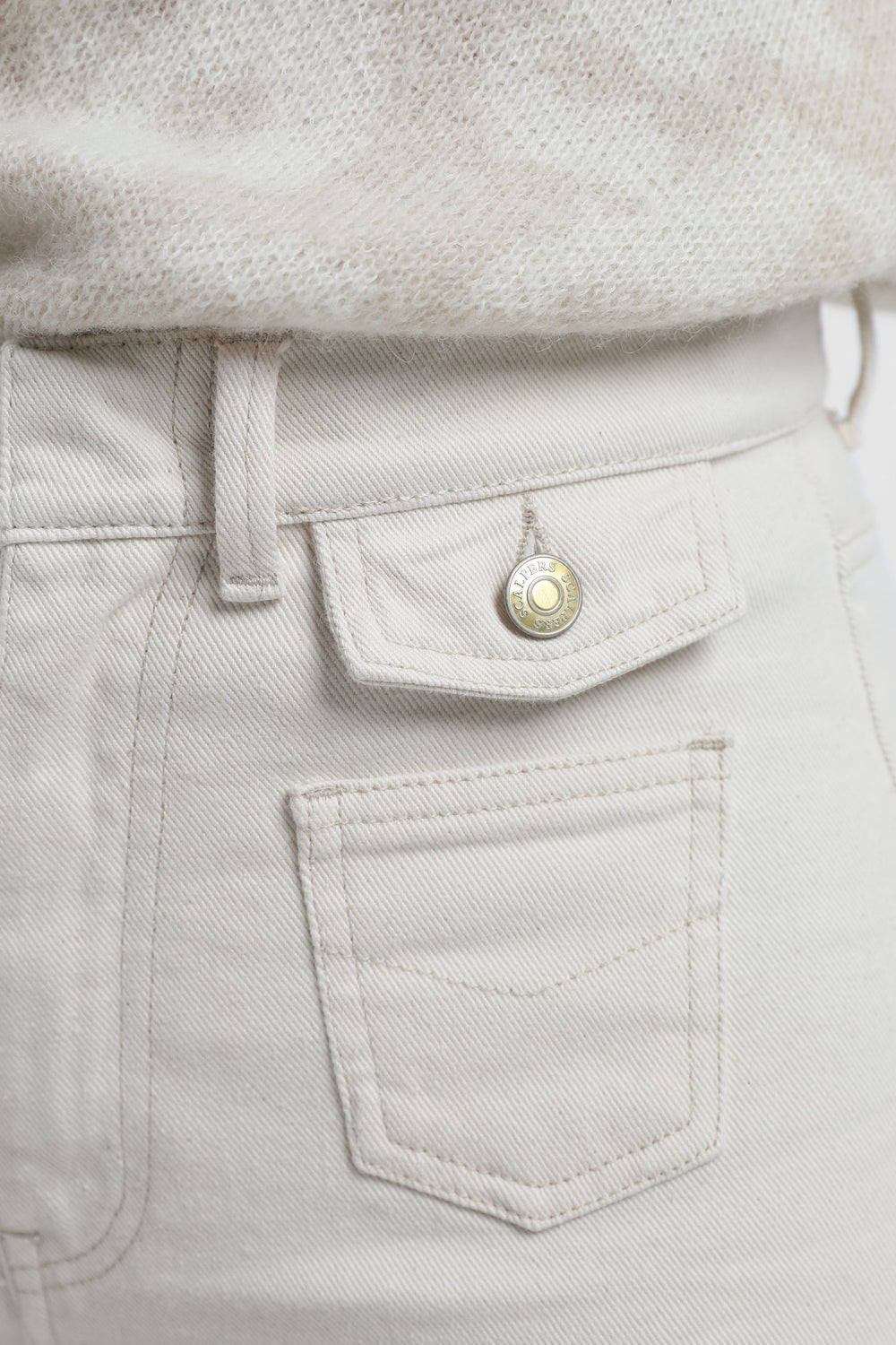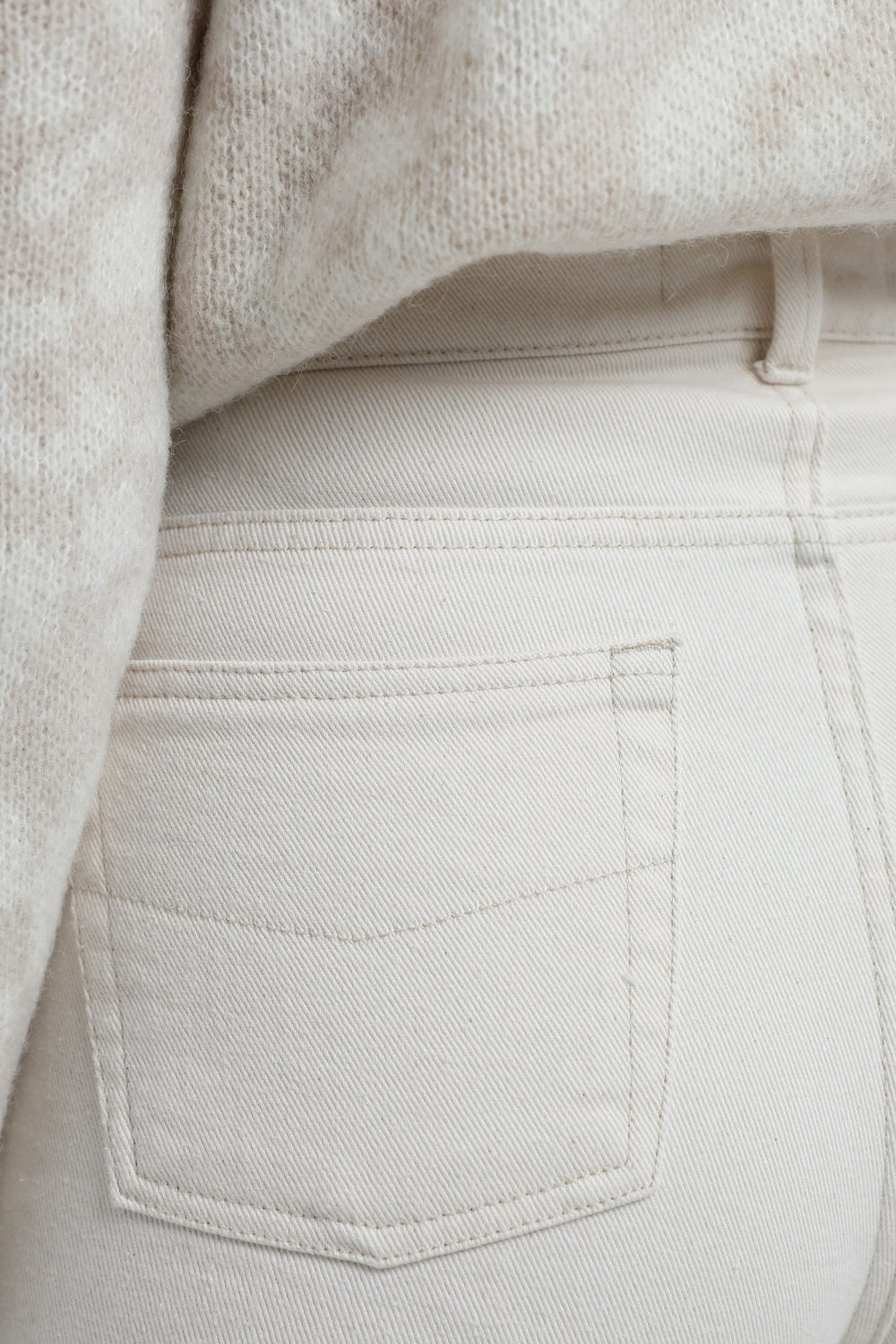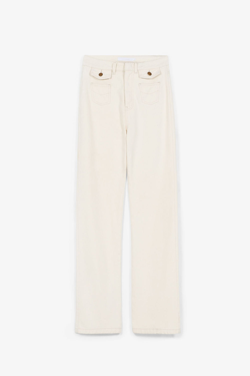 Jeans made of slightly stretch denim fabric. Flare fit, high waist, zip fly and button fastening and pockets with button. Features belt loops.