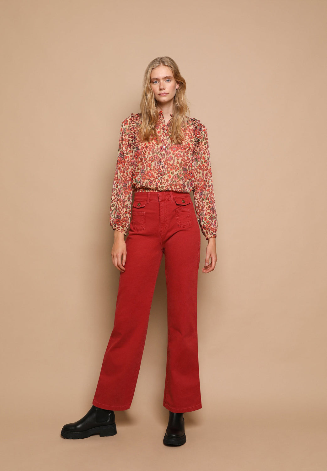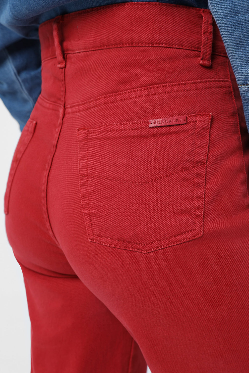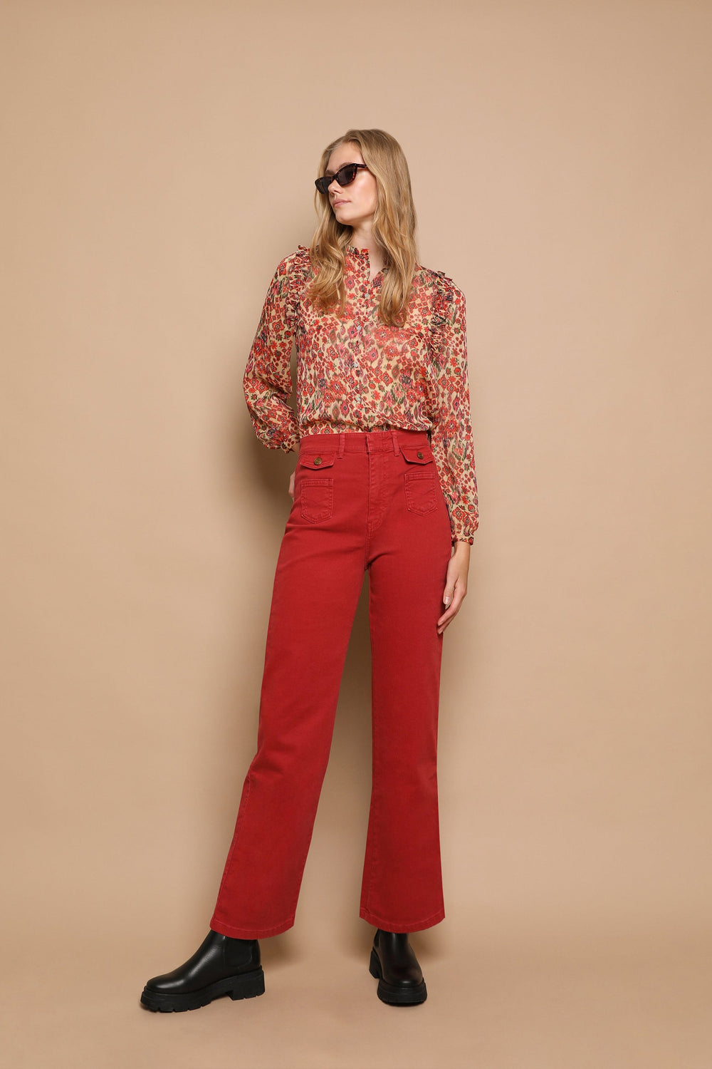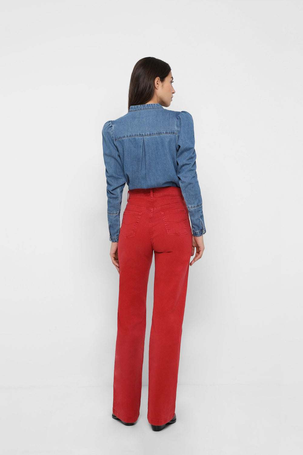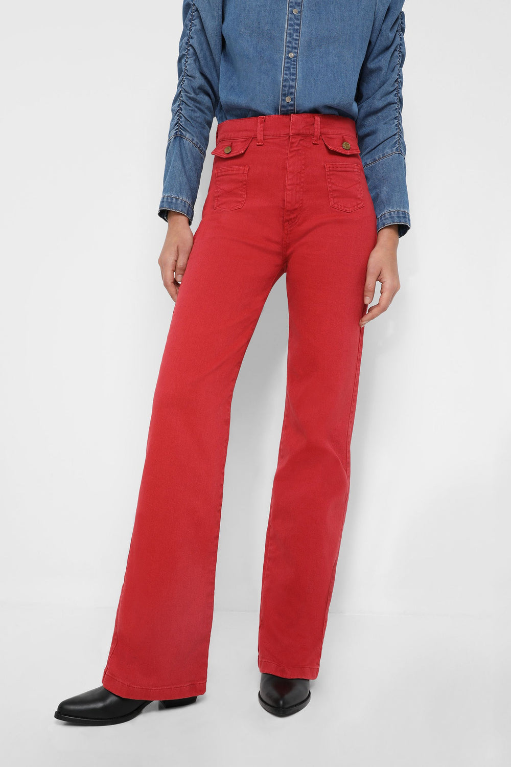 Jeans made of slightly stretch denim fabric. Flare fit, high waist, zip fly and button fastening and pockets with button. Features belt loops.