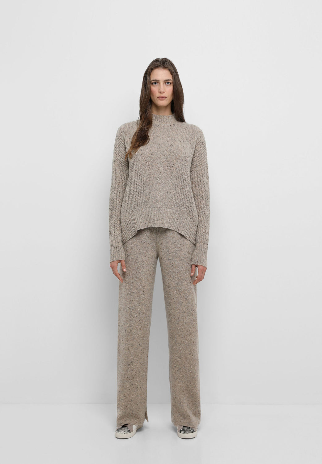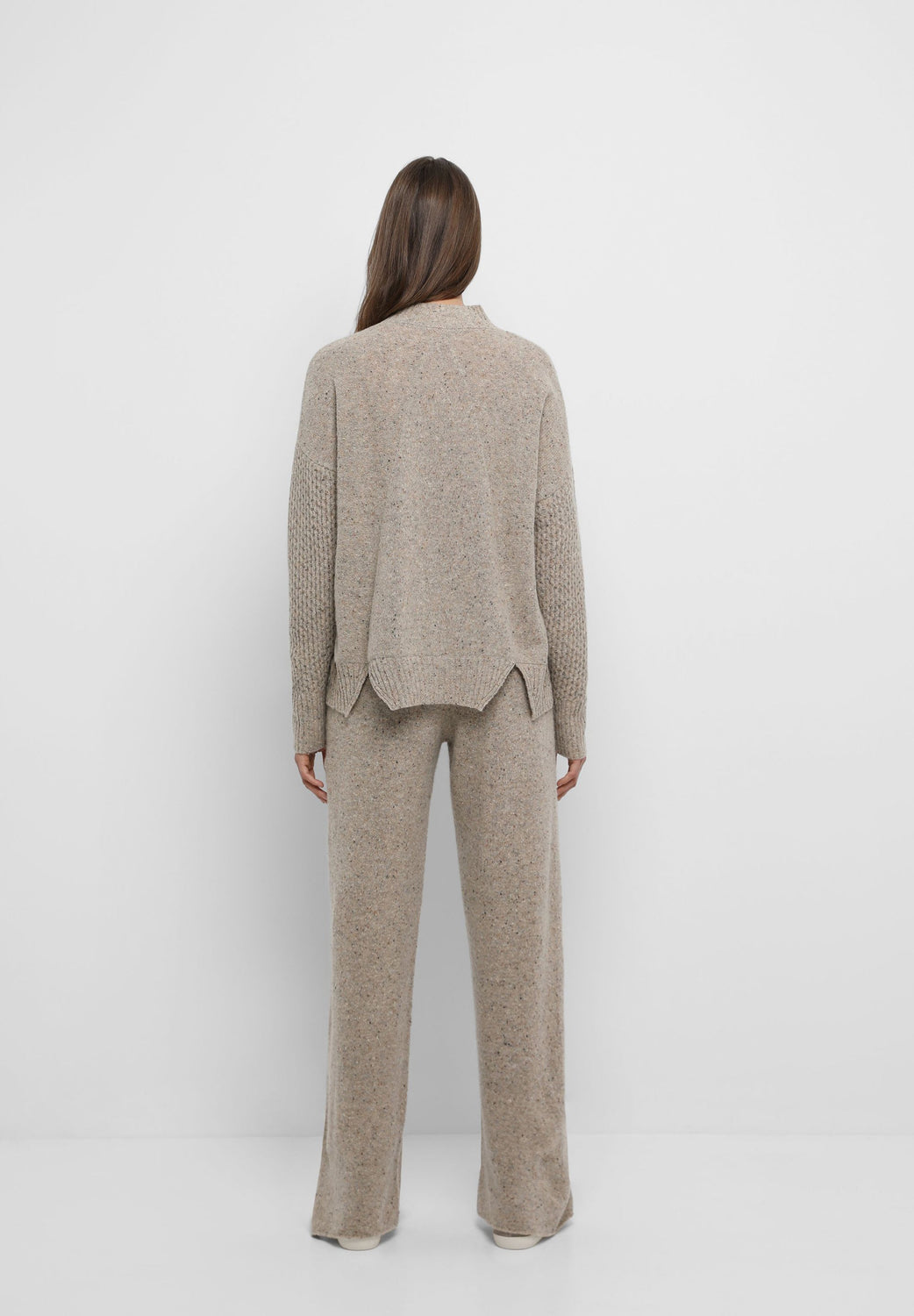 Flecked knit trousers made of a wool blend. Flared cut, elasticated waist and slit hem.