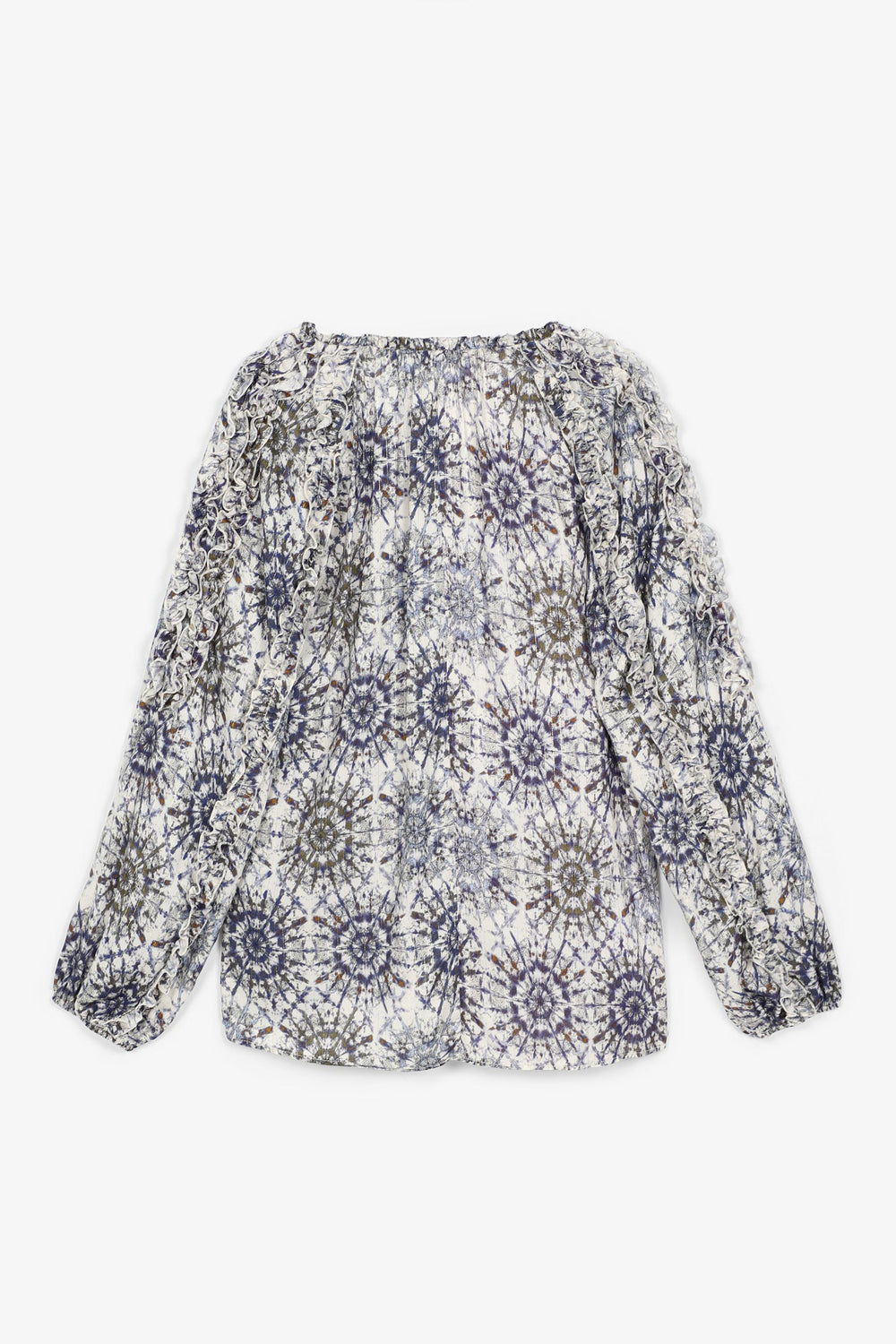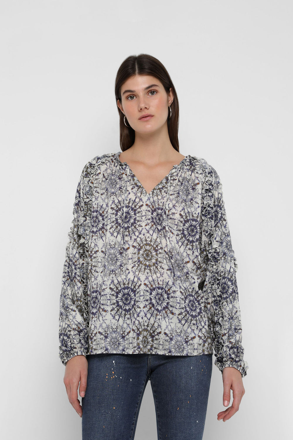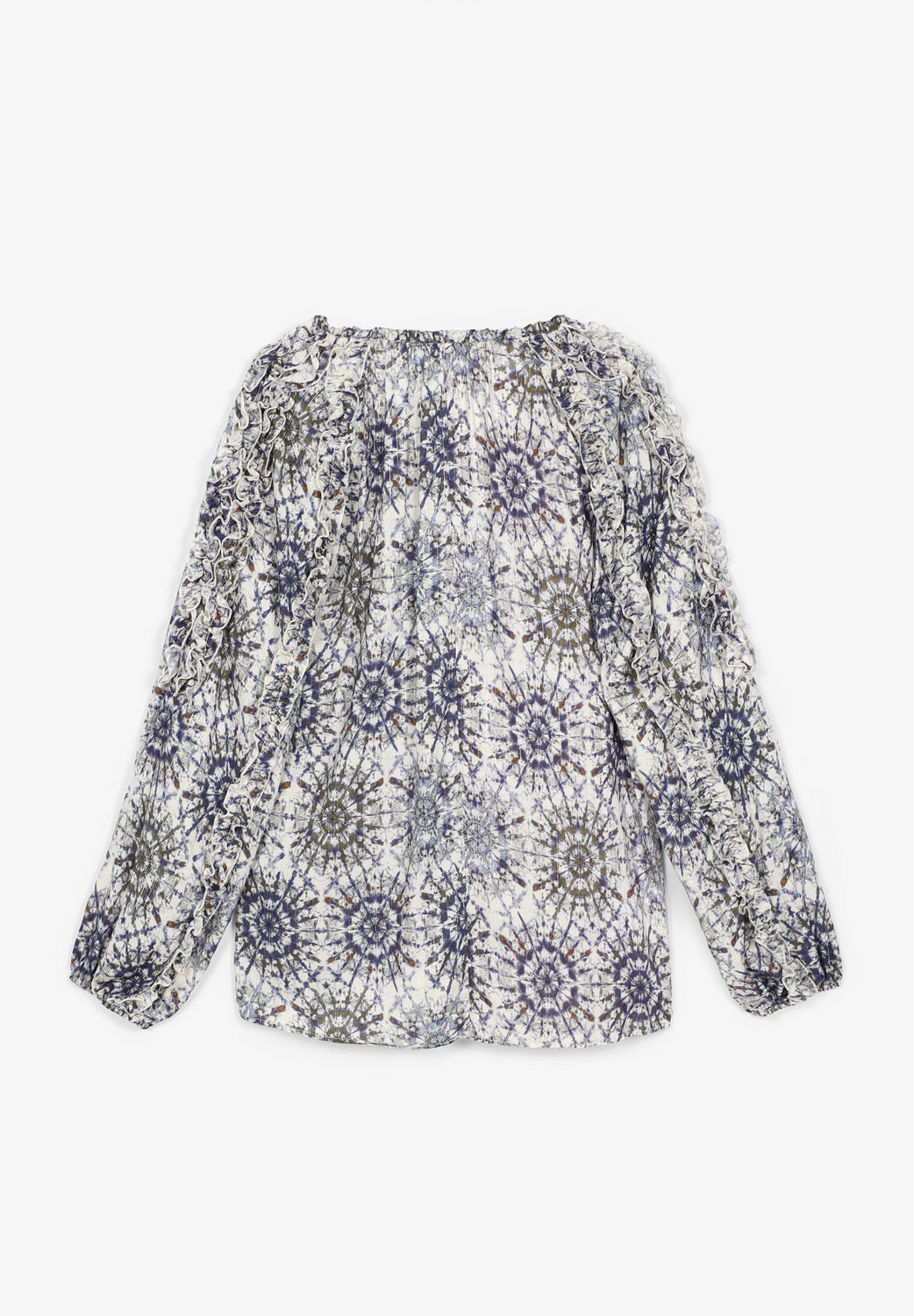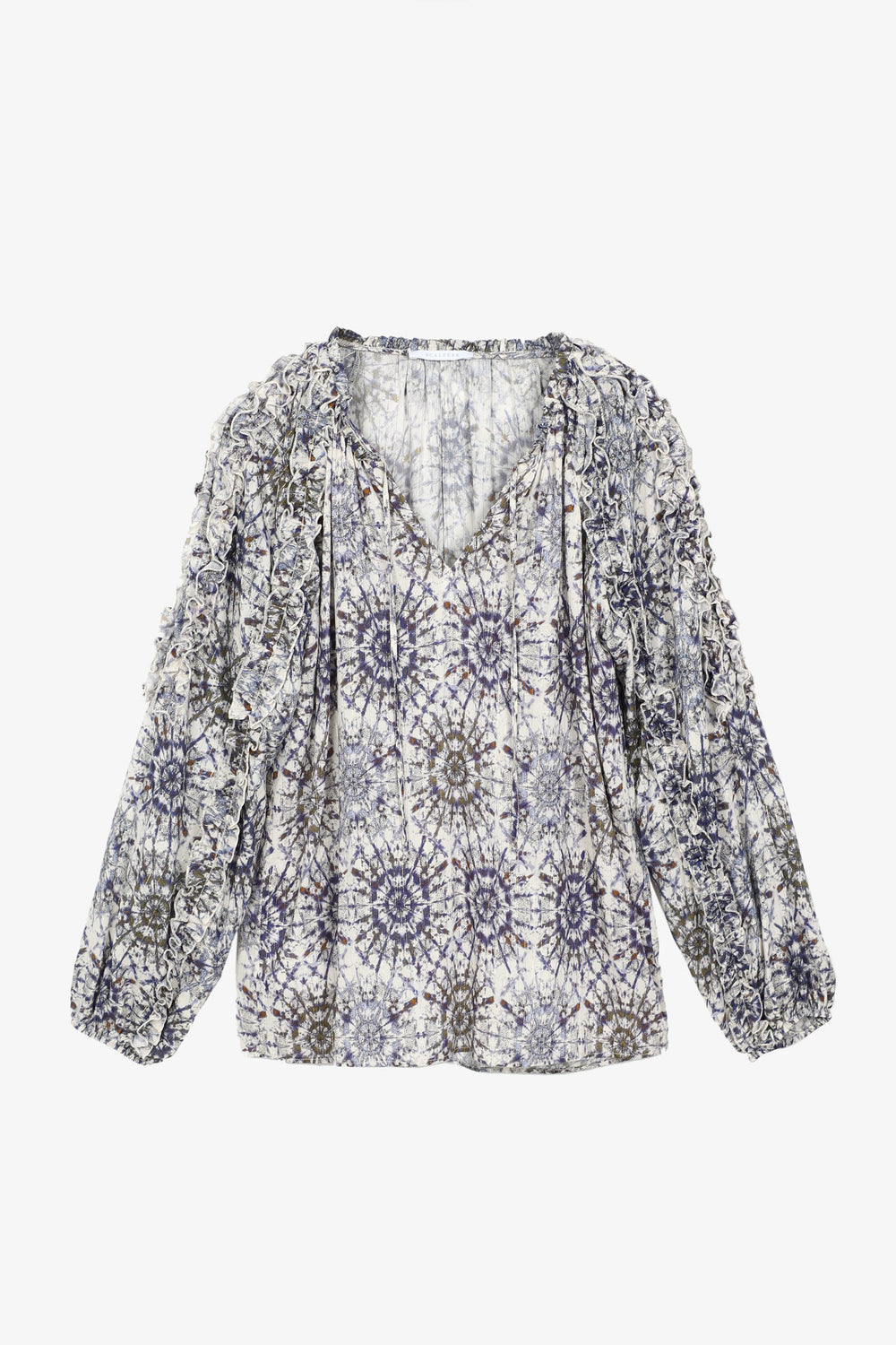 Printed blouse made of lurex with ruffled shoulder detail. Flowing cut and slightly puff sleeves.