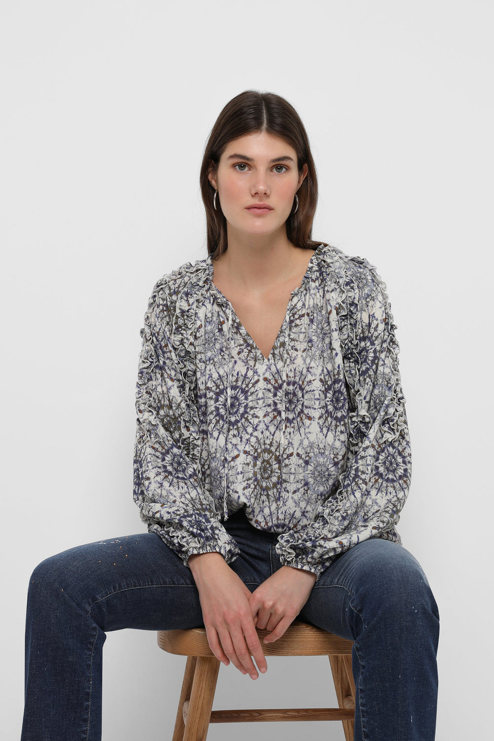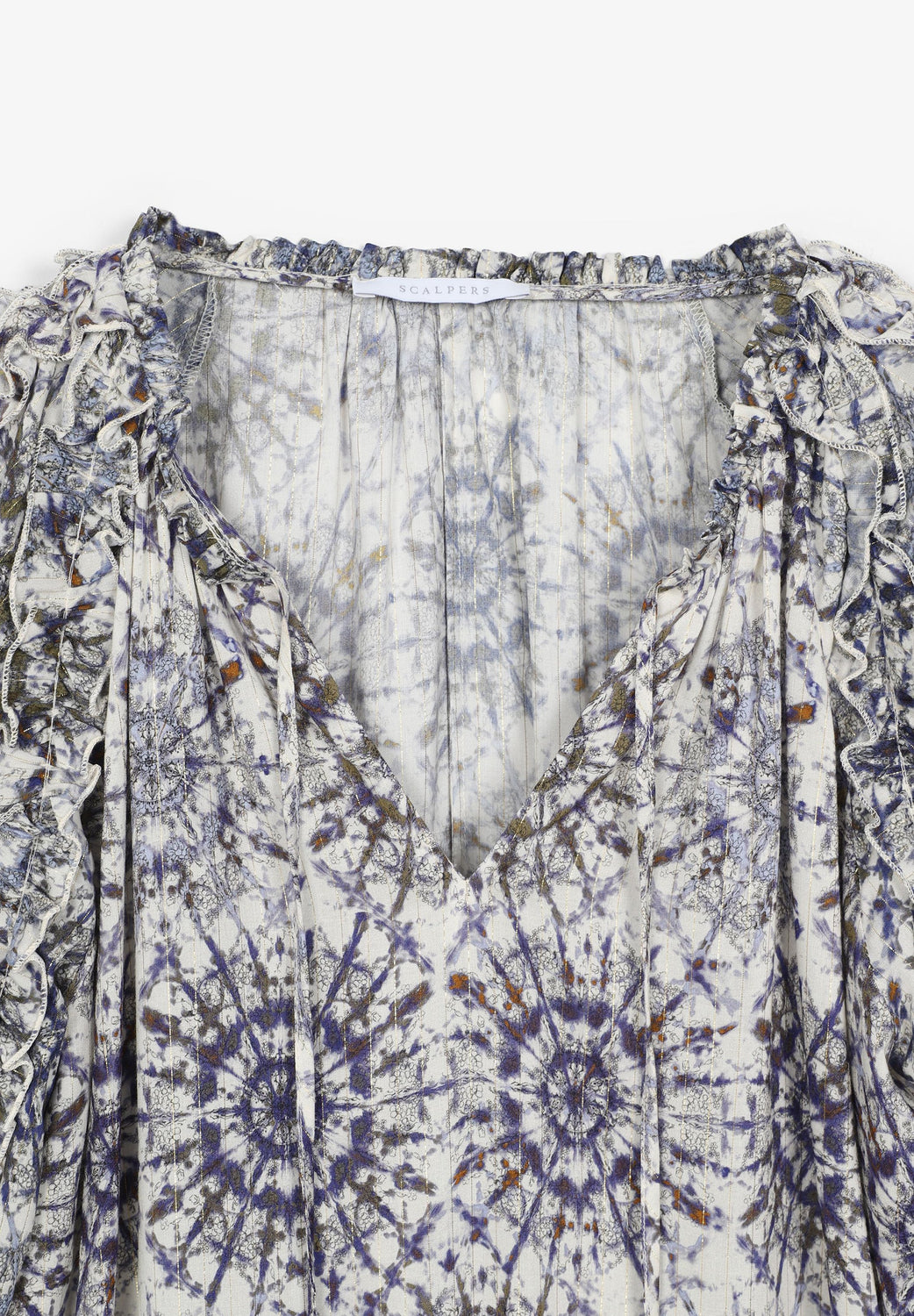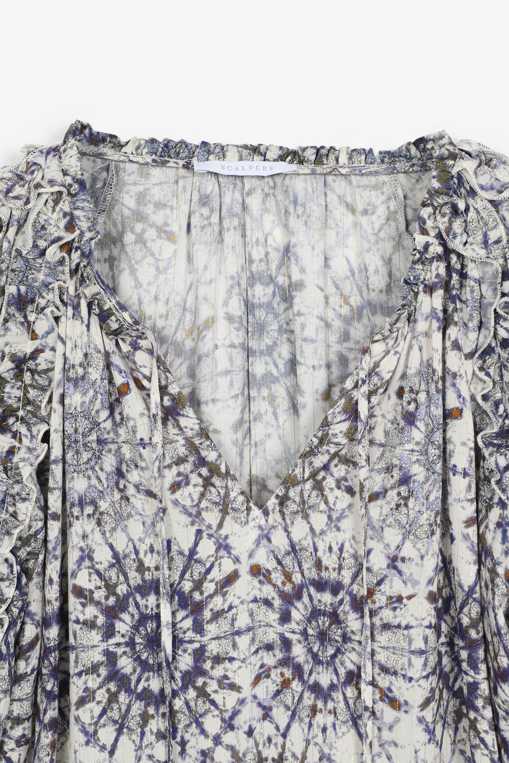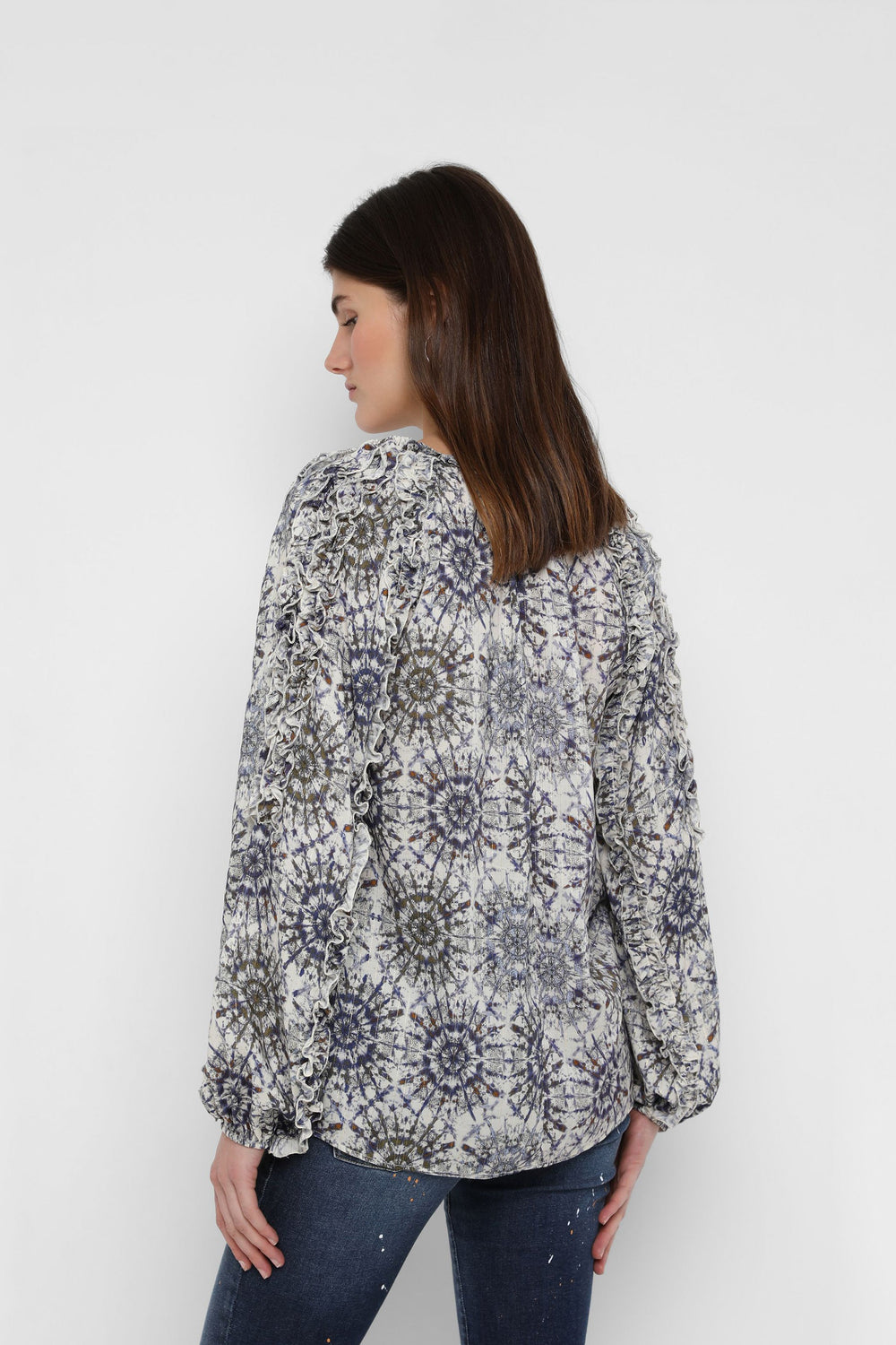 Printed blouse made of lurex with ruffled shoulder detail. Flowing cut and slightly puff sleeves.