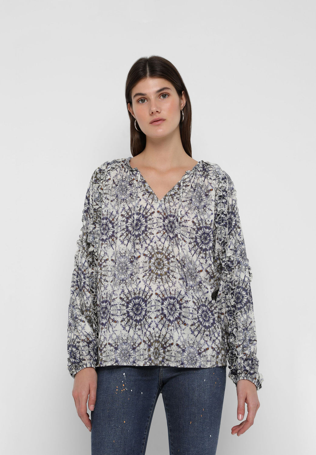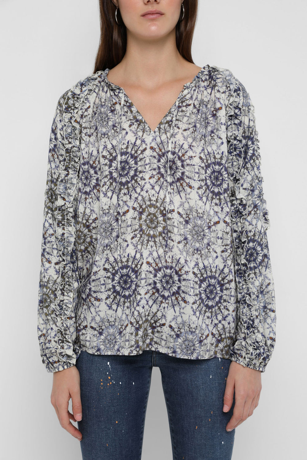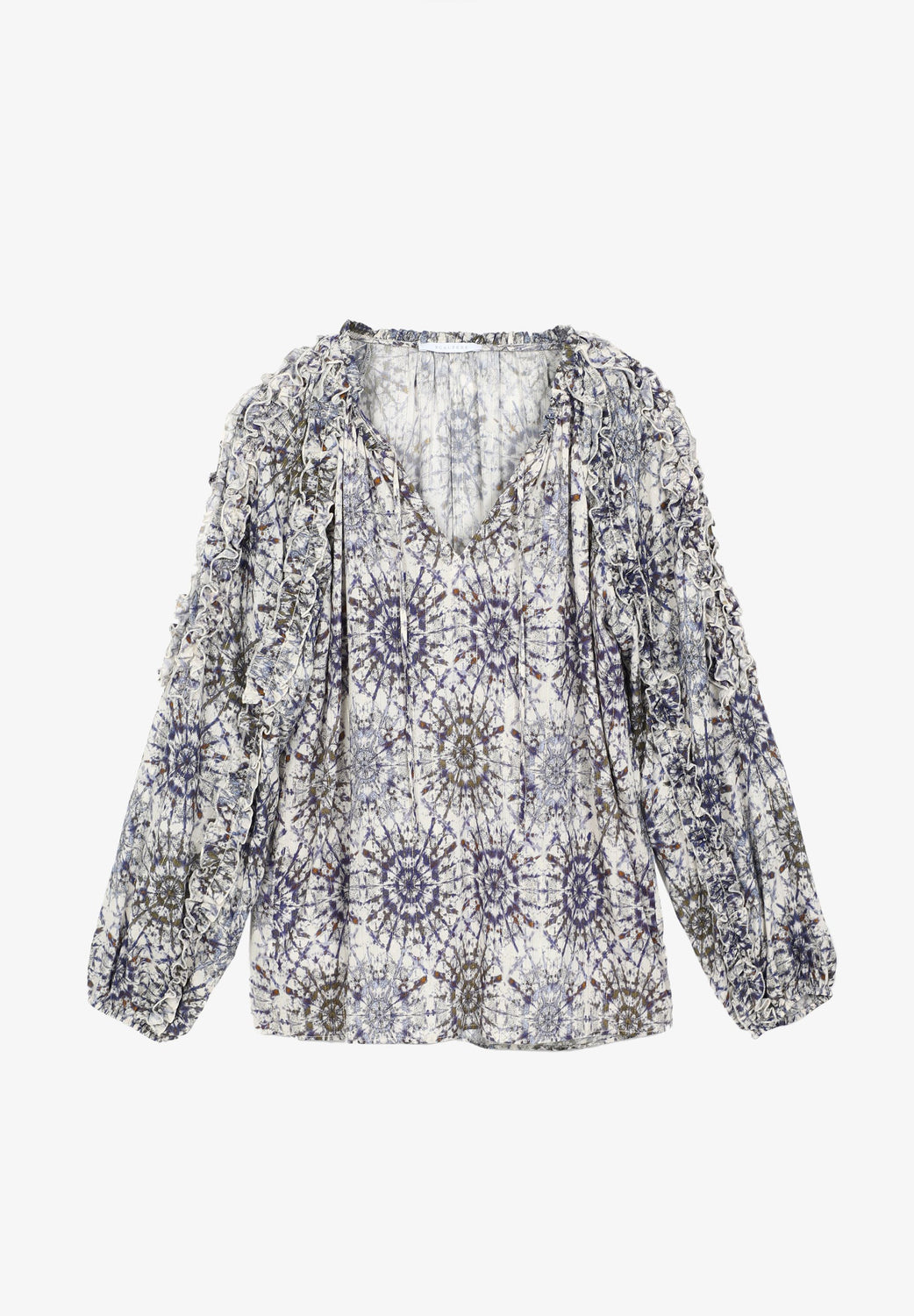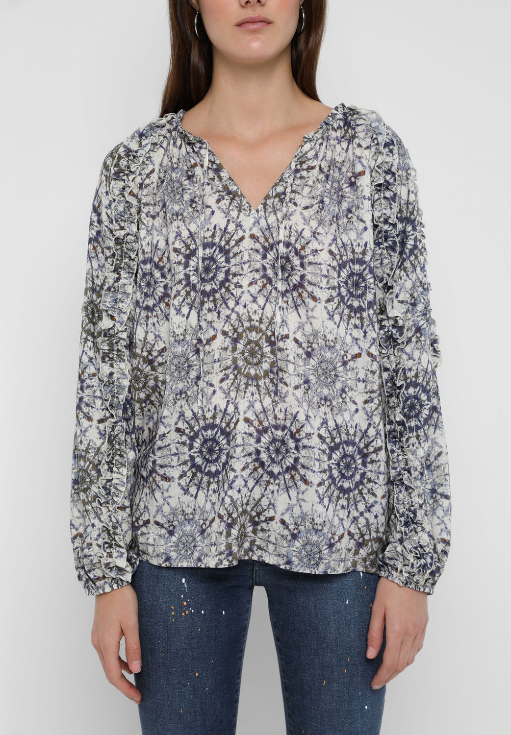 Printed blouse made of lurex with ruffled shoulder detail. Flowing cut and slightly puff sleeves.