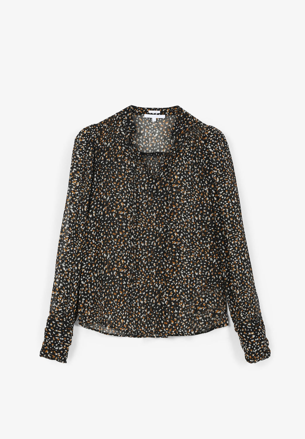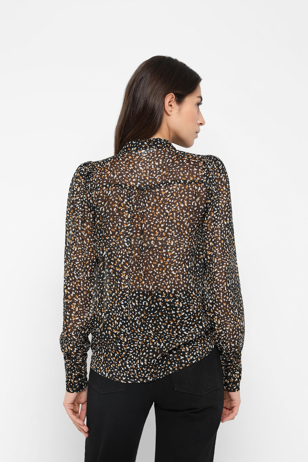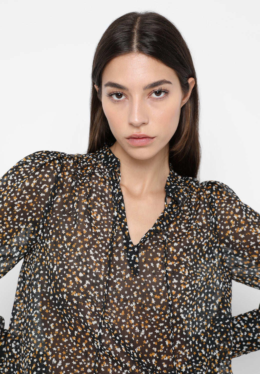 Semi-transparent blouse with star print made of metallic fabric. Regular fit, stand-up collar and long puffed sleeves.