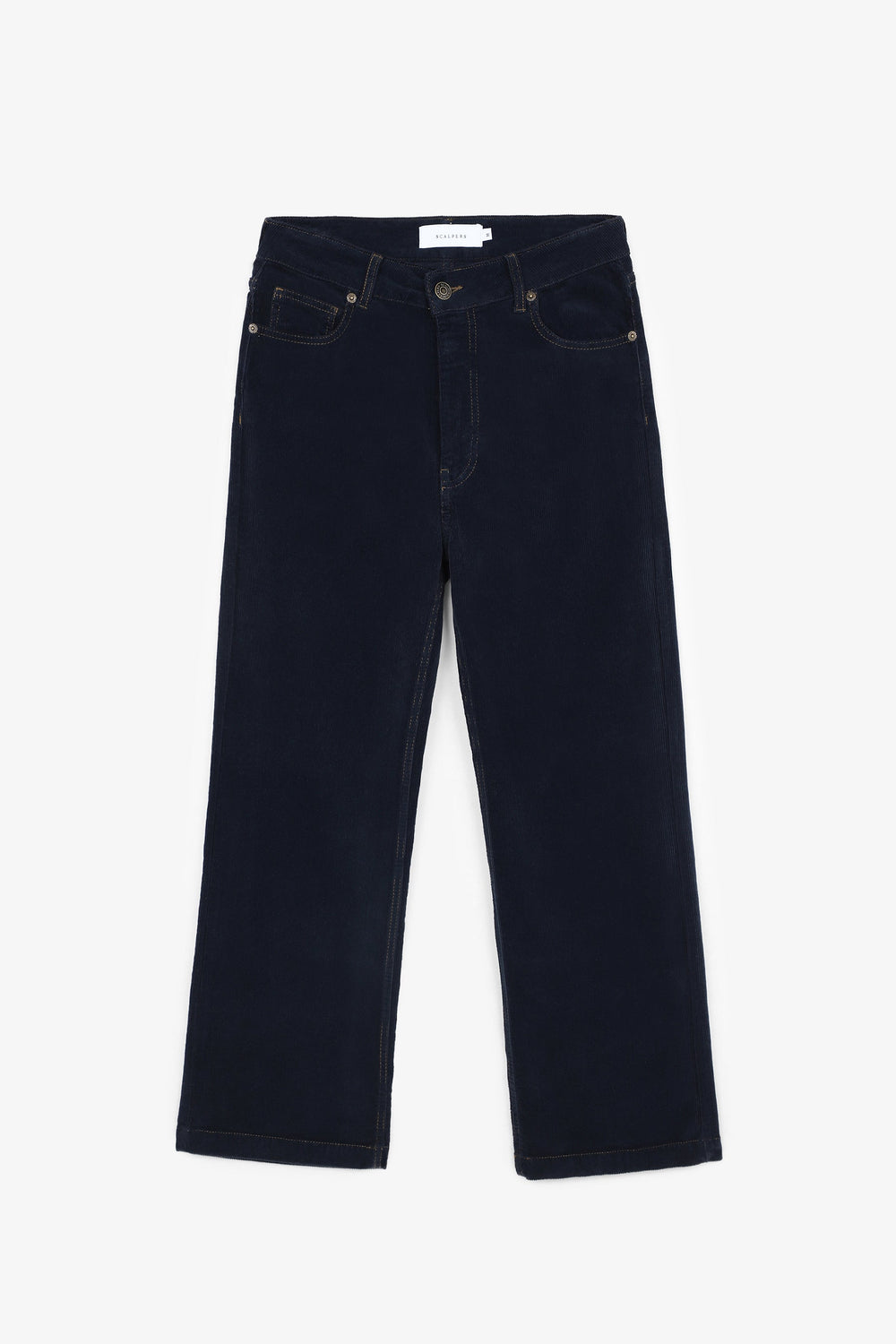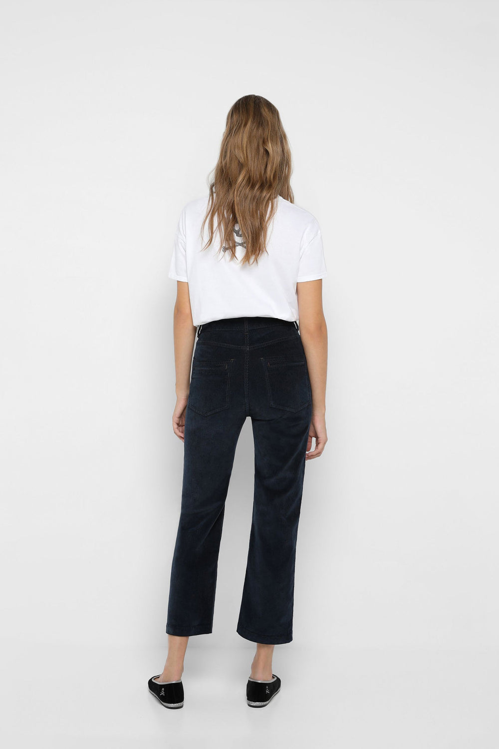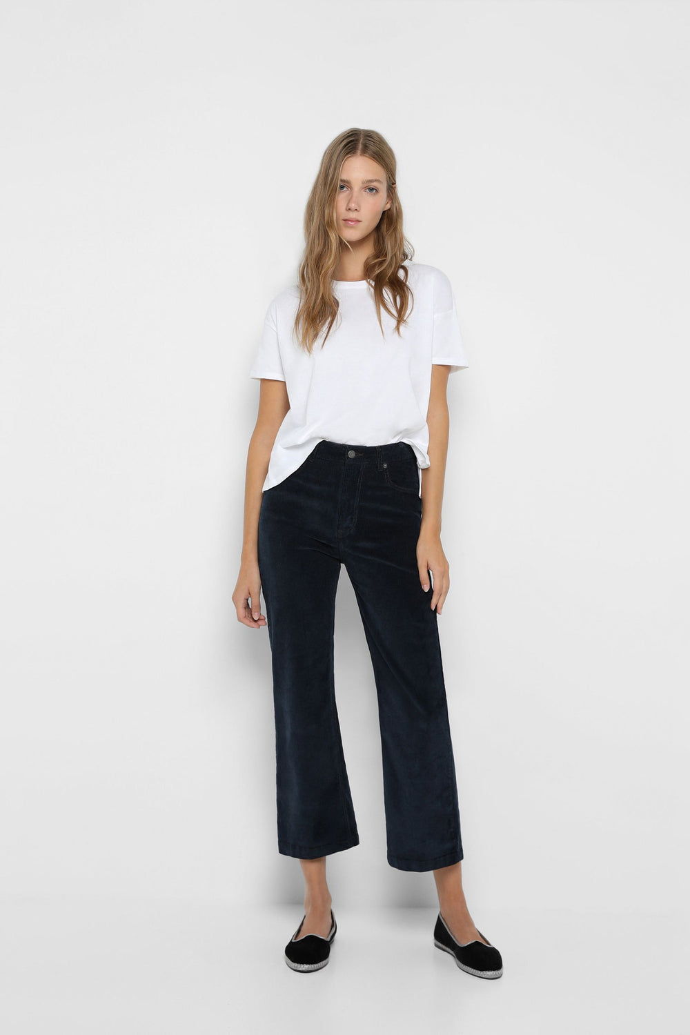 Corduroy trousers made of slightly stretch cotton fabric. Regular fit with high waist, zip and button fastening and side and back pockets. Belt loops at waist.