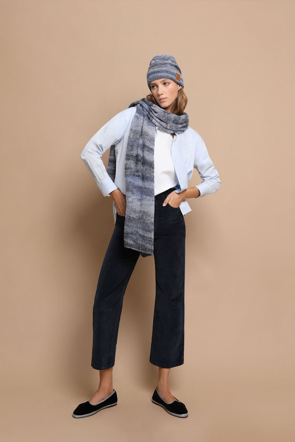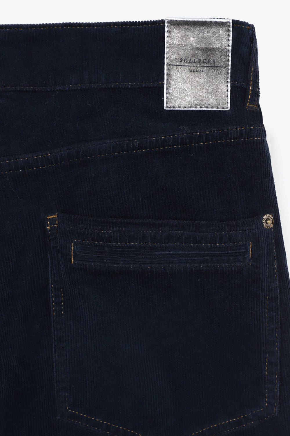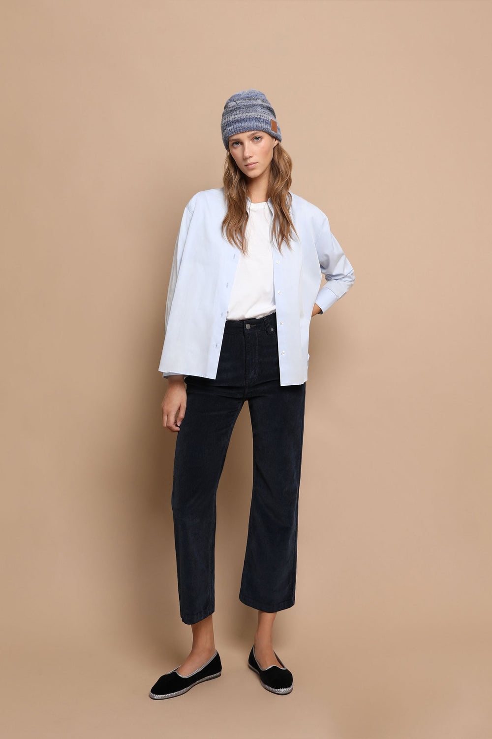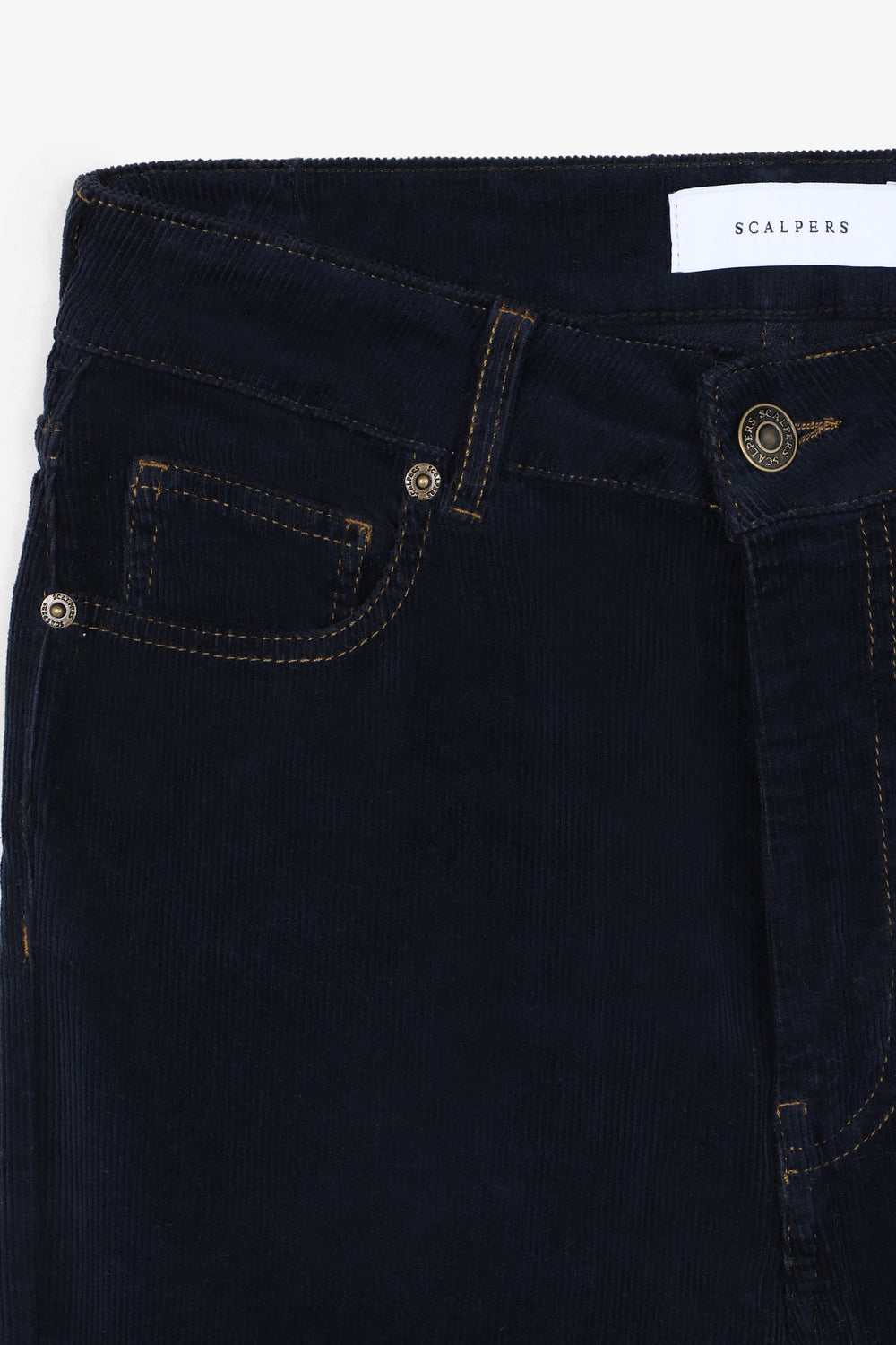 Corduroy trousers made of slightly stretch cotton fabric. Regular fit with high waist, zip and button fastening and side and back pockets. Belt loops at waist.