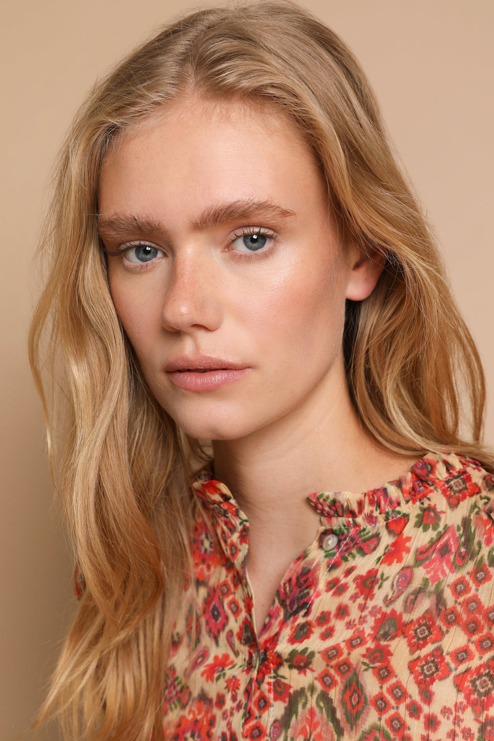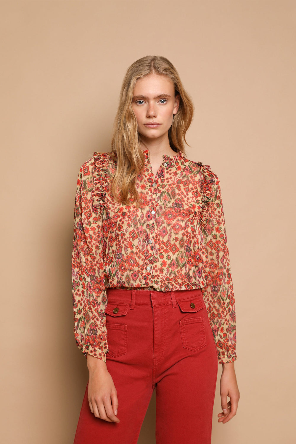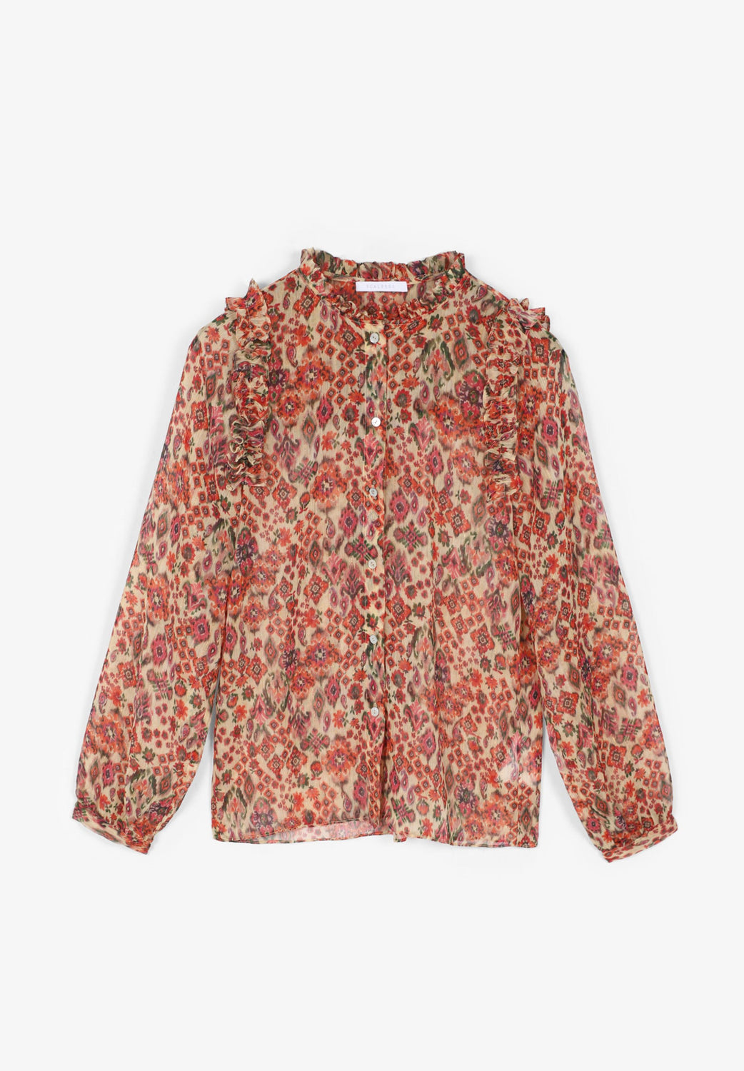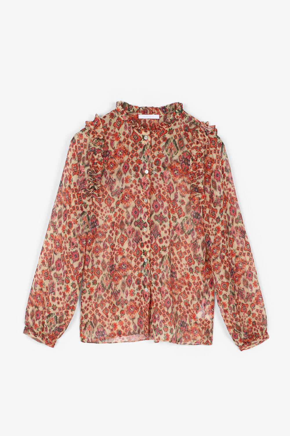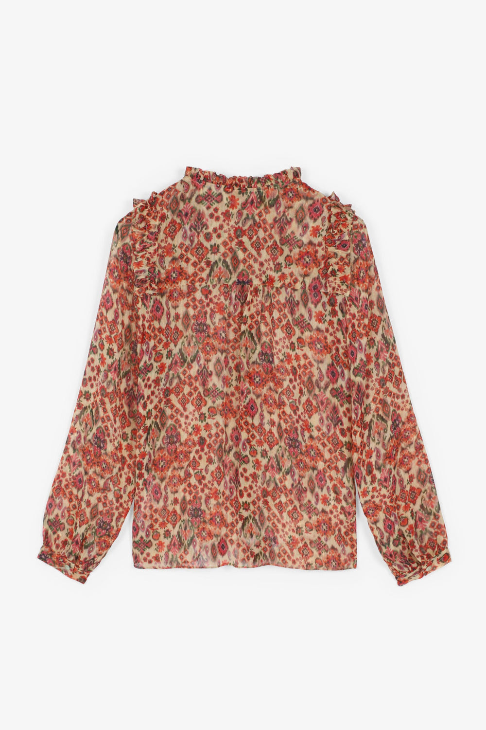 Printed blouse made of fabric with lurex. Regular fit, stand-up collar with ruffles and button fastening. Long sleeve with ruffles on the shoulder.