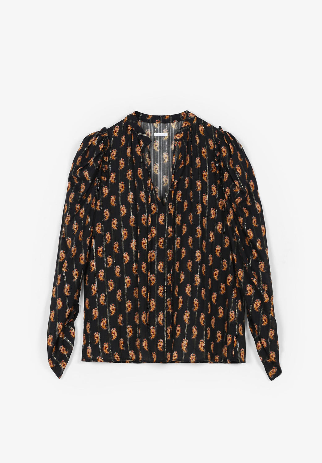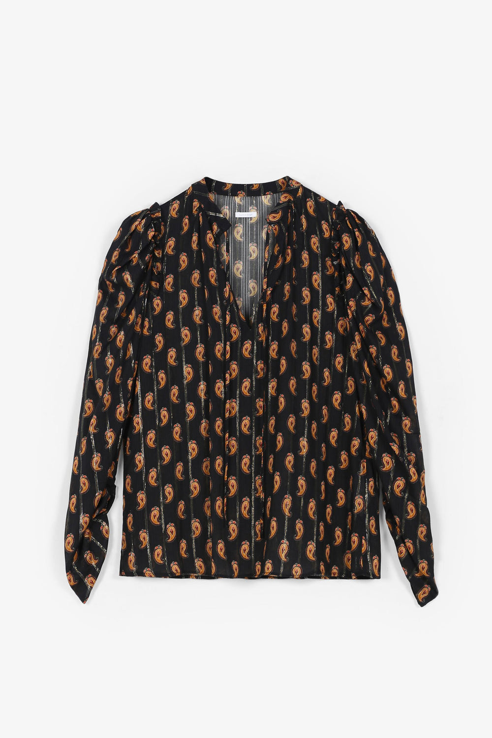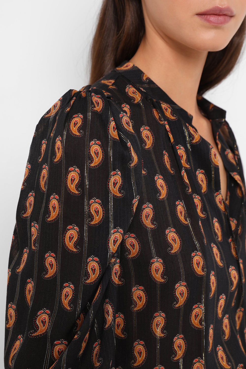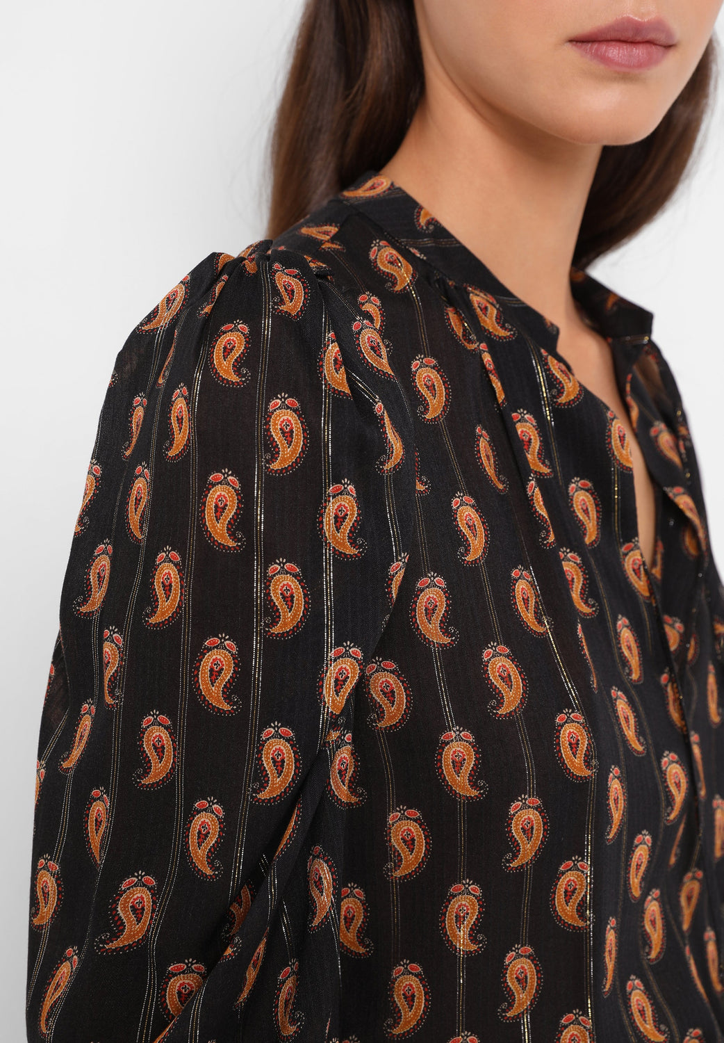 Paisley print blouse with metallic fibre blend. Regular fit cut, V-neckline with ties and puffed sleeves with gathers.