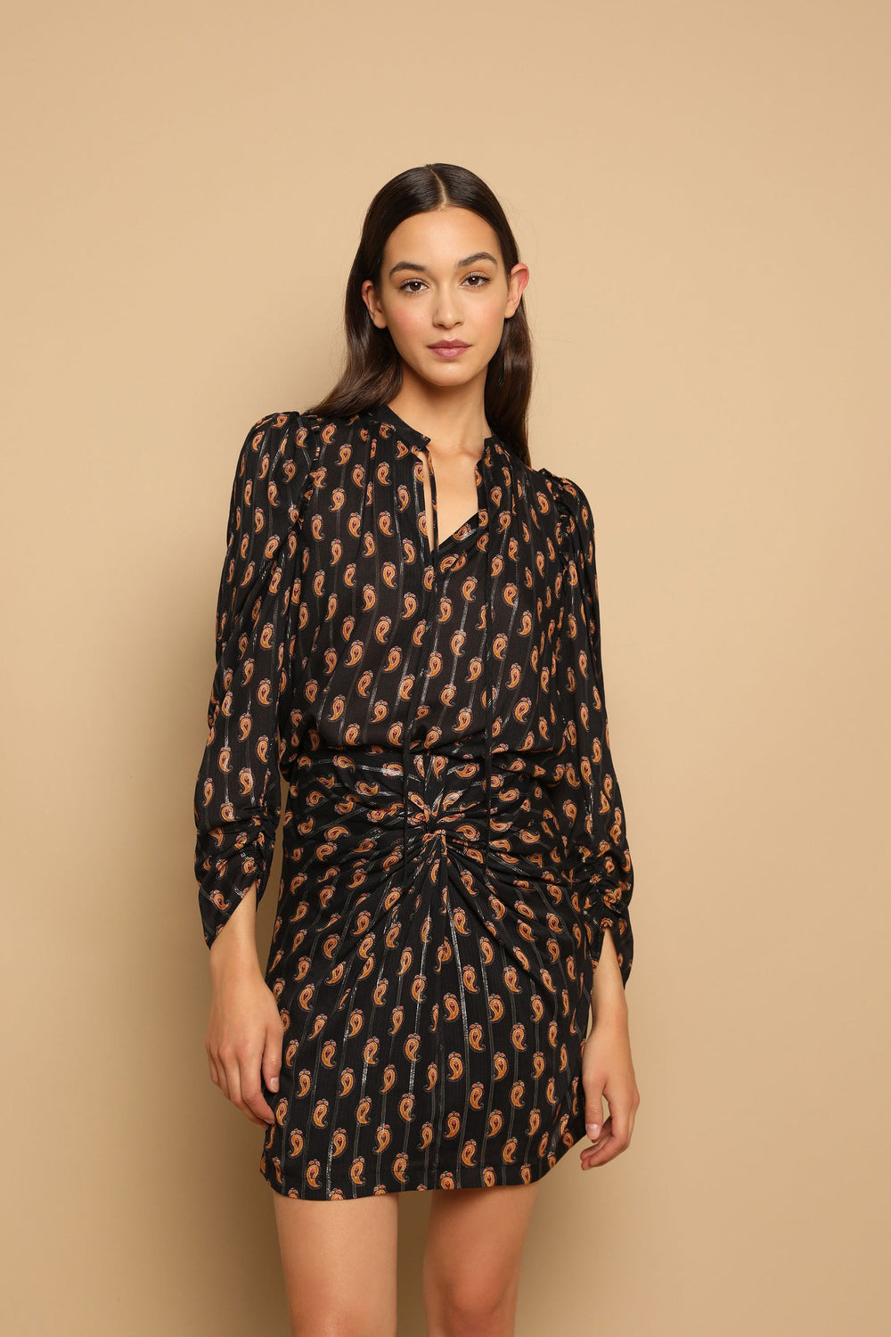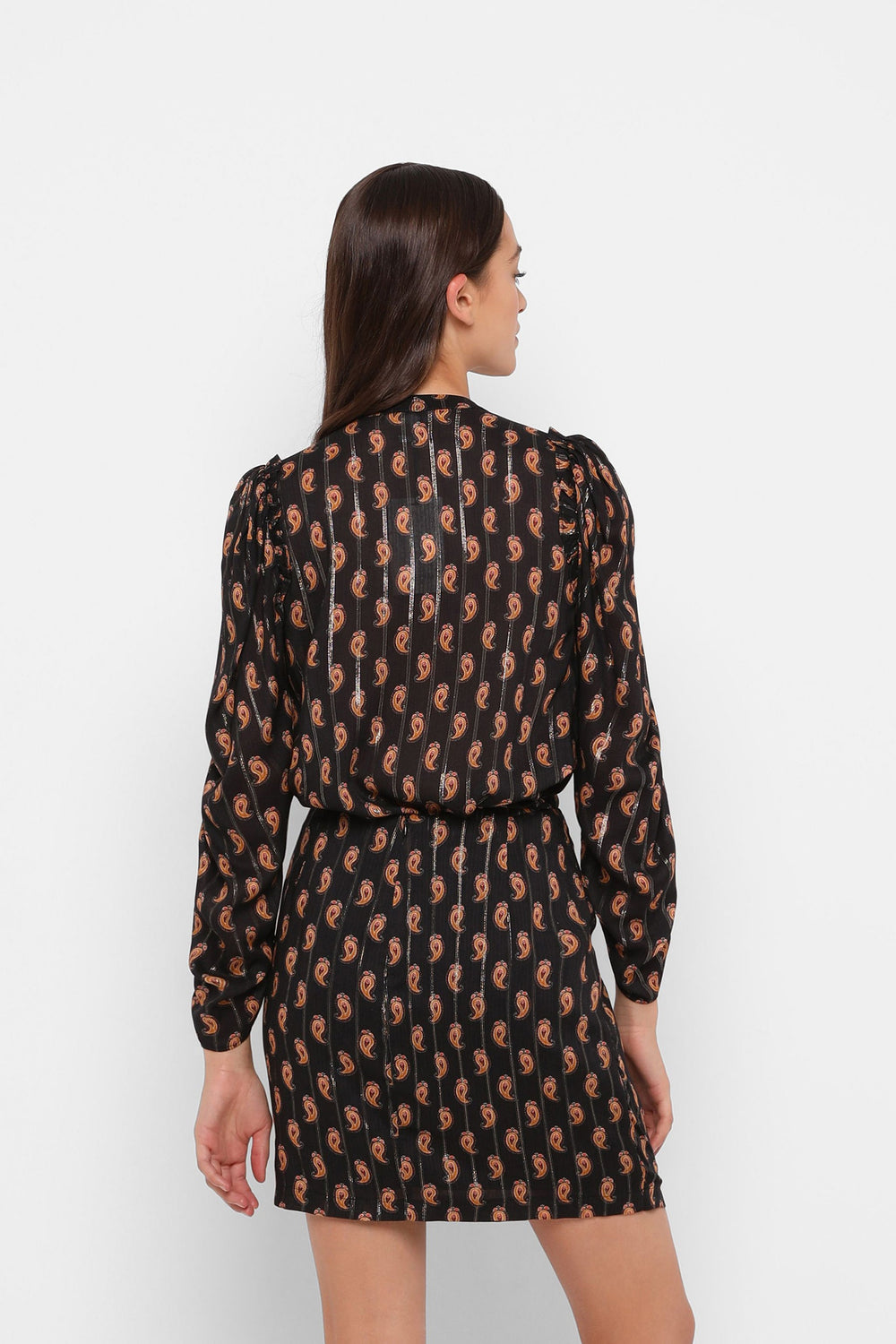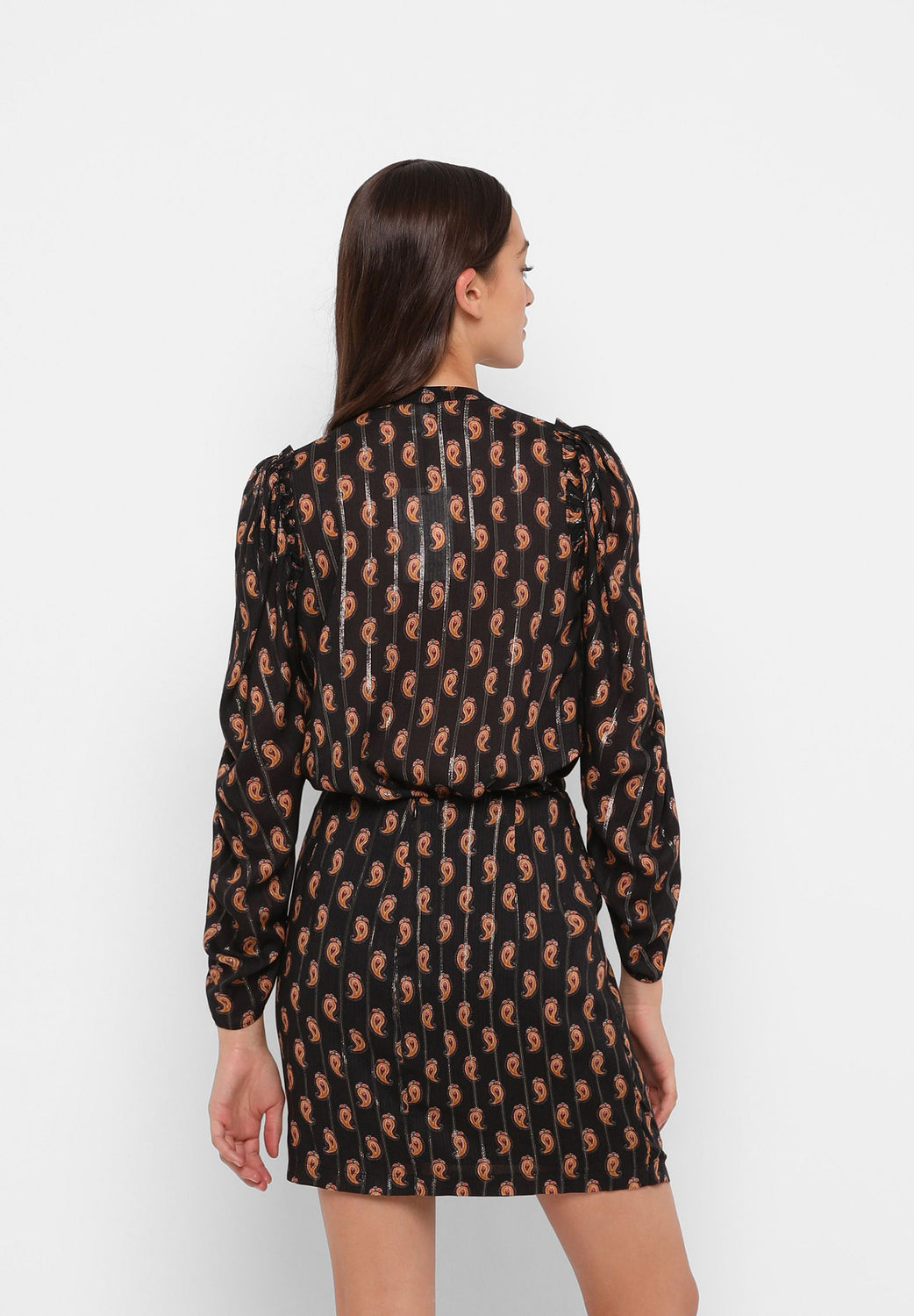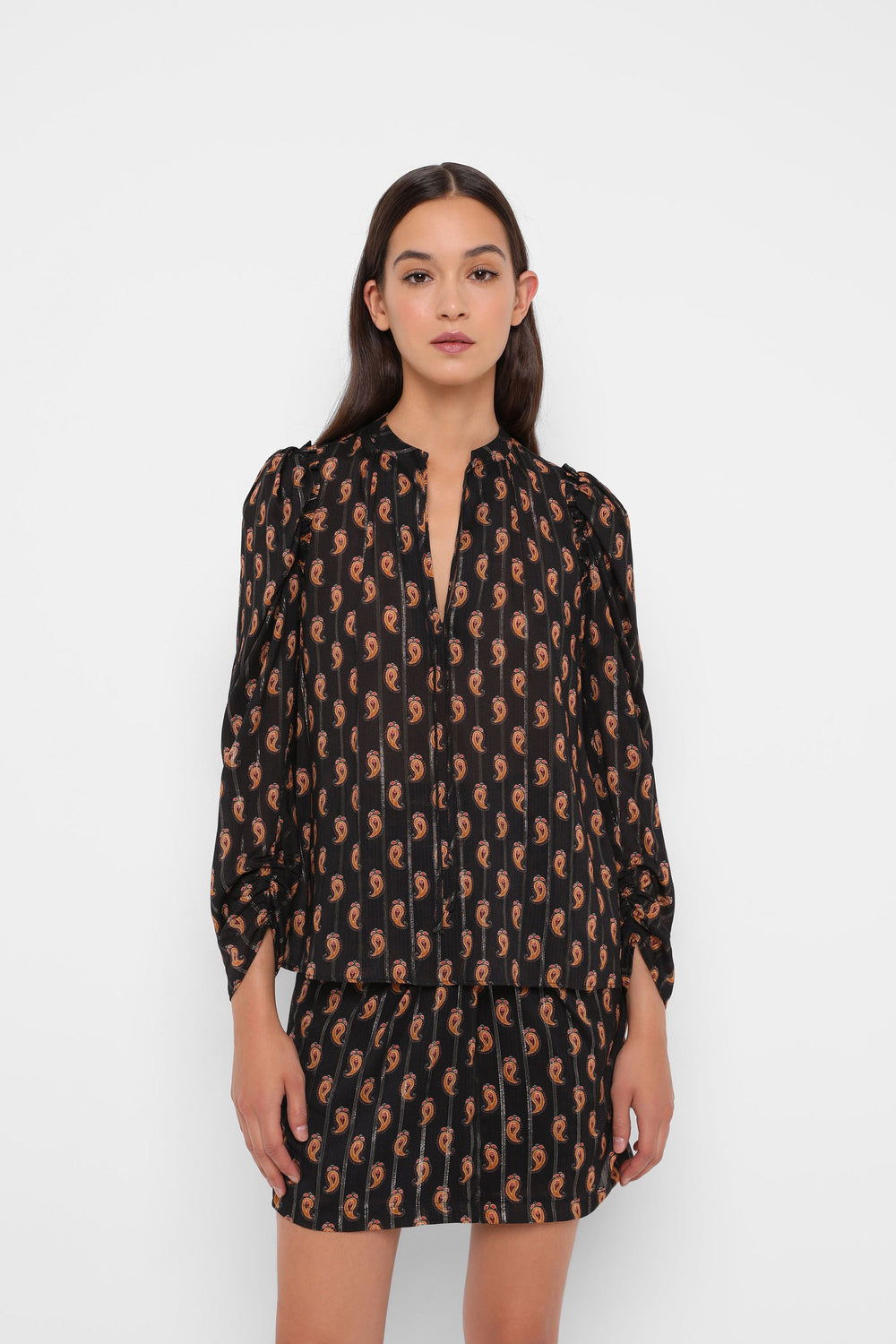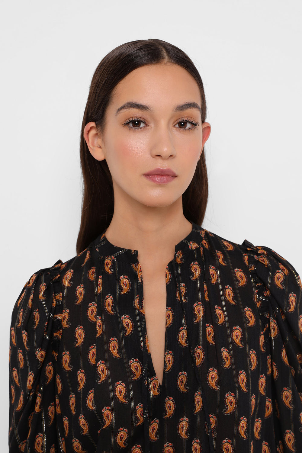 Paisley print blouse with metallic fibre blend. Regular fit cut, V-neckline with ties and puffed sleeves with gathers.