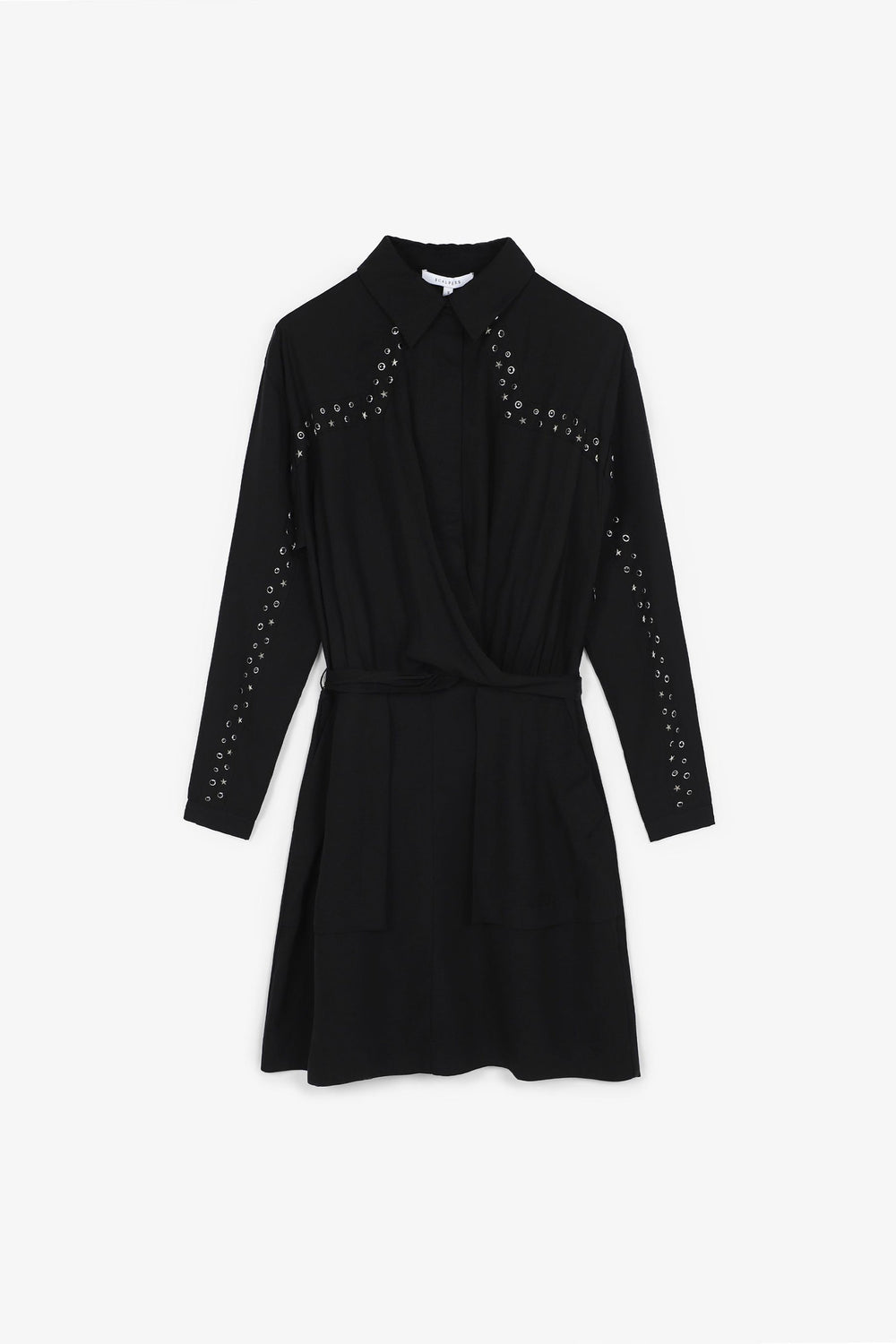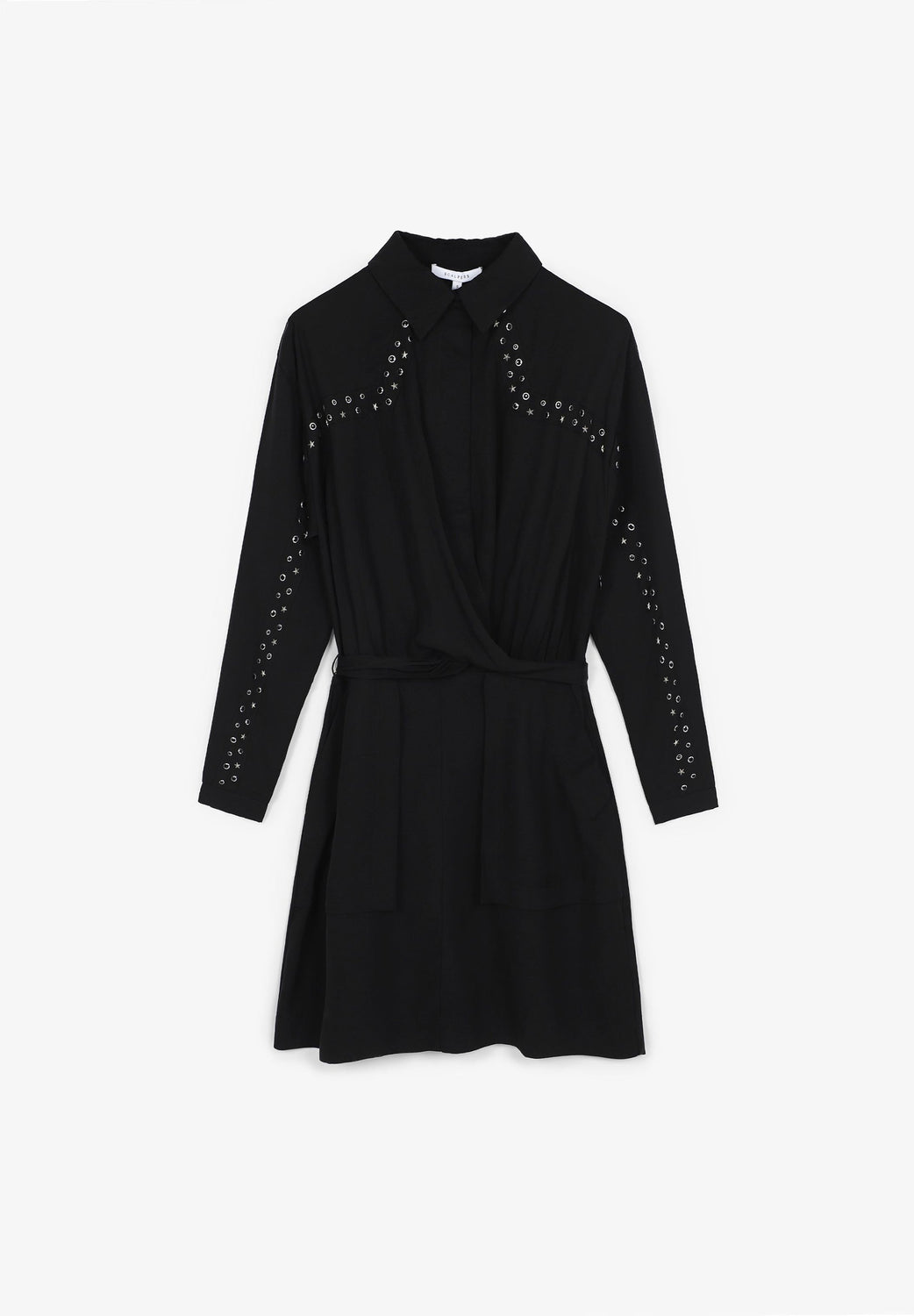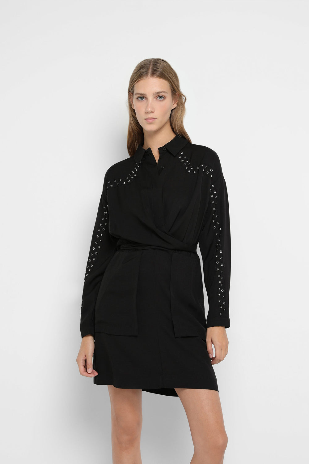 Mini dress with draped crosses in flowing fabric. Slim fit at the waist, classic collar and button and zip fastening. Studs.