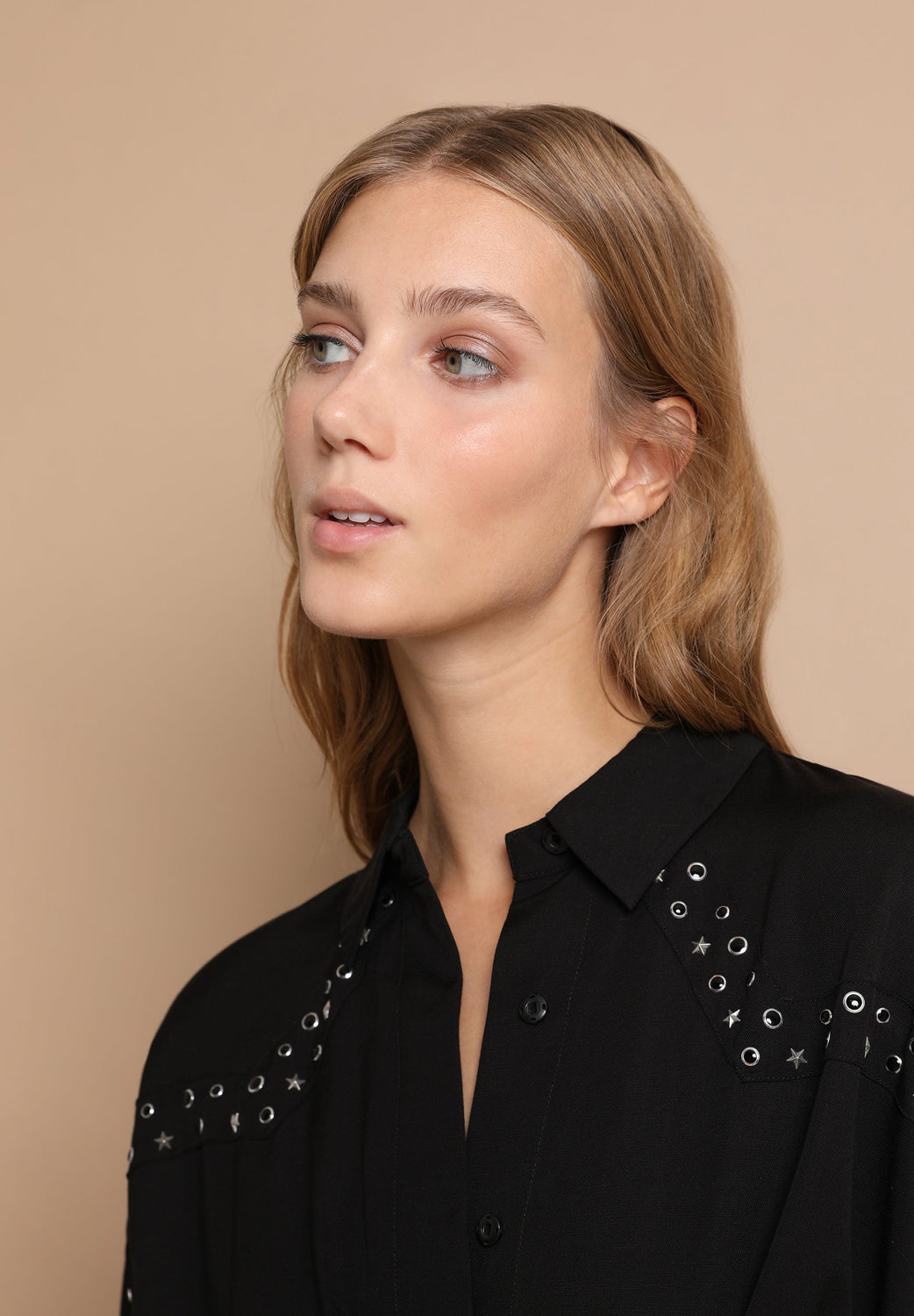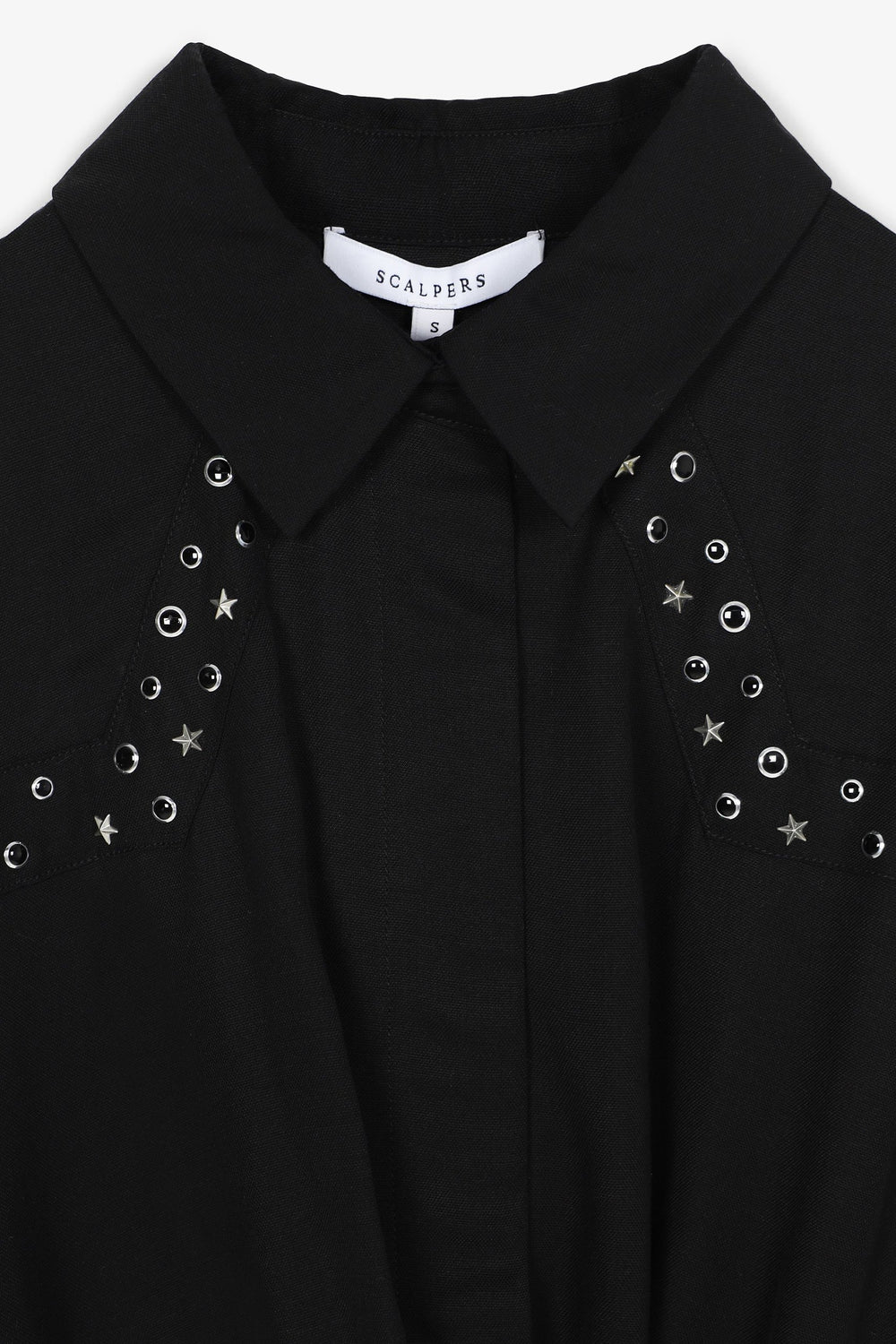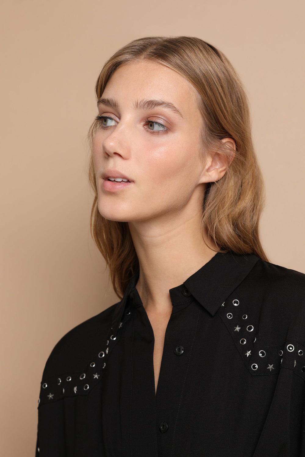 Mini dress with draped crosses in flowing fabric. Slim fit at the waist, classic collar and button and zip fastening. Studs.