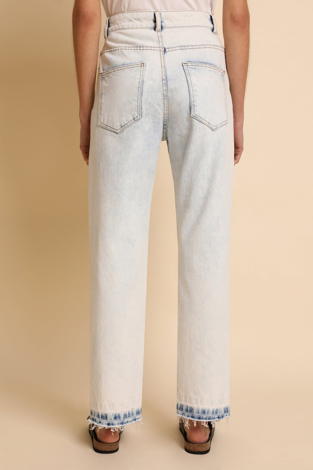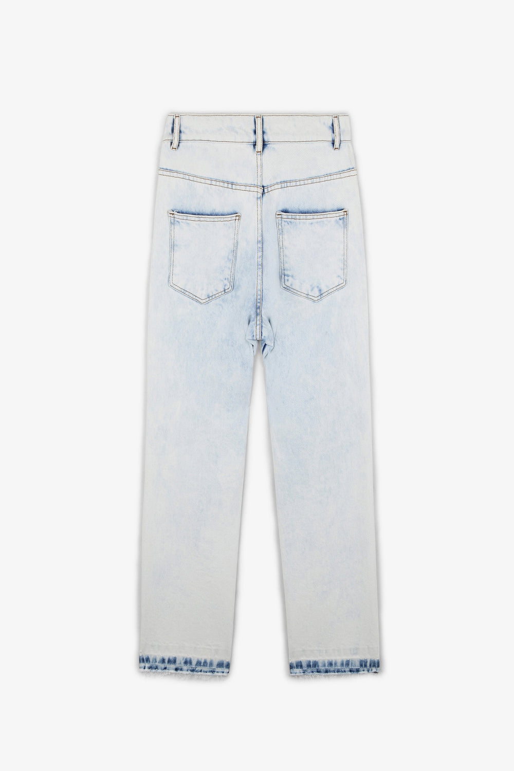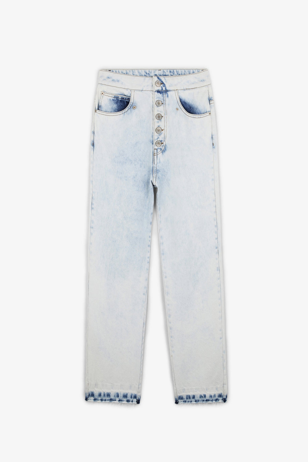 Faded denim trousers made of 100% cotton. Regular fit with high waist, button fastening and side and back pockets. Fringed hem.