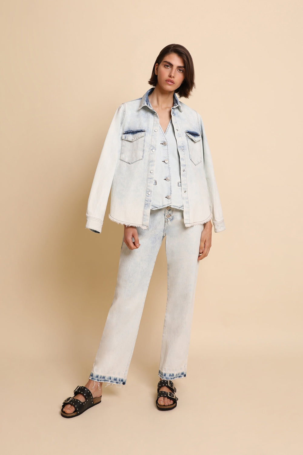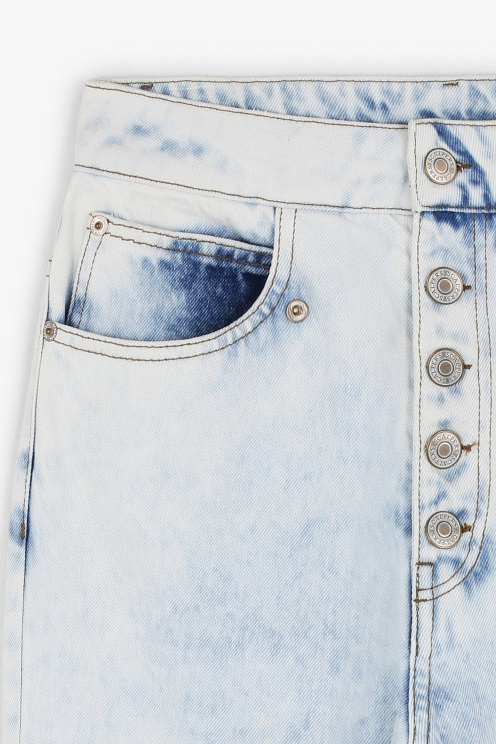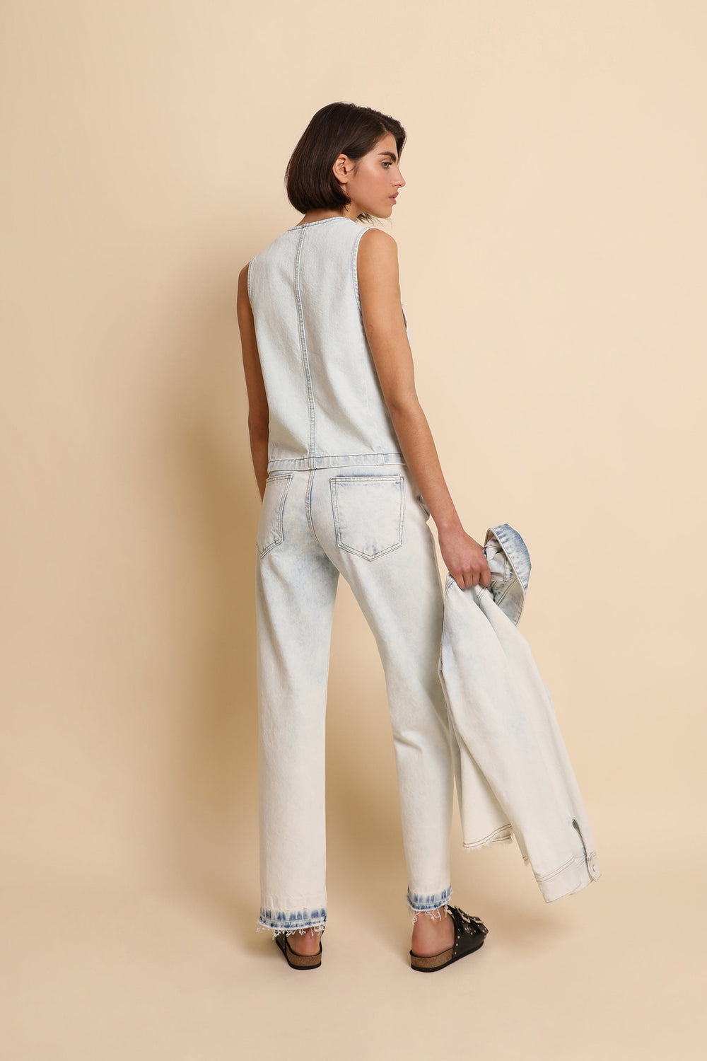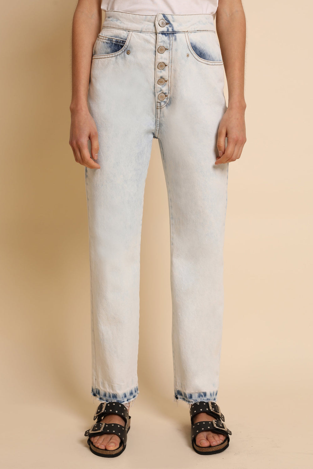 Faded denim trousers made of 100% cotton. Regular fit with high waist, button fastening and side and back pockets. Fringed hem.