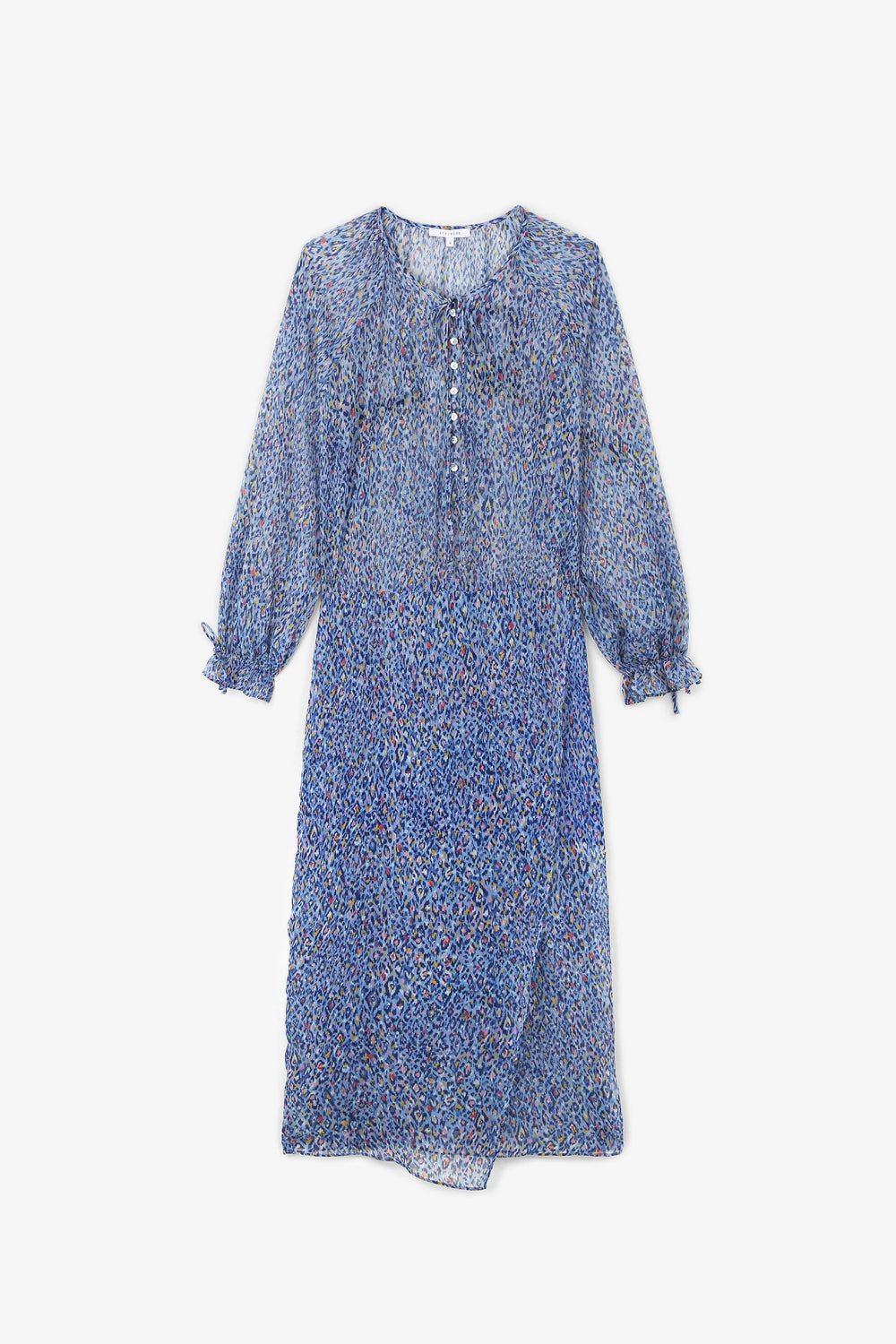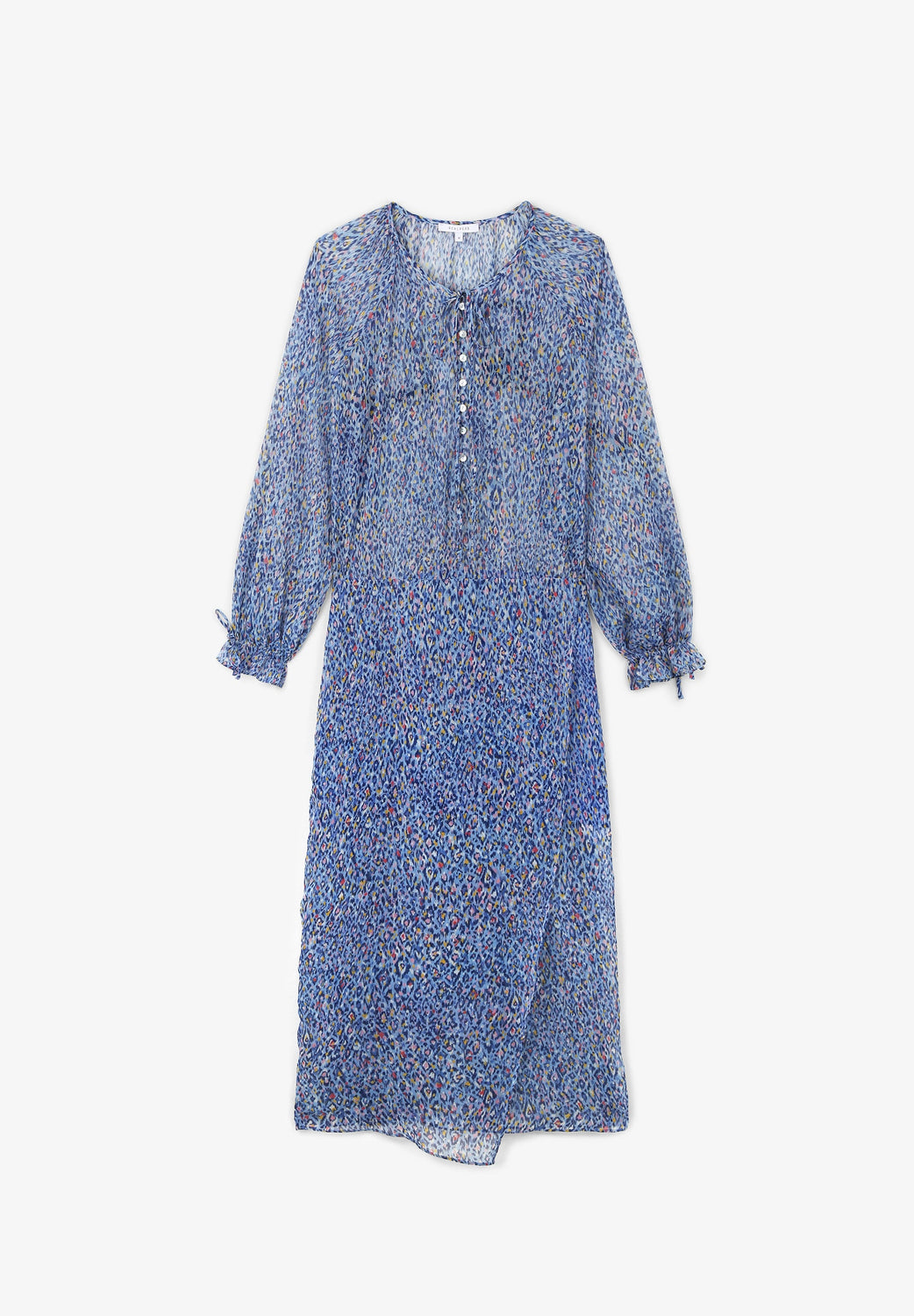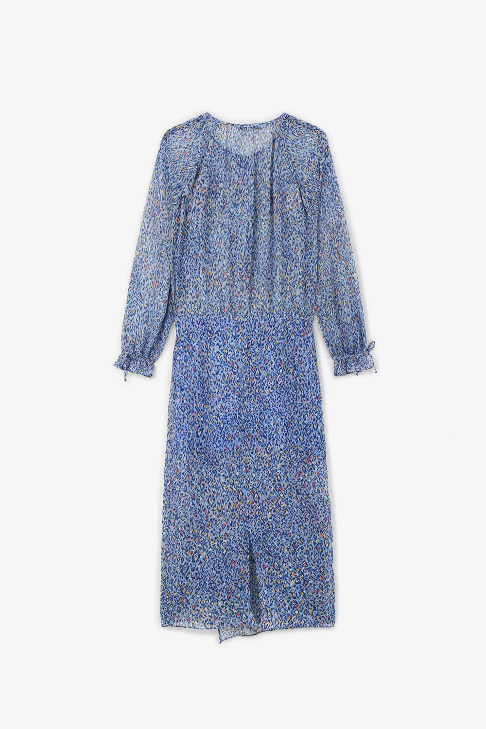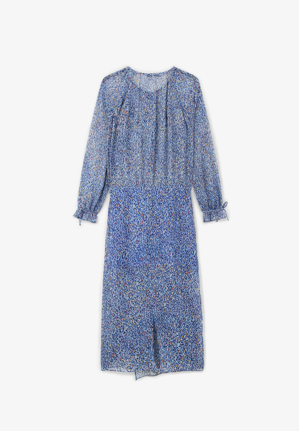Midi dress with animal print, made of flowing fabric with metallic thread. Regular fit, rounded collar and buttonhole fastening. Long cuff sleeves with bow. Sarong skirt with back opening.