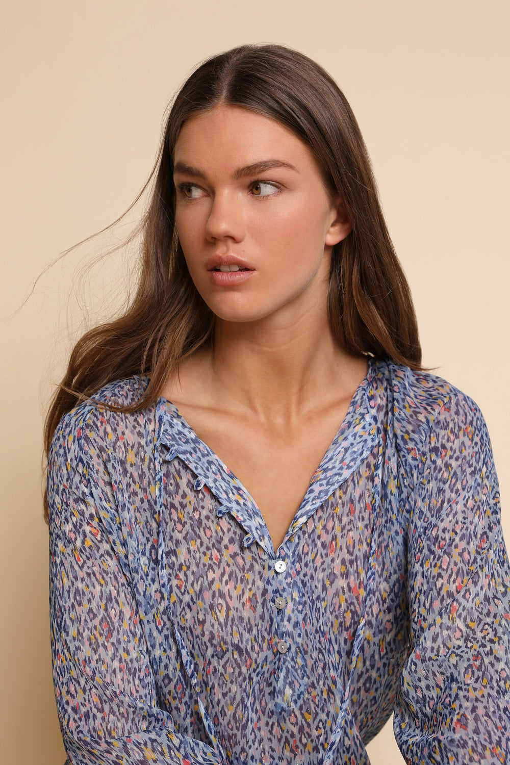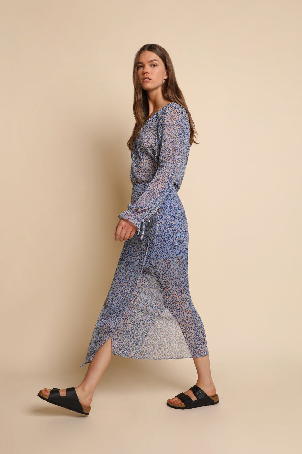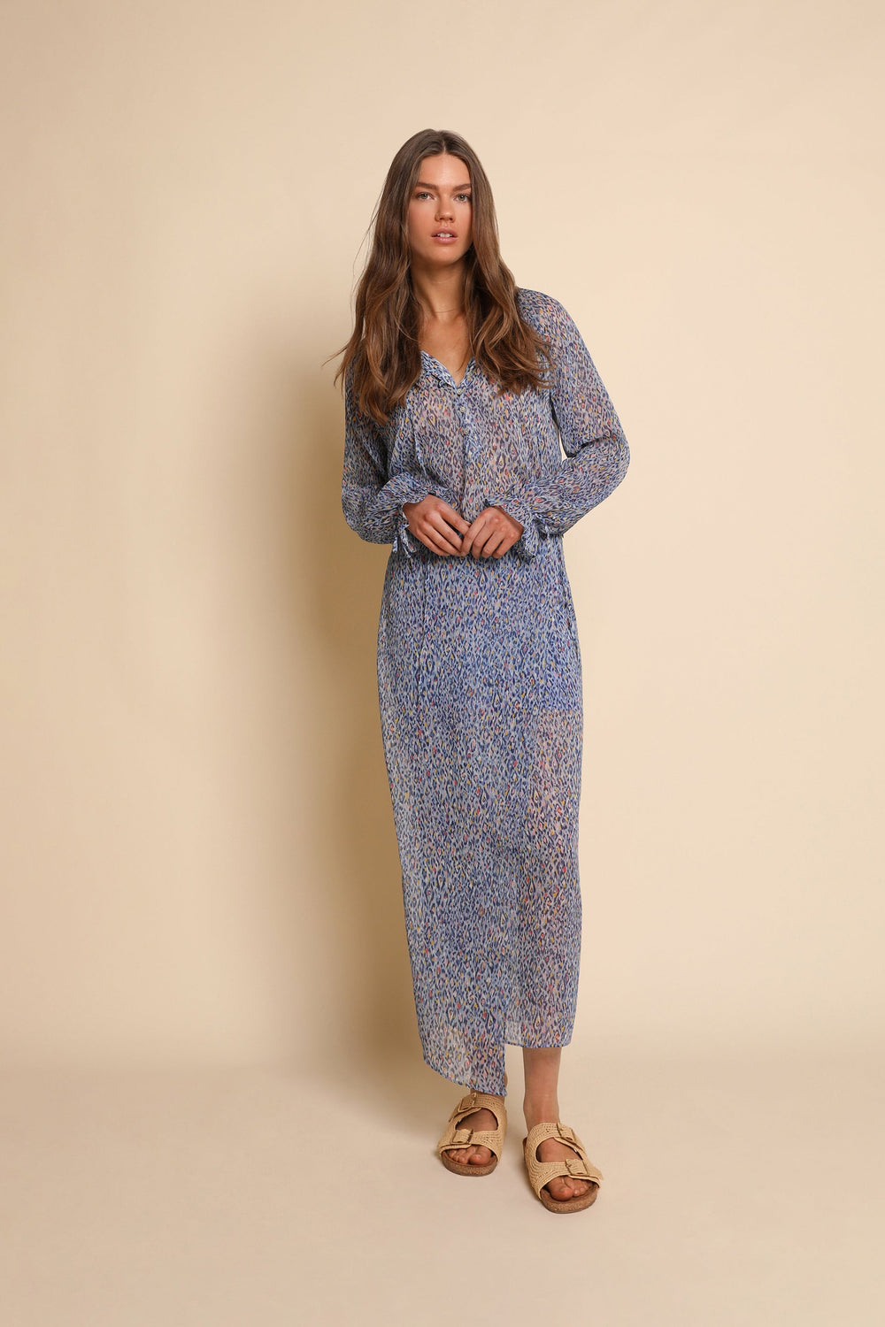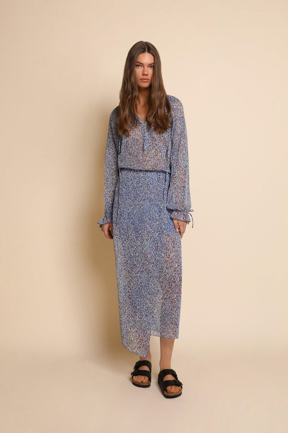 Midi dress with animal print, made of flowing fabric with metallic thread. Regular fit, rounded collar and buttonhole fastening. Long cuff sleeves with bow. Sarong skirt with back opening.