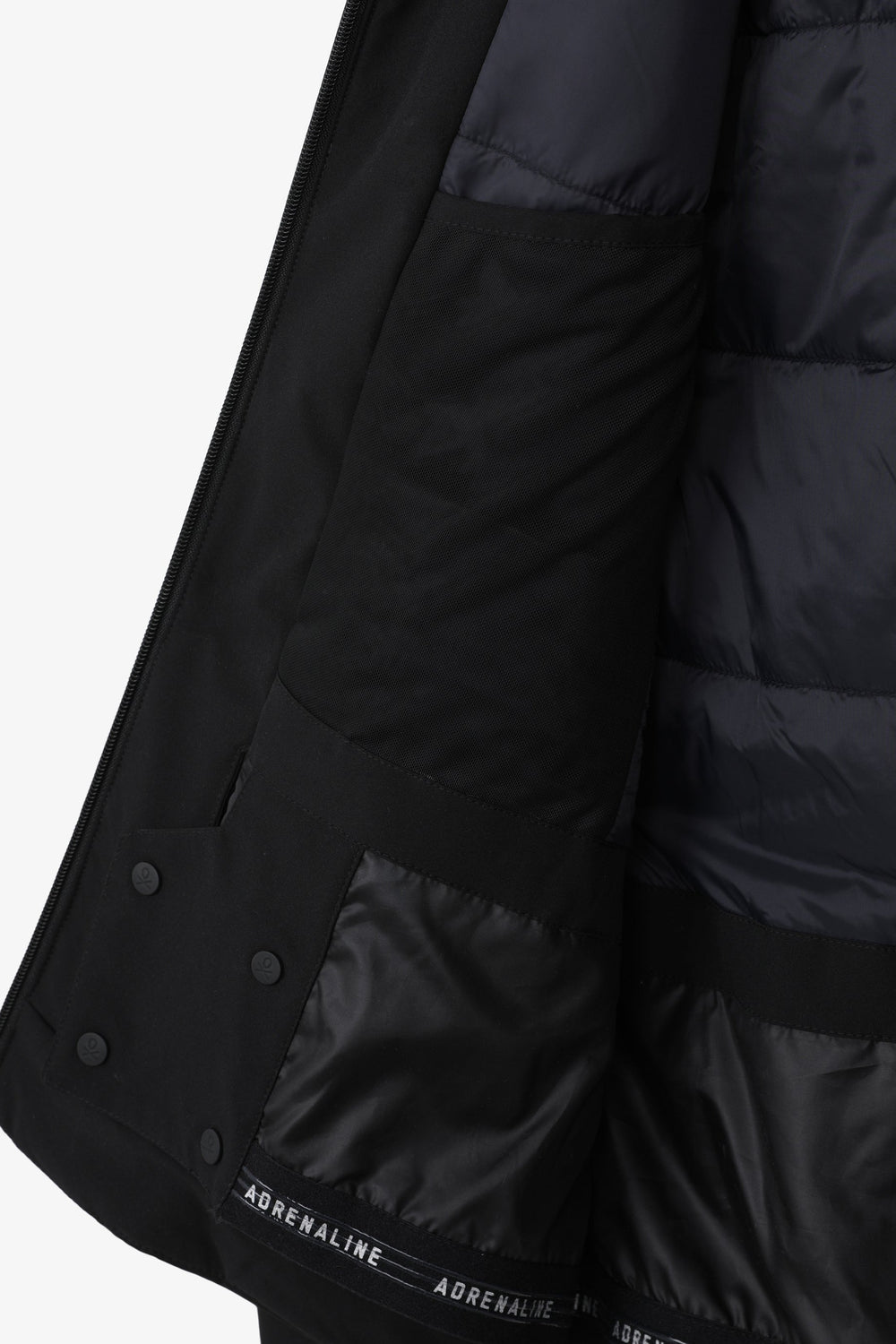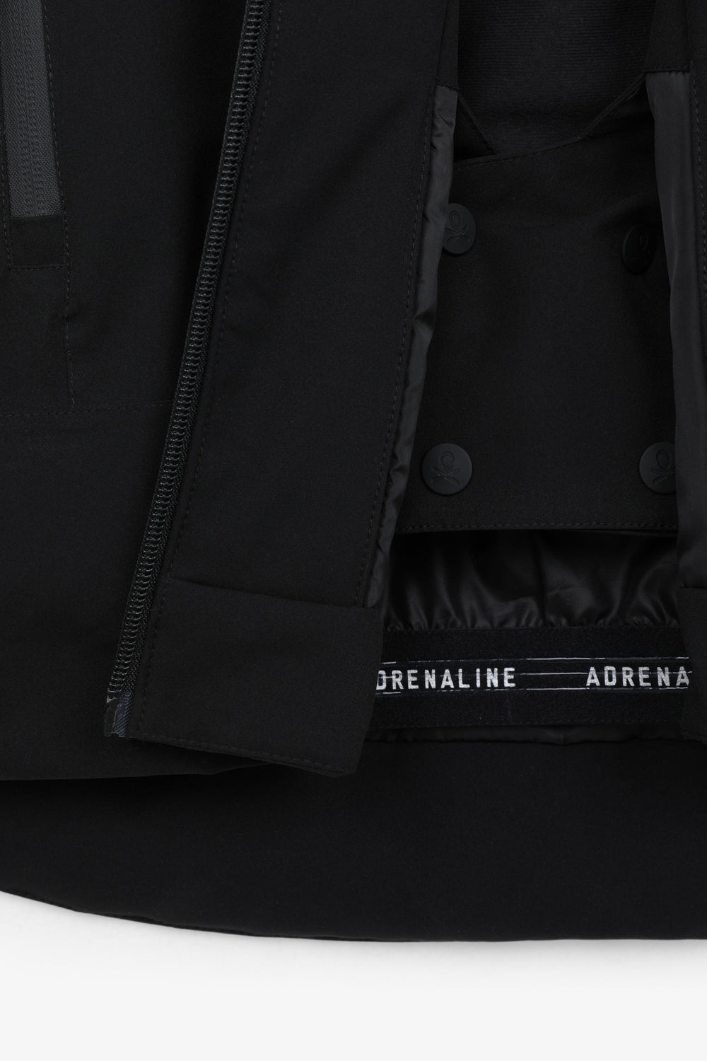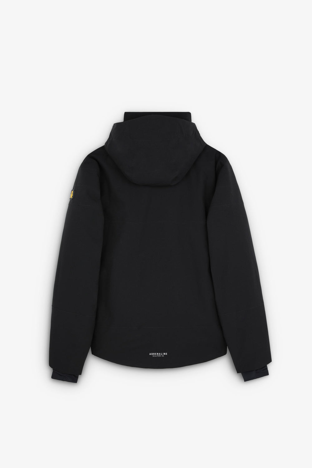 Technical ski jacket made of technical fabric with windproof and waterproof properties. Regular fit cut, stand-up collar with detachable hood with zip. Zip fastening with thermosealed zips. Panel construction and interior with microfleece panels. Long sleeves with cuffs and thumbhole to keep snow out. Inside sleeve closure with silicone elastic band and snaps. Underarm ventilation zips. Front pockets with heat-sealed zips, invisible zipped sleeve pocket and zipped inner security pocket with snow wipe and key lock, inner side pockets with mesh. Rubberised patch detail on sleeve.