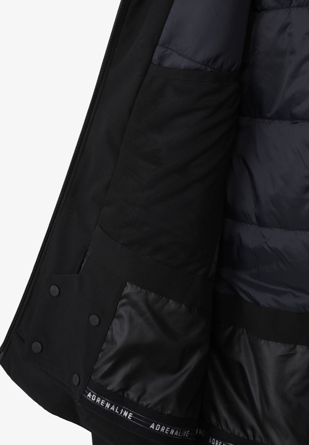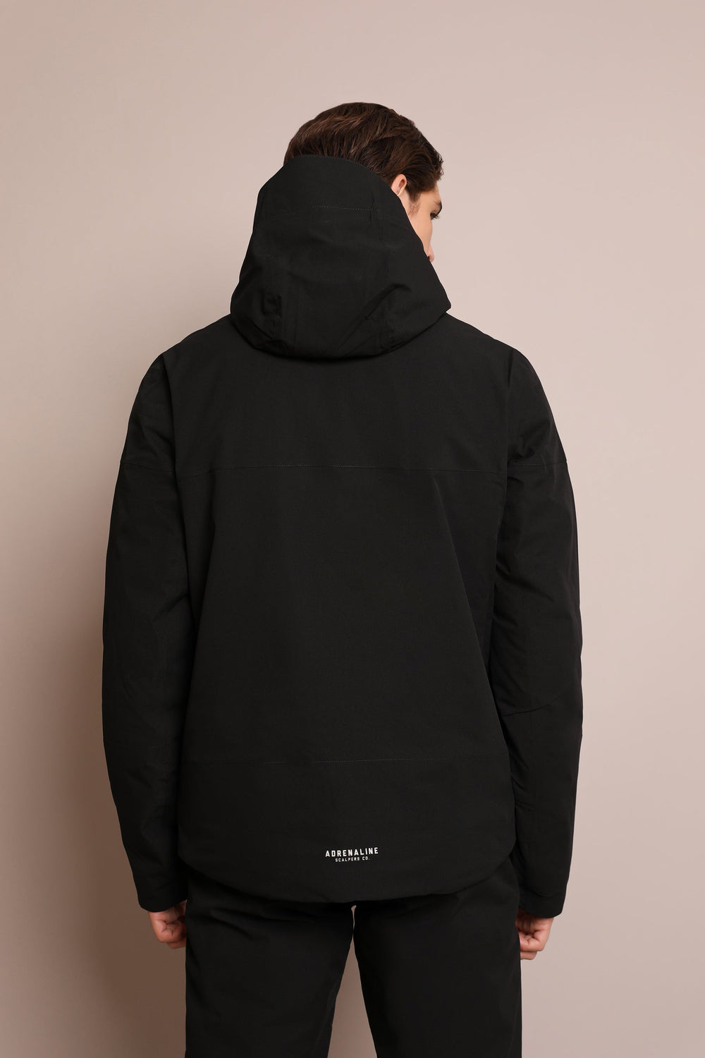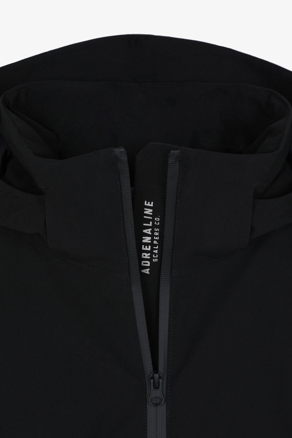 Technical ski jacket made of technical fabric with windproof and waterproof properties. Regular fit cut, stand-up collar with detachable hood with zip. Zip fastening with thermosealed zips. Panel construction and interior with microfleece panels. Long sleeves with cuffs and thumbhole to keep snow out. Inside sleeve closure with silicone elastic band and snaps. Underarm ventilation zips. Front pockets with heat-sealed zips, invisible zipped sleeve pocket and zipped inner security pocket with snow wipe and key lock, inner side pockets with mesh. Rubberised patch detail on sleeve.