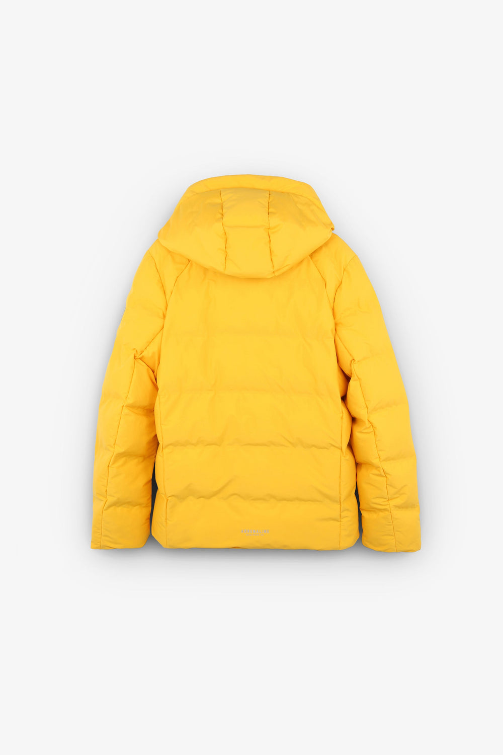 Padded technical ski jacket made of special technical fabric with windproof and waterproof properties. Regular fit cut, hooded collar with zip-fastening hood. Zip fastening. Thermo-sealed waterproof. Panel construction and heat sealed bands. Interior zipped security pocket, interior side mesh pockets, and oversized front pockets. Rubberised sleeve patch detail.