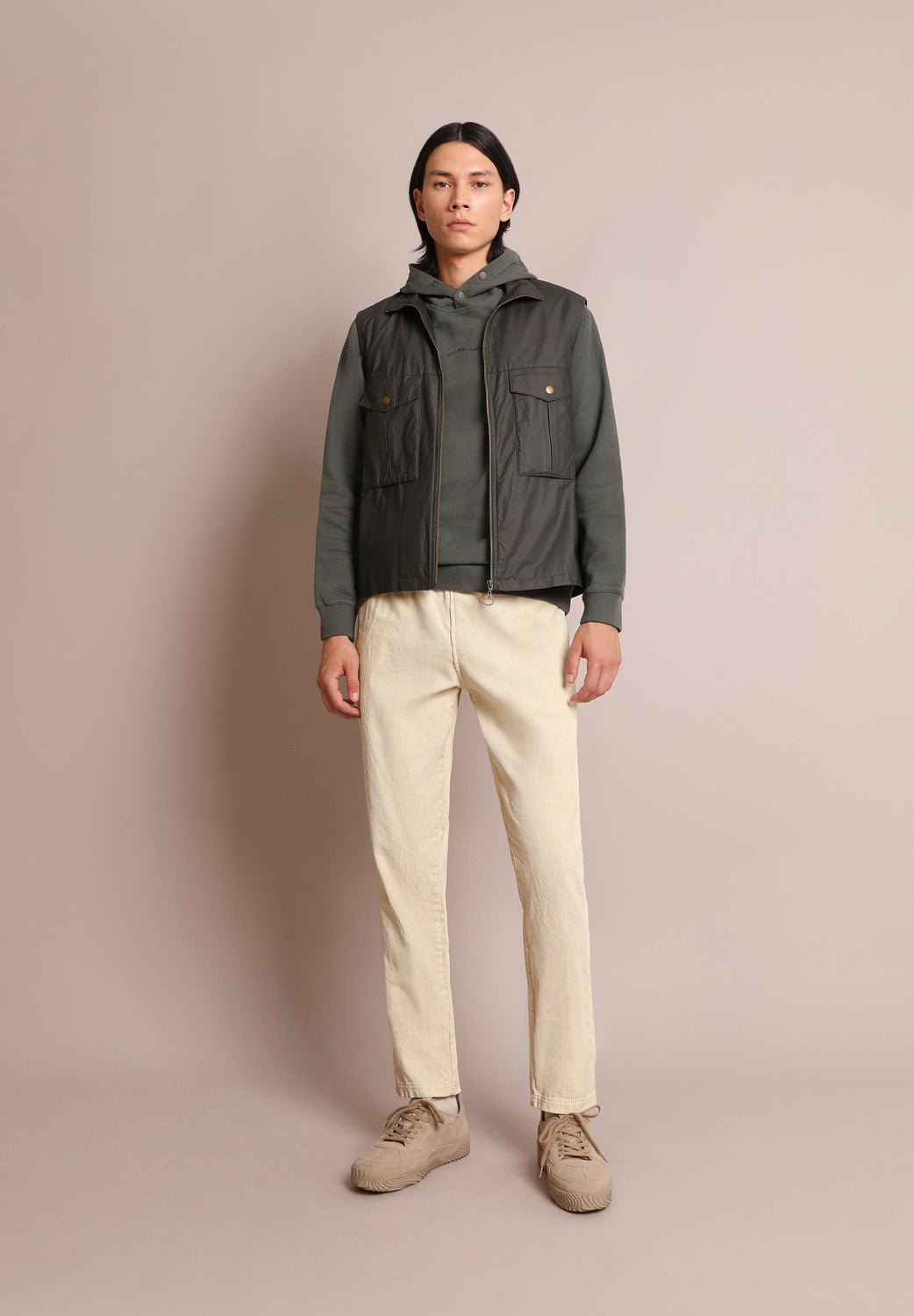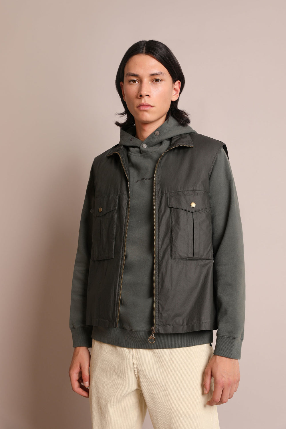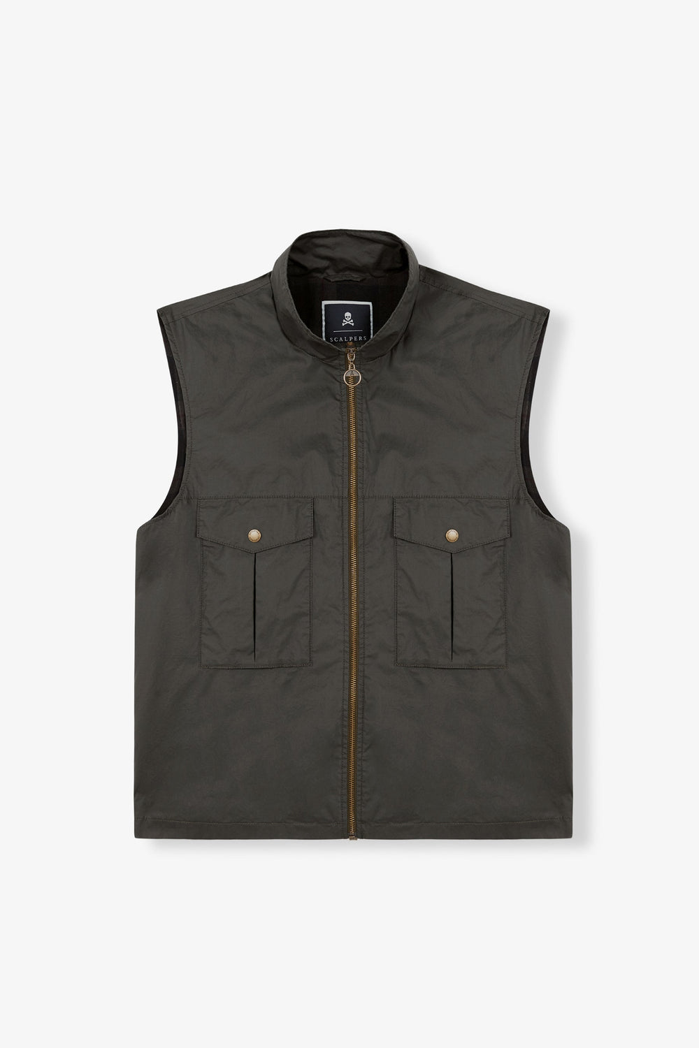 Waxed-effect gilet. Made of 100% BCI cotton, metal zip fastening, side placket pockets and check detail on the lining