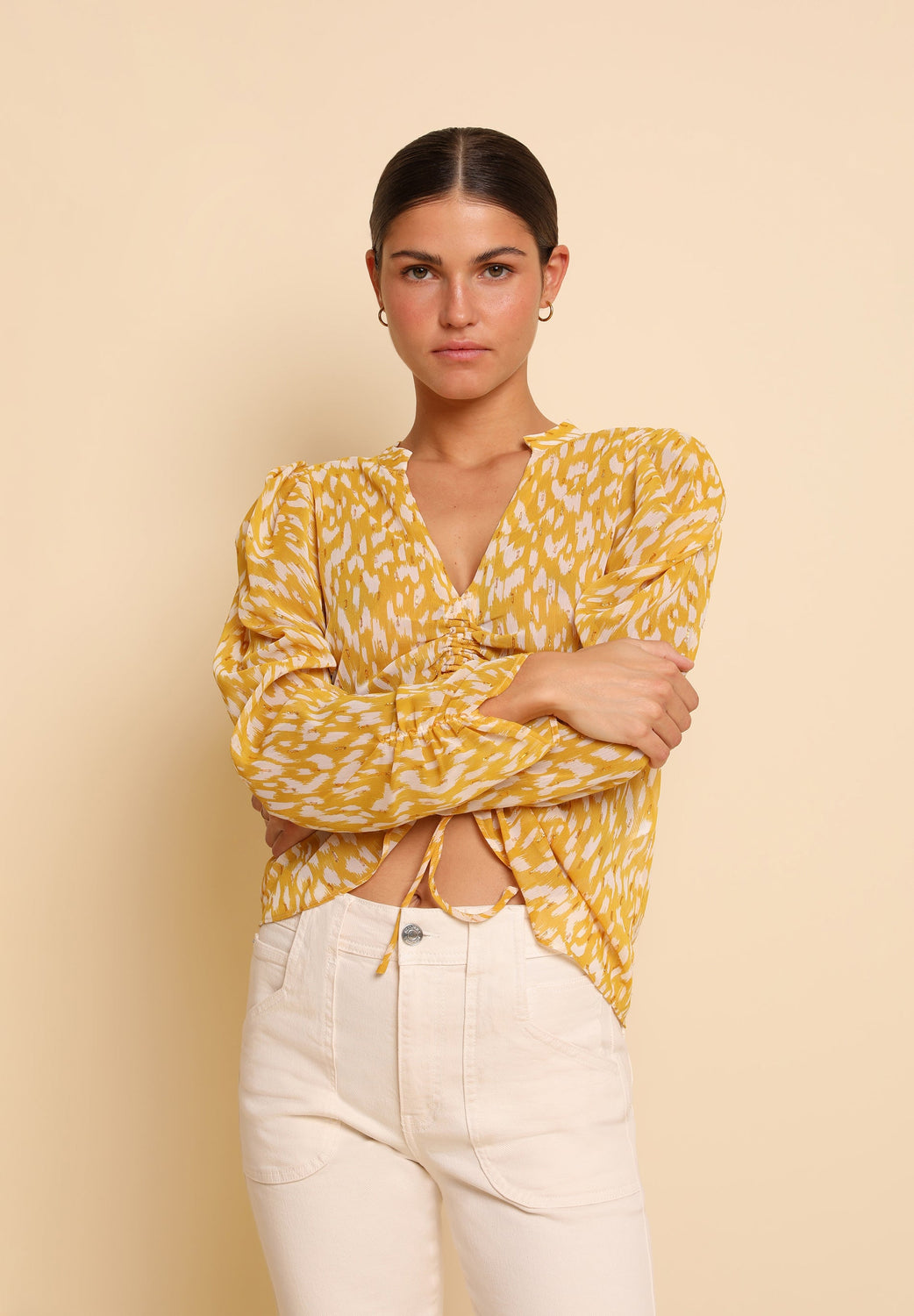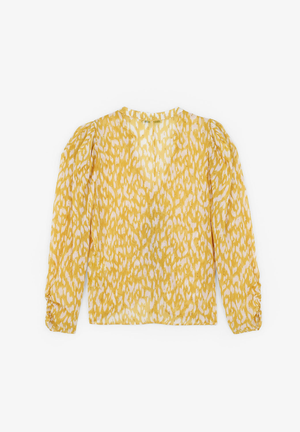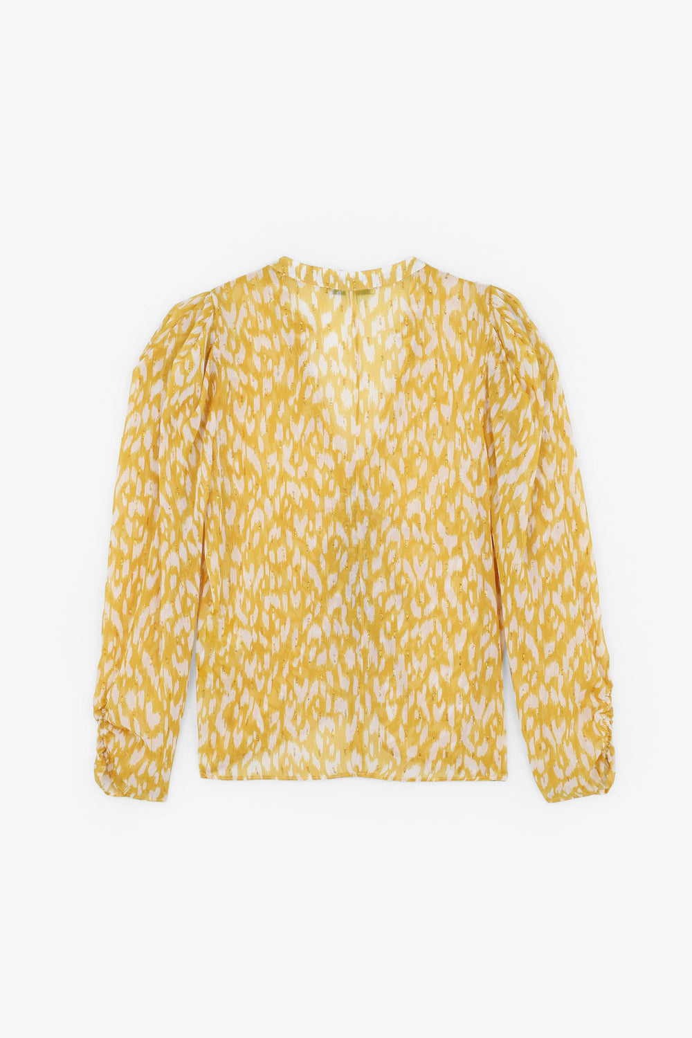 Printed blouse made of a fabric with metallic thread. Regular fit, V-neck and long puffed sleeves. Front ruched detail.
