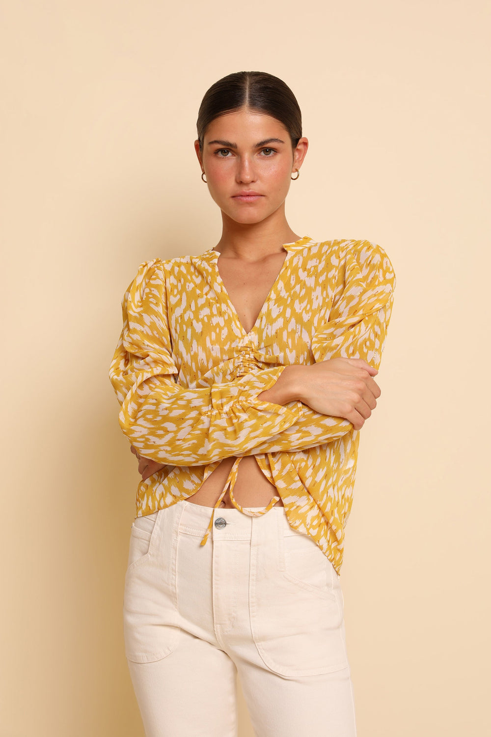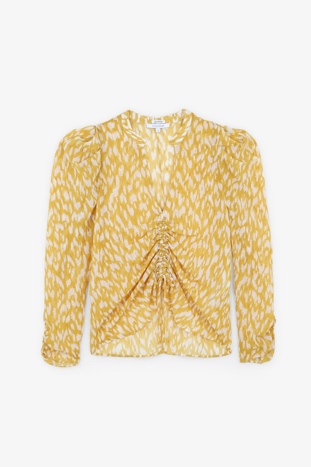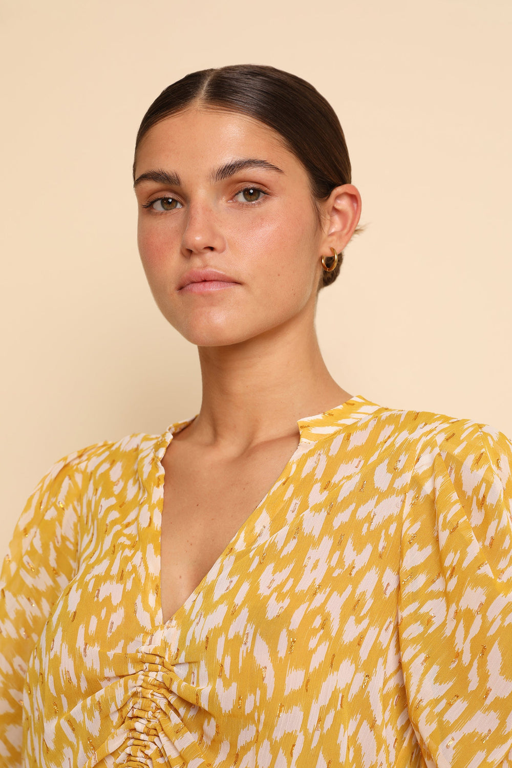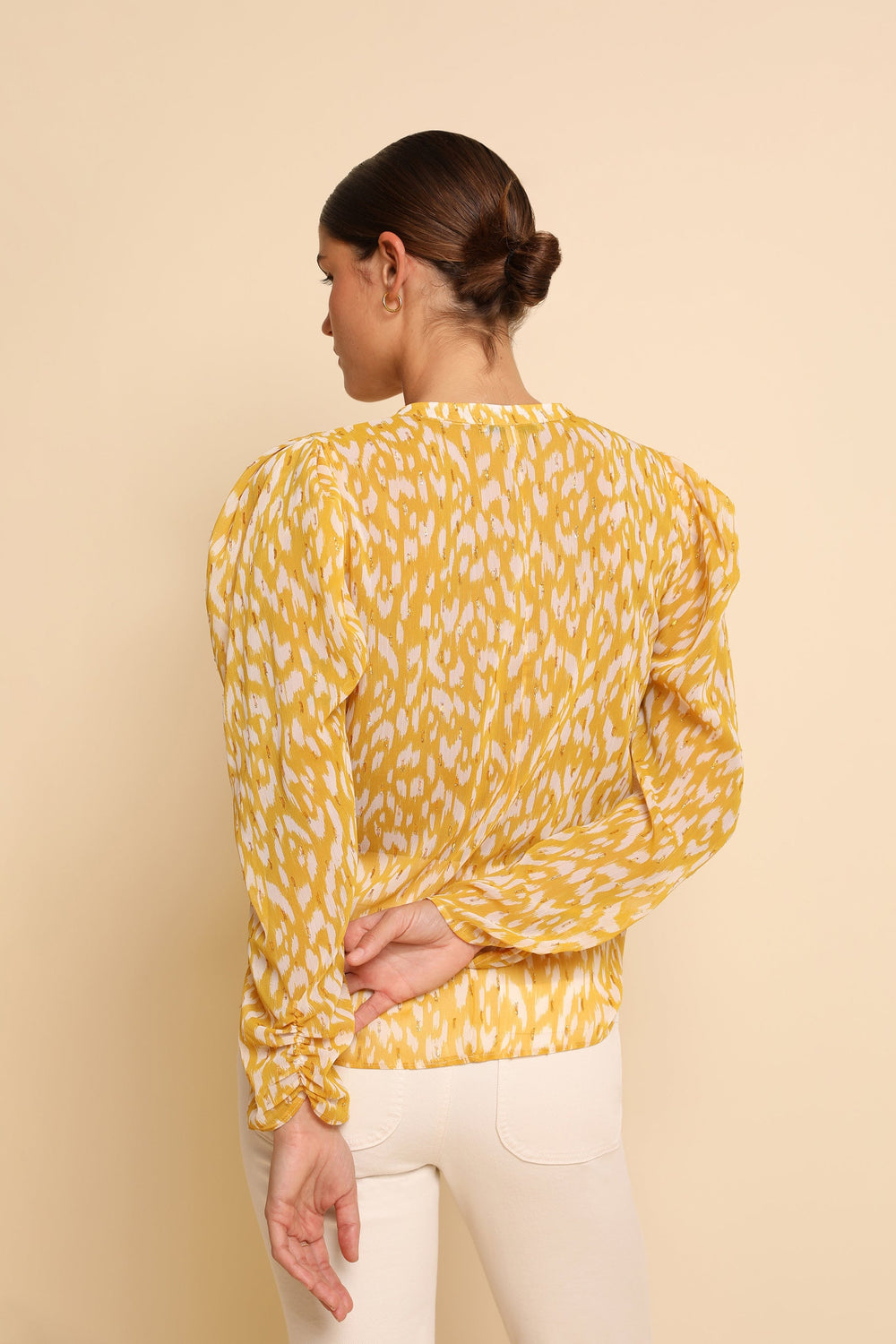 Printed blouse made of a fabric with metallic thread. Regular fit, V-neck and long puffed sleeves. Front ruched detail.
