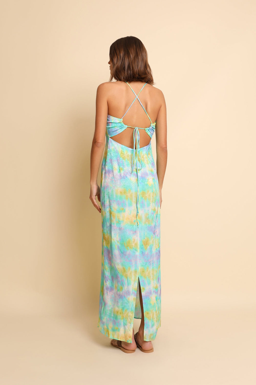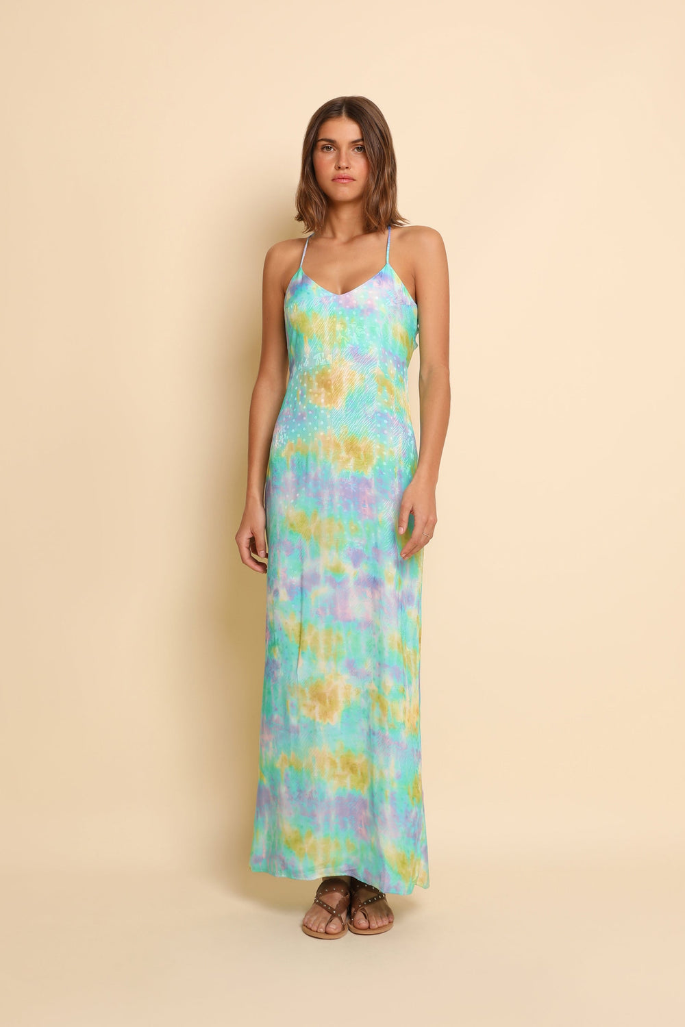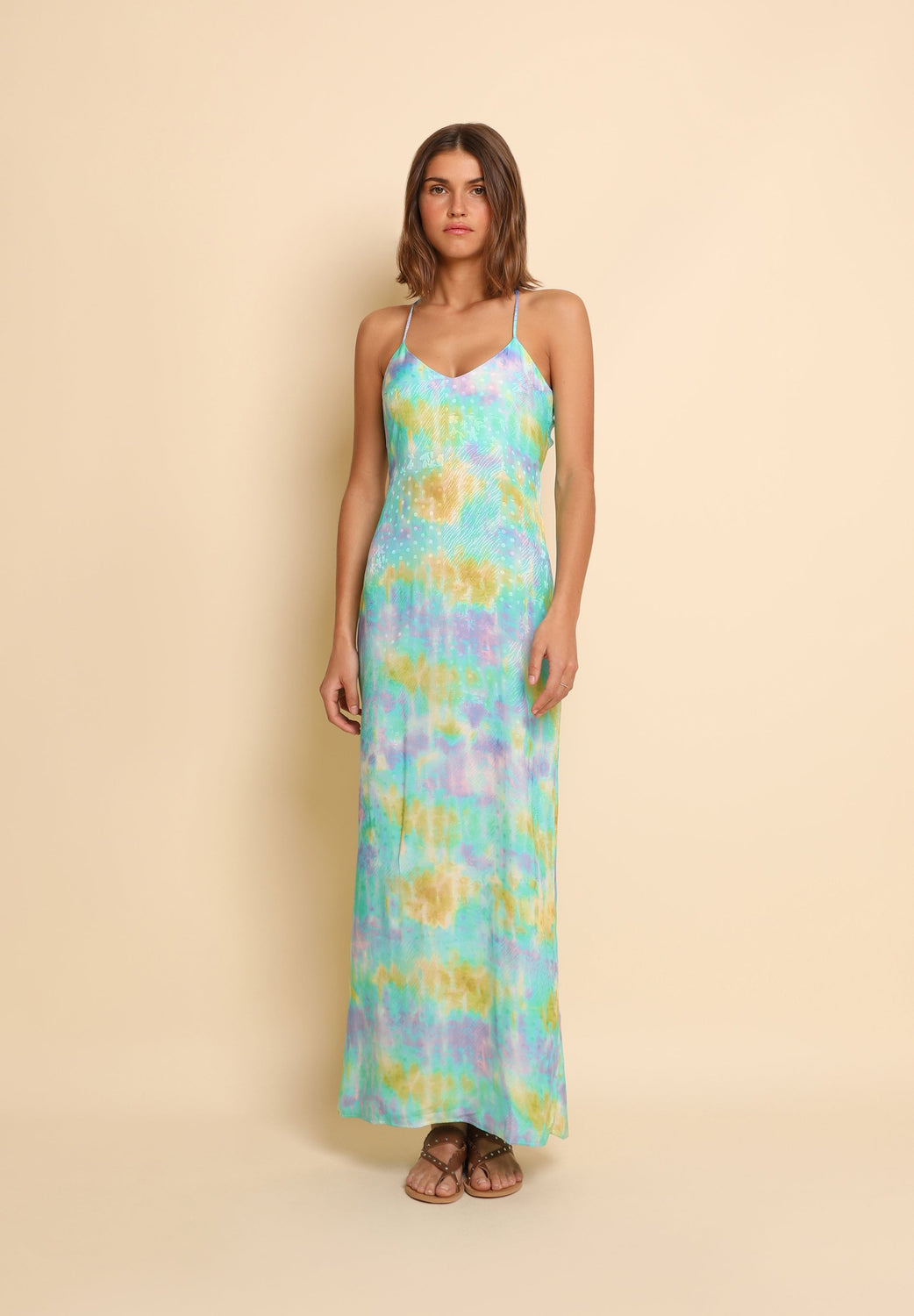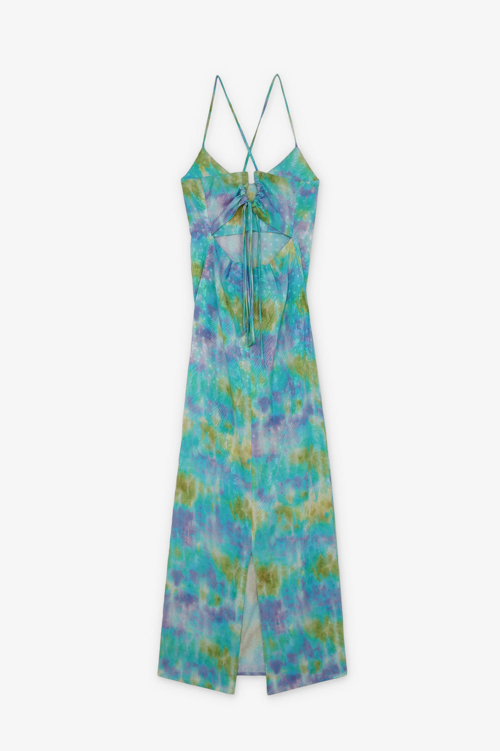 Long tie dye dress made of flowing fabric. Regular fit, V-neck and thin straps. Open back with straps and vent at the hem