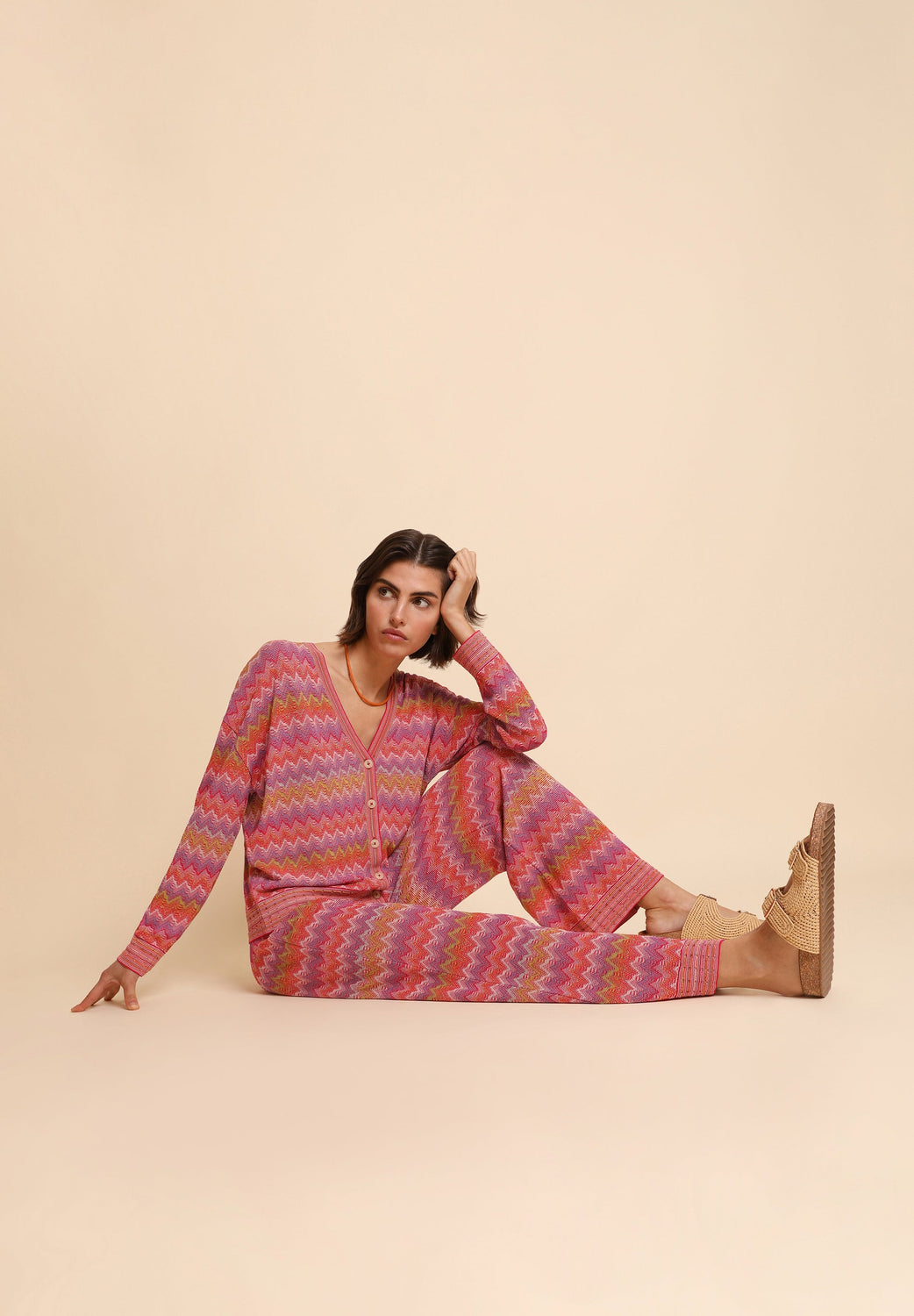 Fine knit trousers with zigzag motif. Culotte cut with elasticated waist.