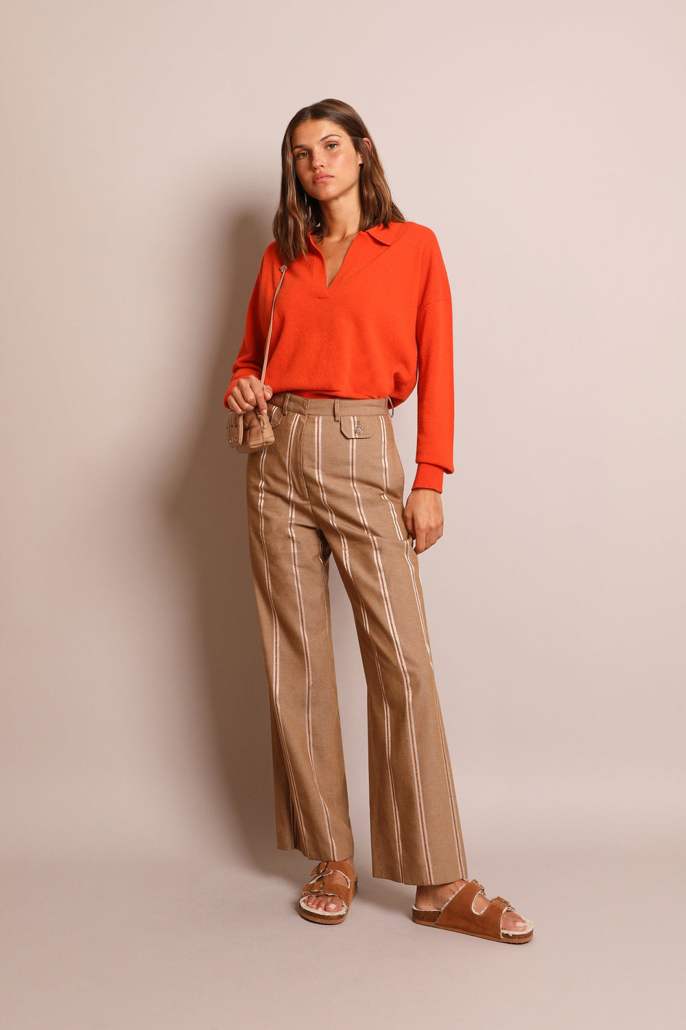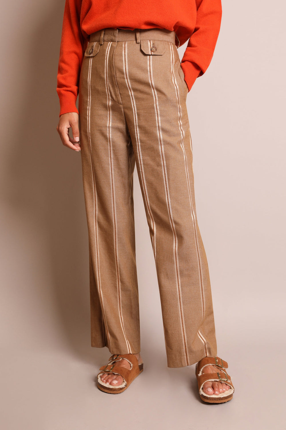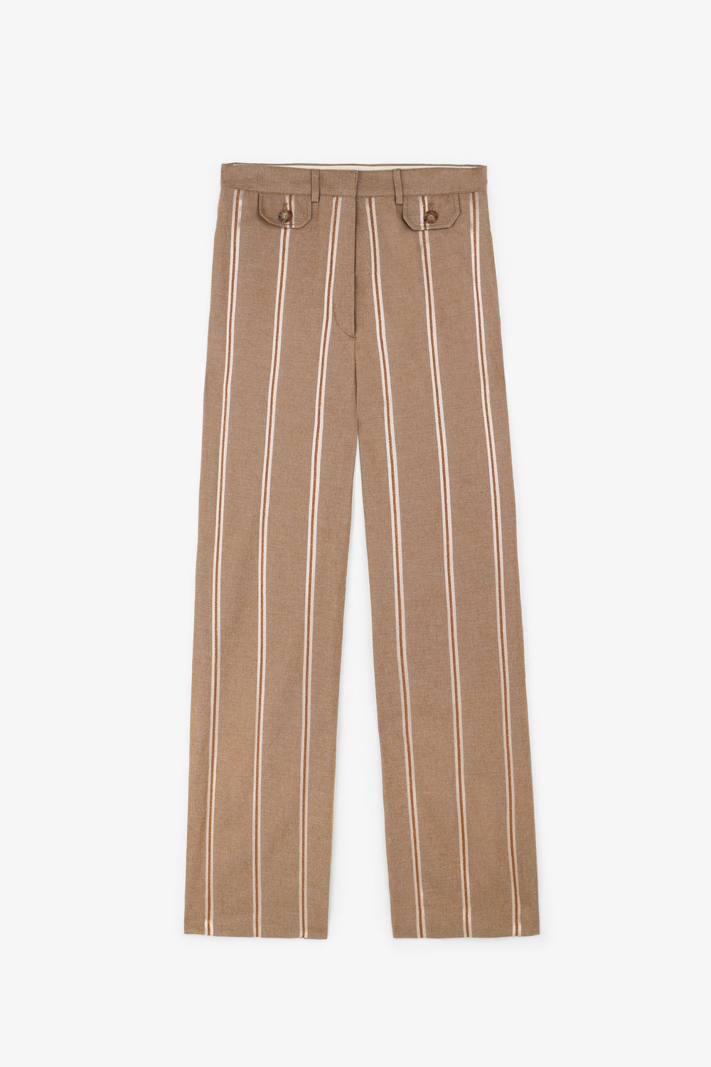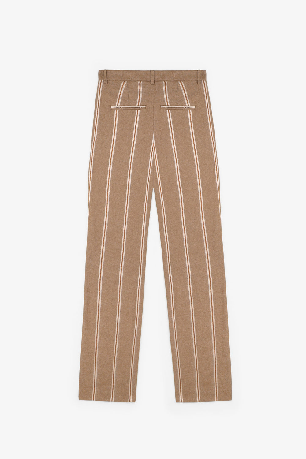 Metallic striped trousers made from a wool and linen blend fabric. Regular fit, high-rise cut, hook and zip fastening. Front and side jetted pockets with a placket and button and back jetted pockets.