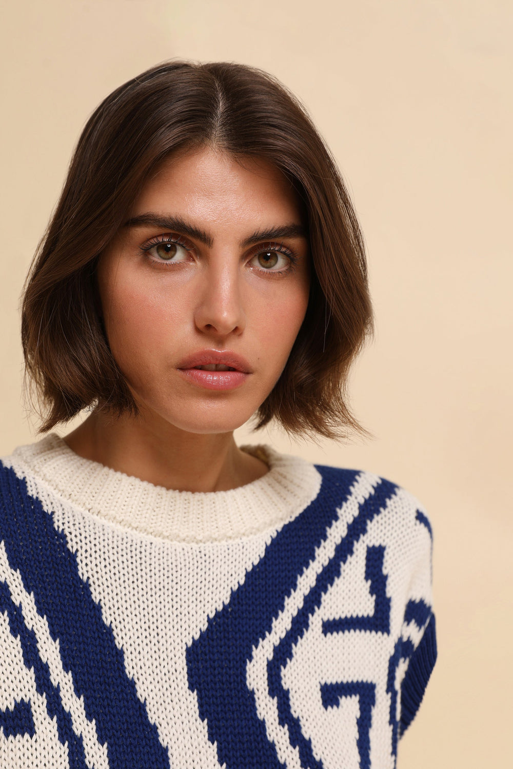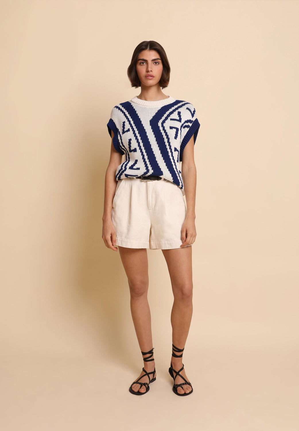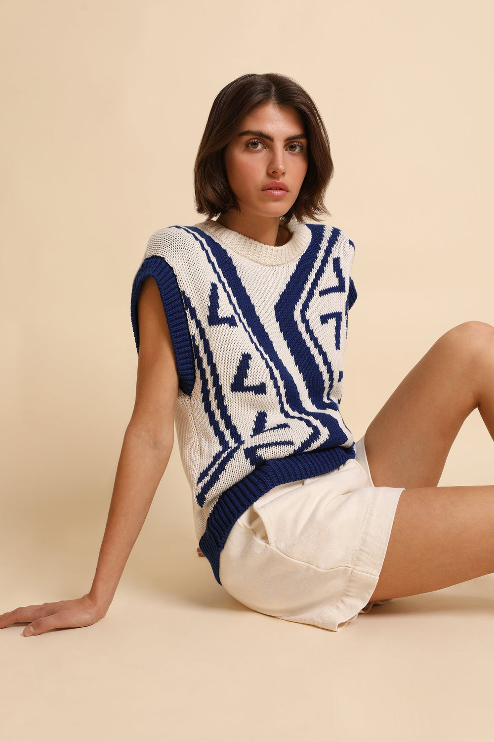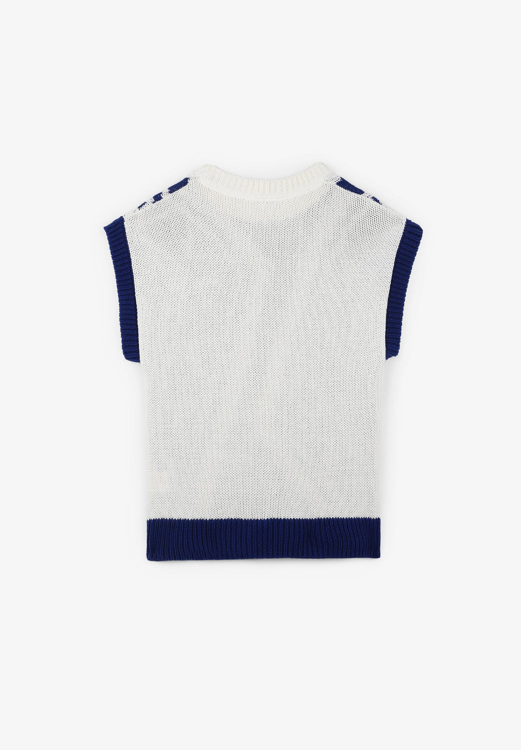 Knit vest with motif. Regular fit, round neck and sleeveless. Ribbed detail.