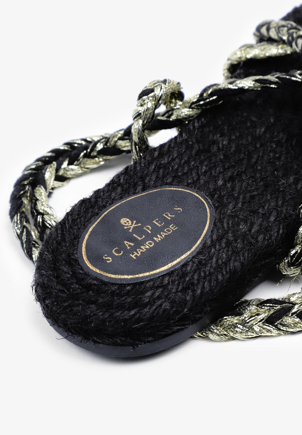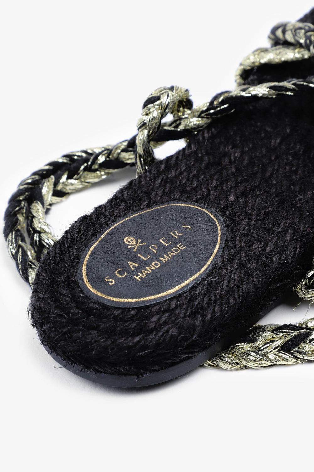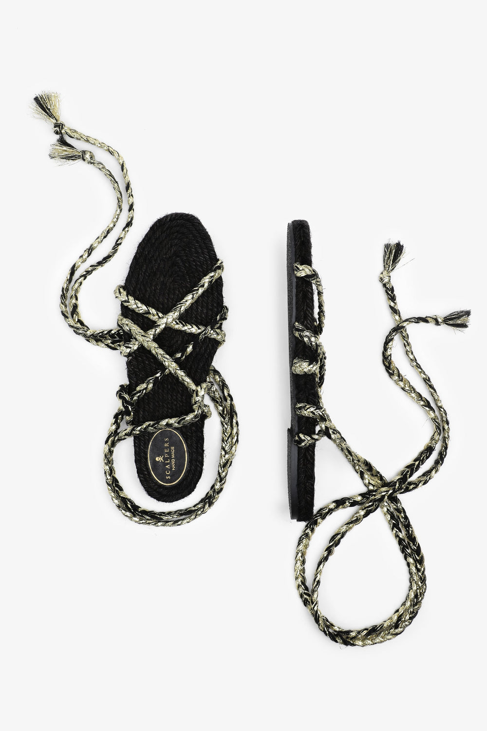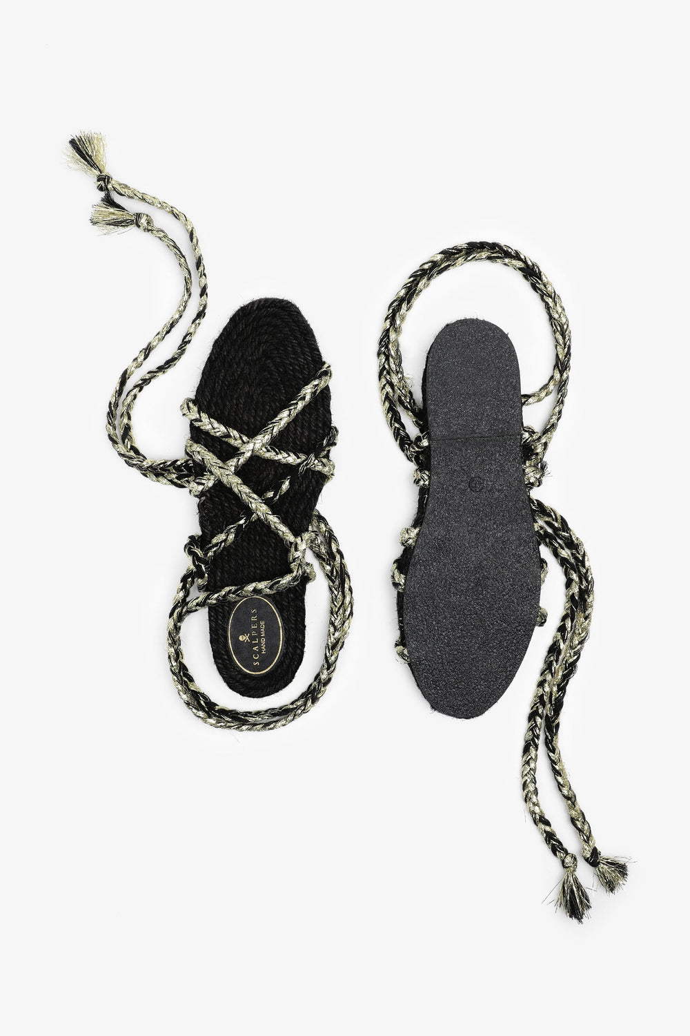 Flat sandals made with metallic nylon cords and jute insole Braided cord tie fastening and rubber sole.