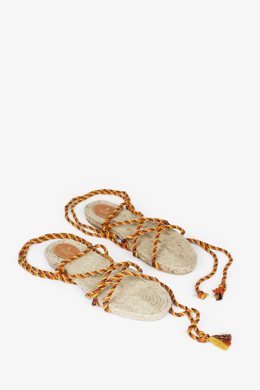 Flat sandals made with metallic nylon cords and jute insole Braided cord tie fastening and rubber sole.